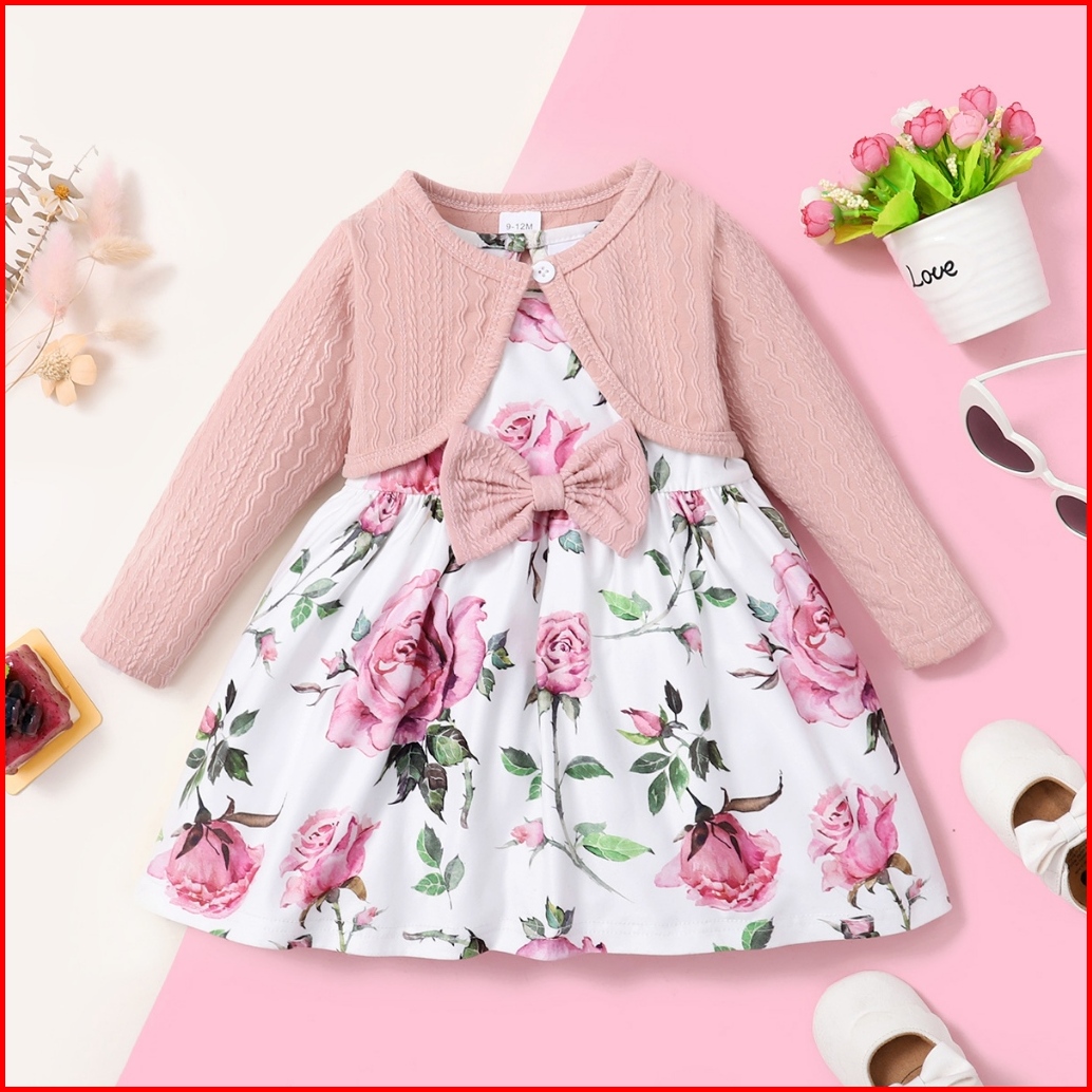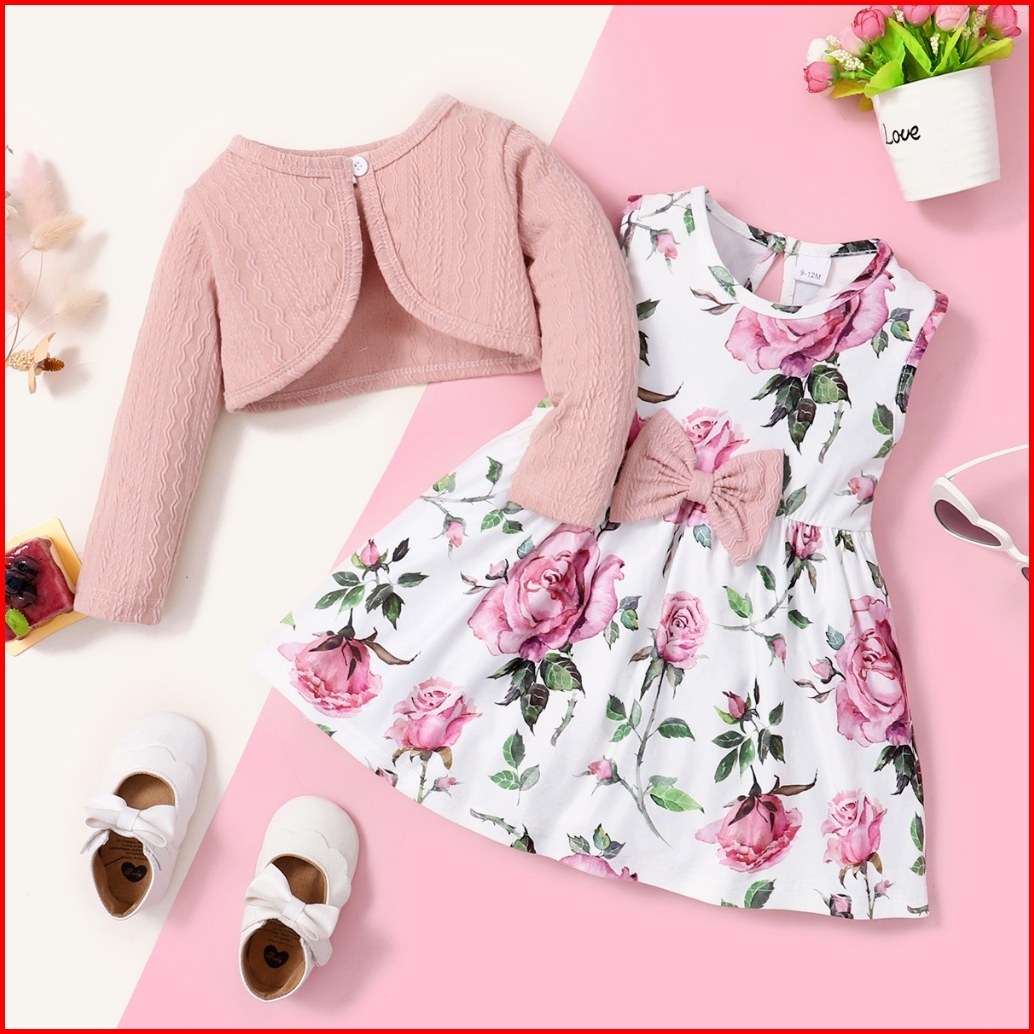 Dress For Kid Girl 0-3 Years Infant Baby Girl 2pcs Dress Set Solid Color Ribbed Overcoat With Floral Sleeveless Dress Fa