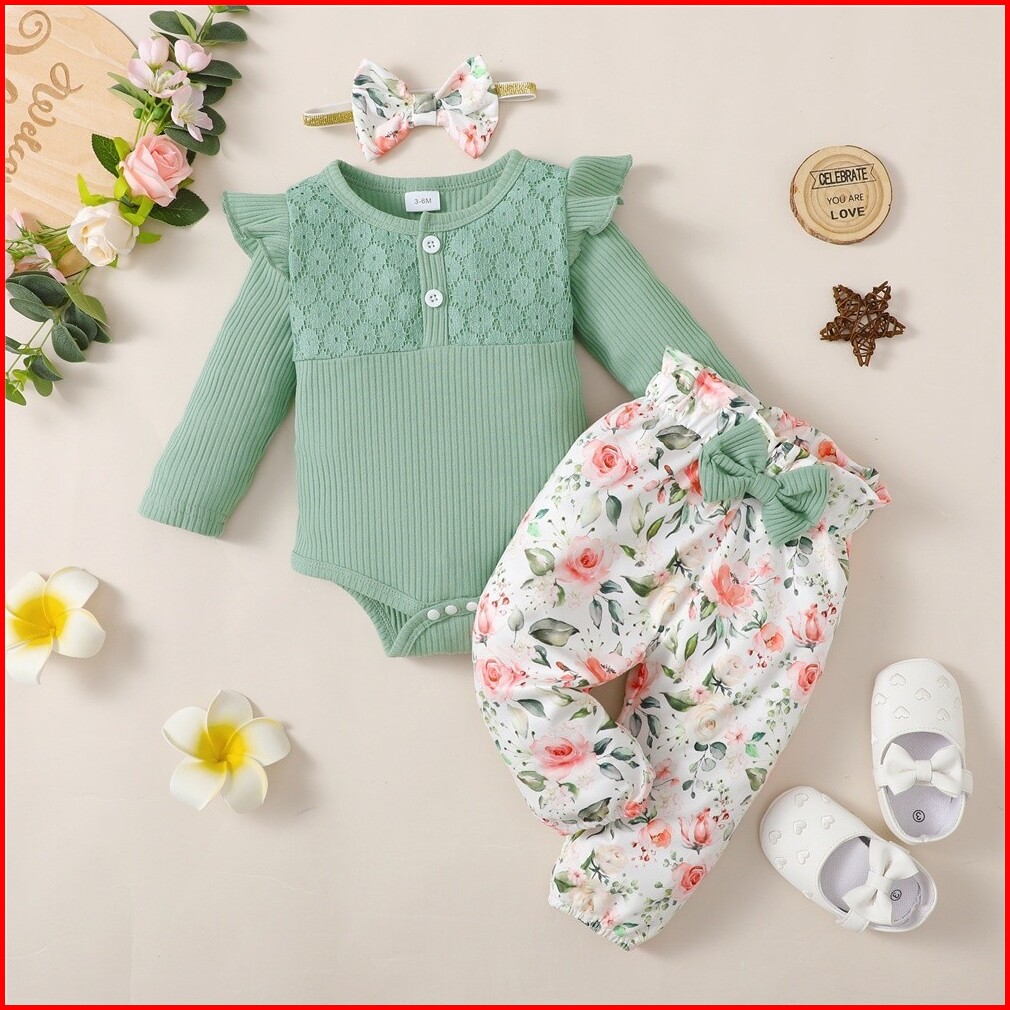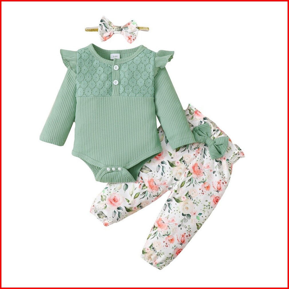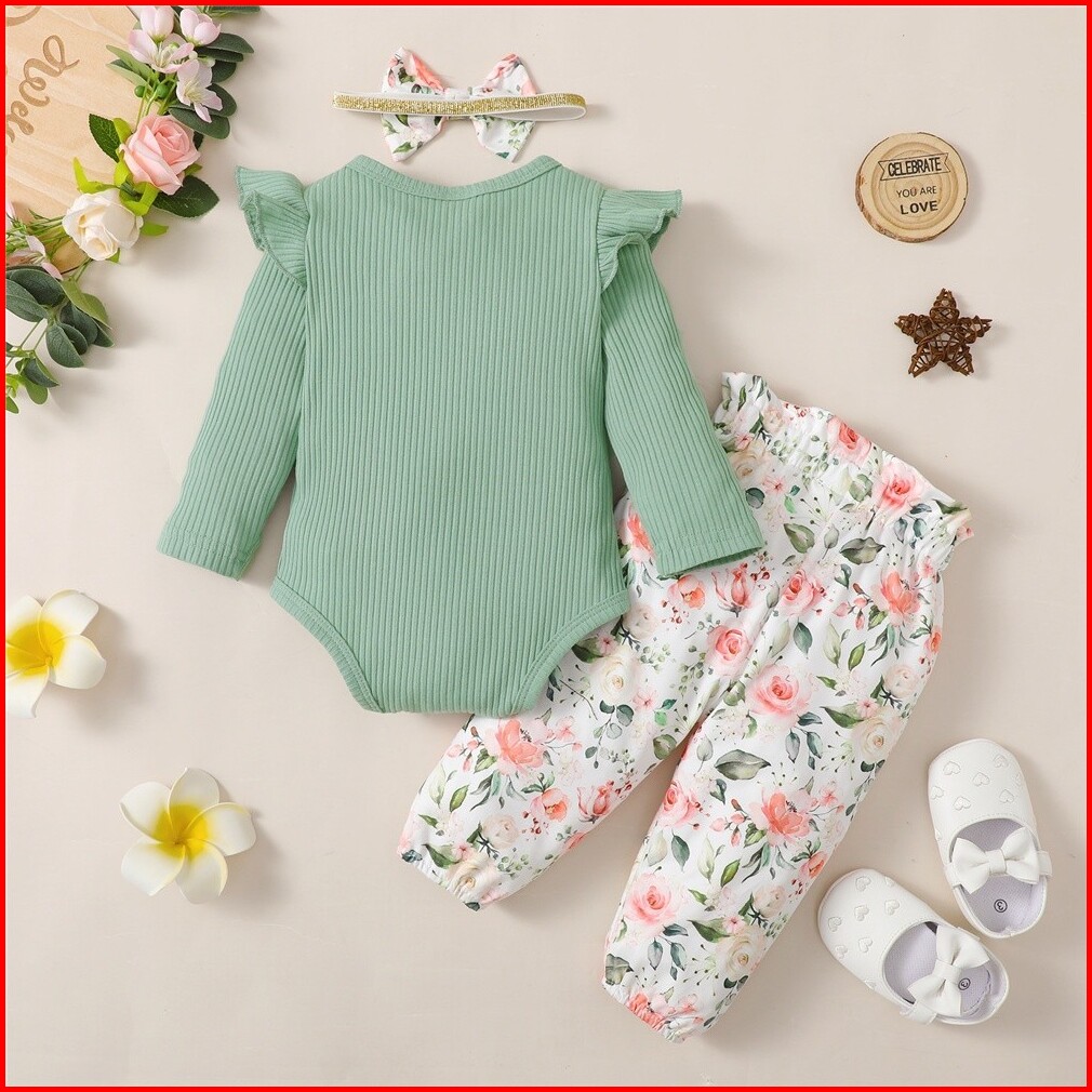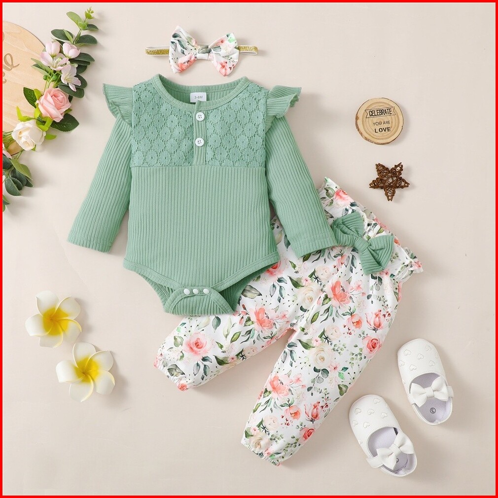 Newborn Baby Girl Daily Clothesset Plaid Long Sleeve Romper Top Flowers Pant With Headband Spring Lovely 3pcs Outfit