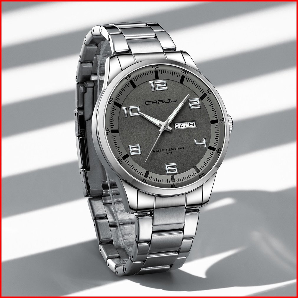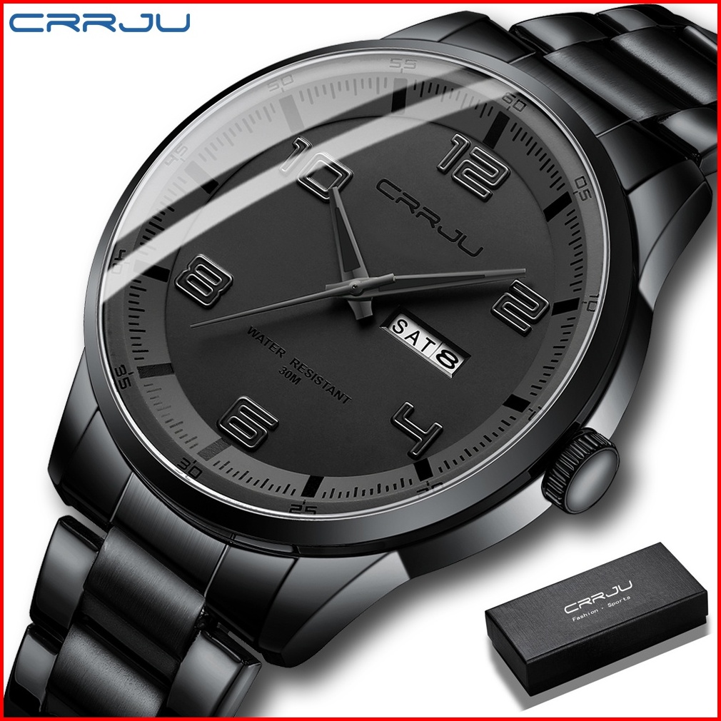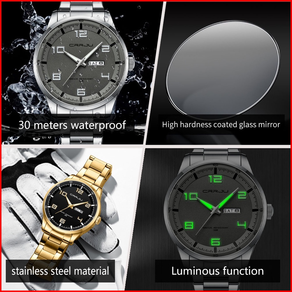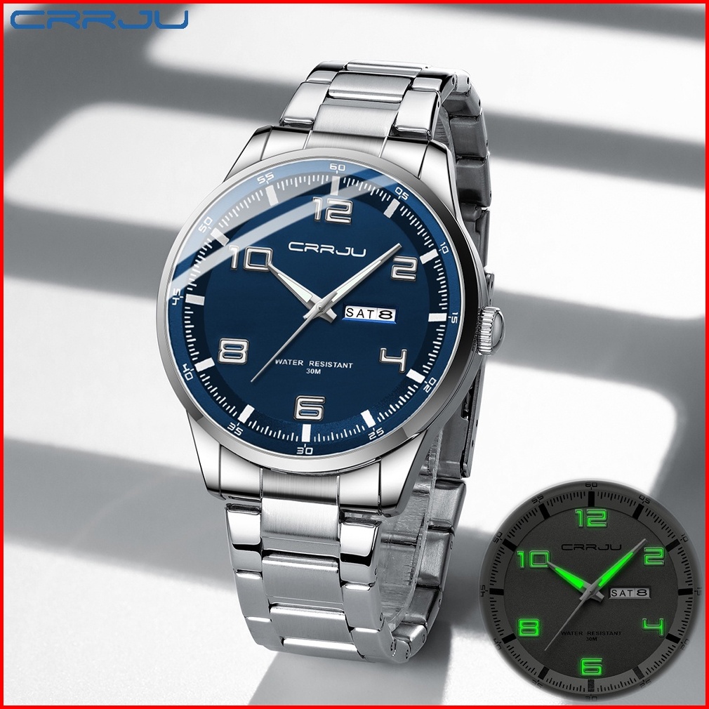 Crrju Jam Tangan Pria Original Anti Air Tahan Sport Analog Multi-fungsi Lampu Siang Hari Stainless Steel Watch Men