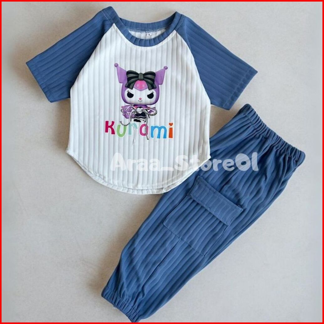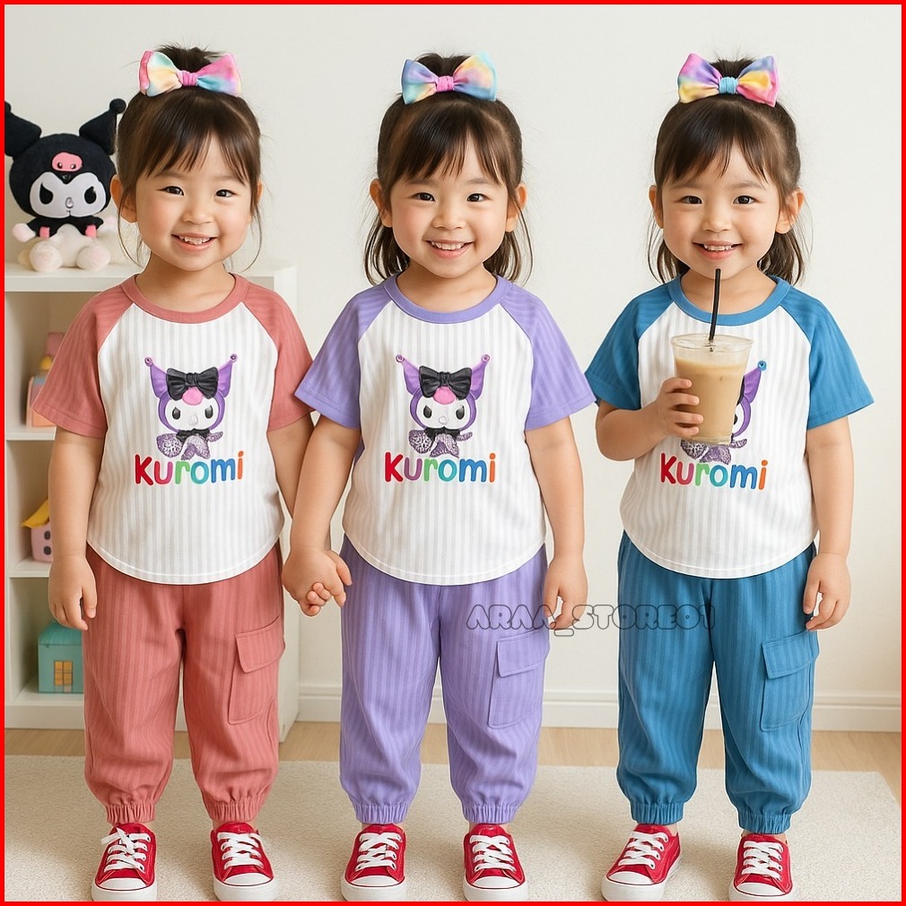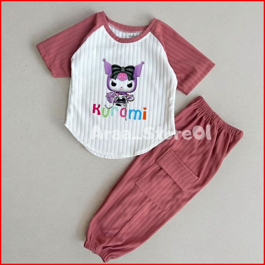 Setelan Kuromi Anak Perempuan Celana Joger Cargo Bahan Knitt Premium 3-12 Tahun Baju