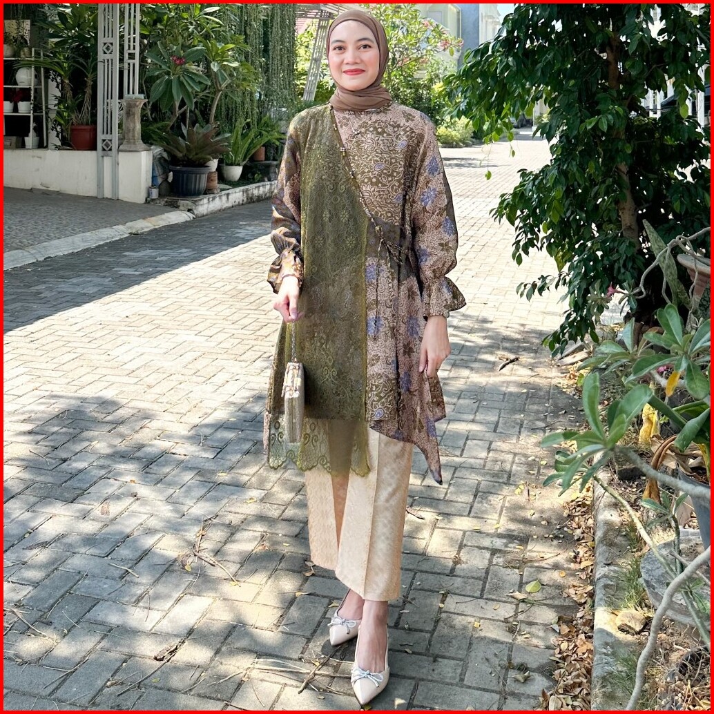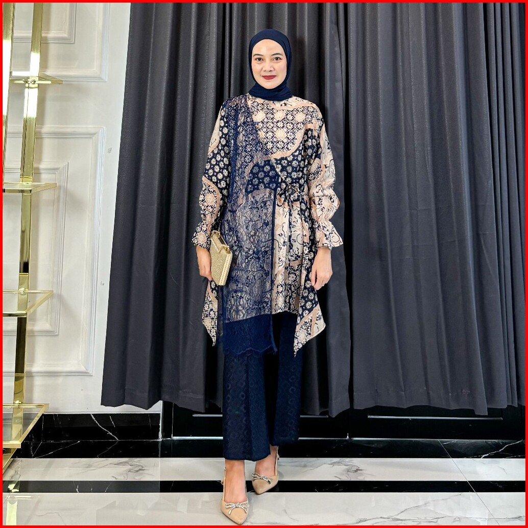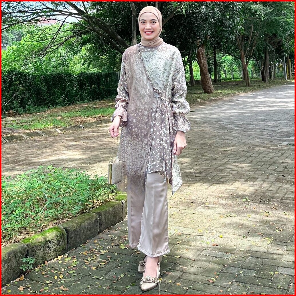Nadine Set Kimono Chantilly Lace Blouse Tunik Dan Celana Batik Modern Viscose Kondangan