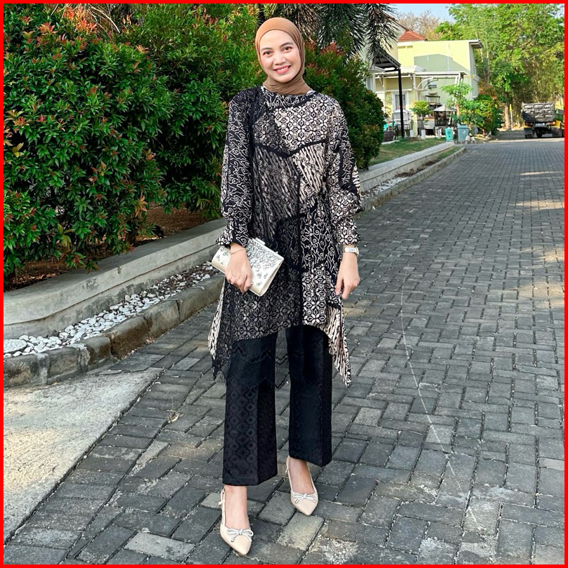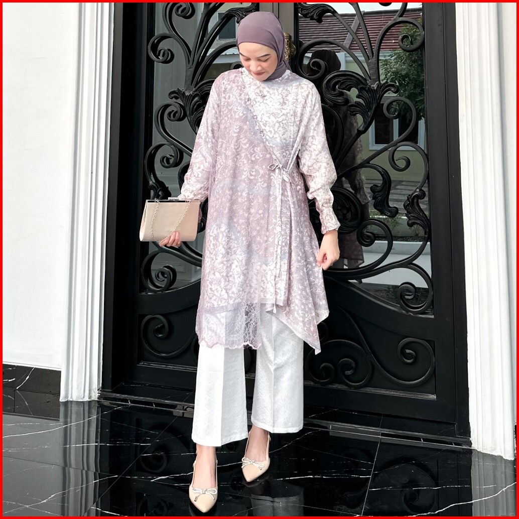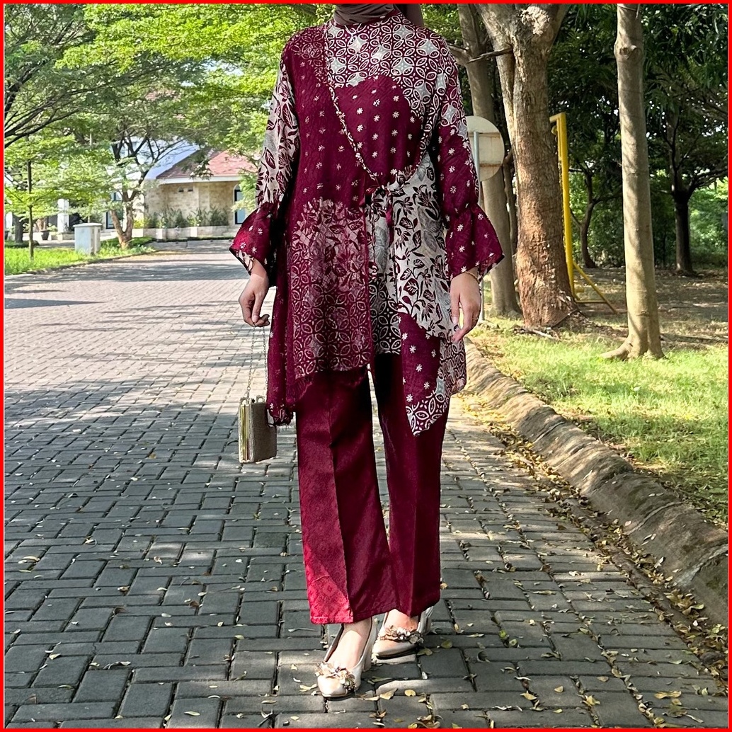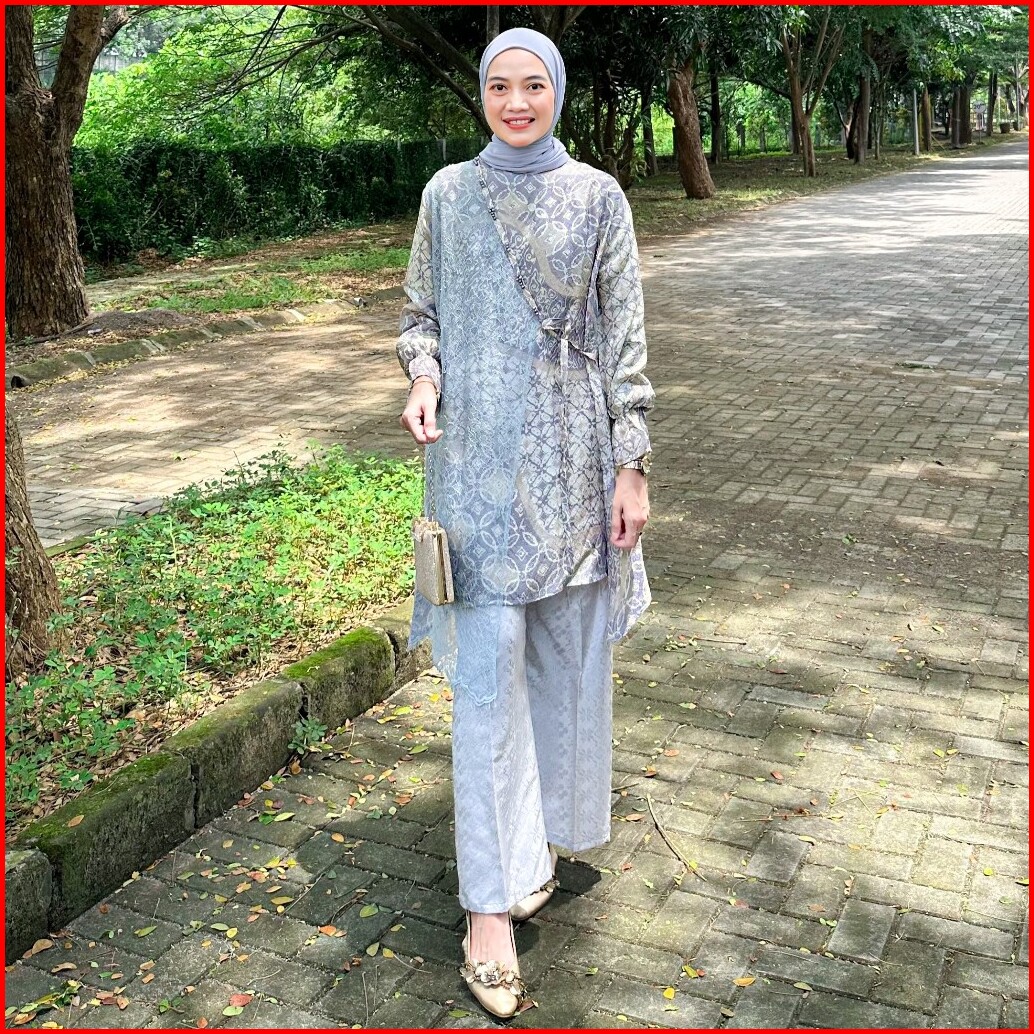 Nadine Set Kimono Chantilly Lace Blouse Tunik Dan Celana Batik Modern Viscose Kondangan