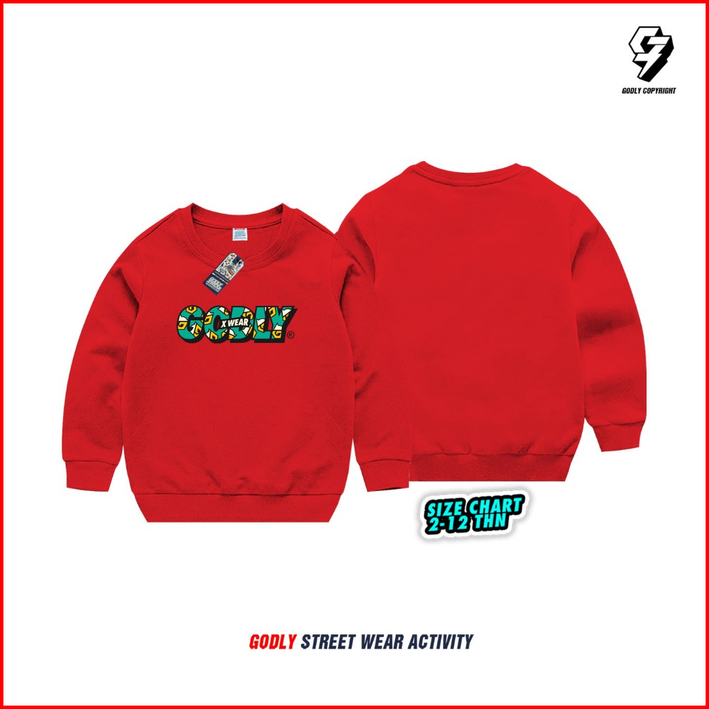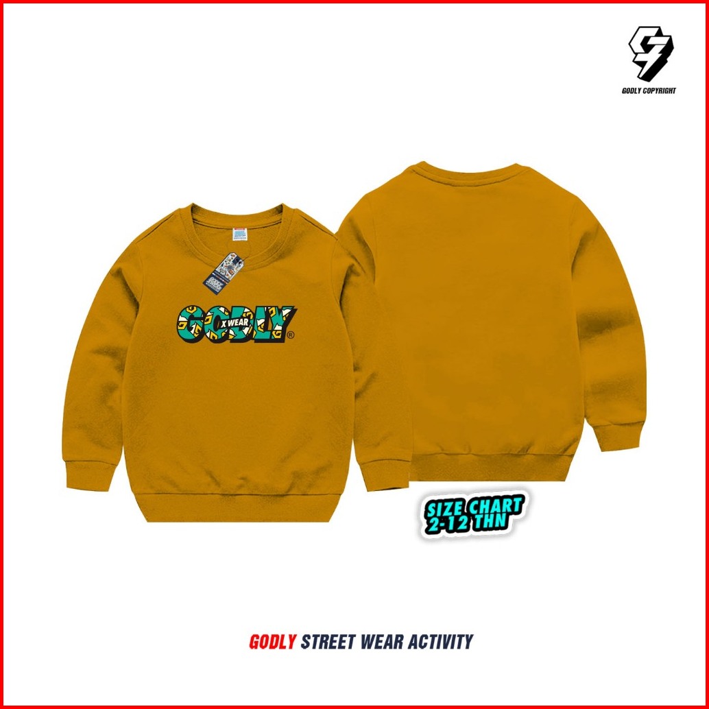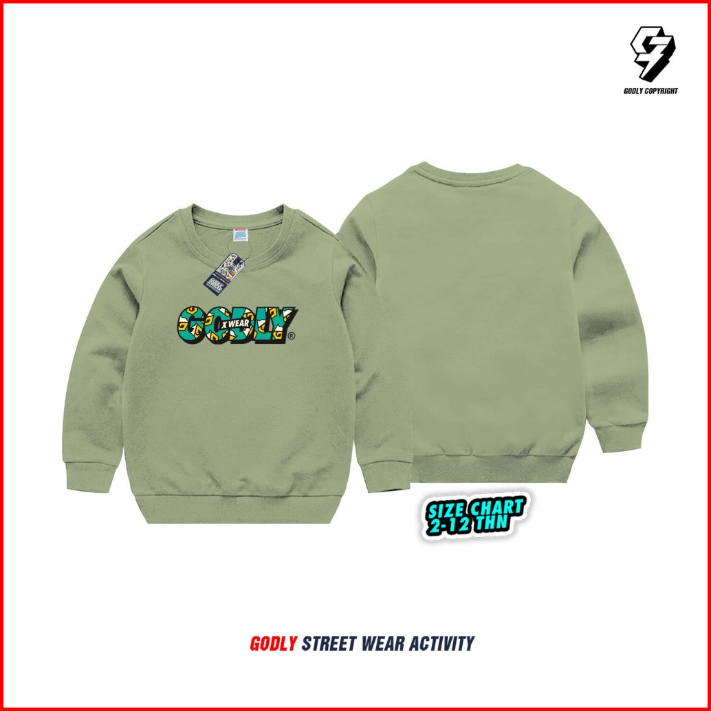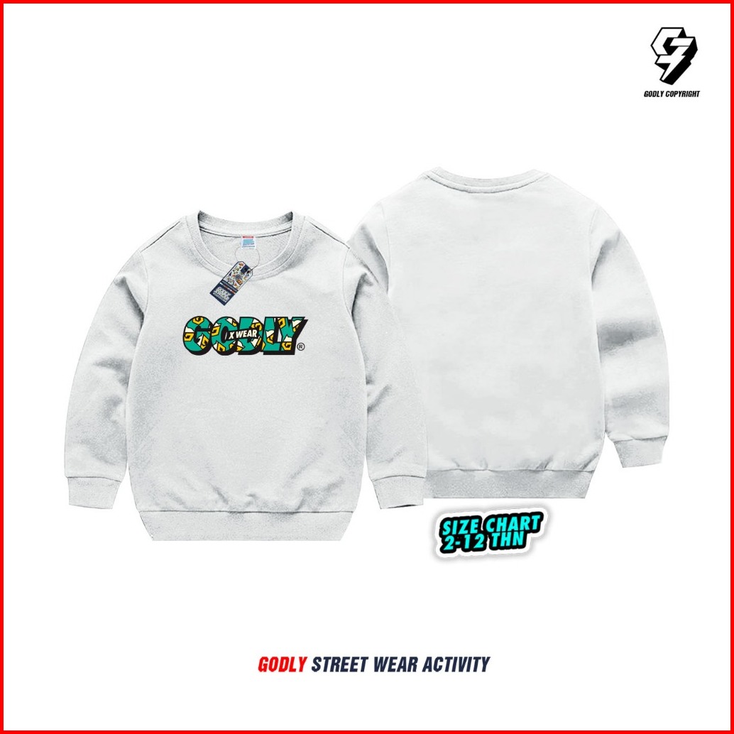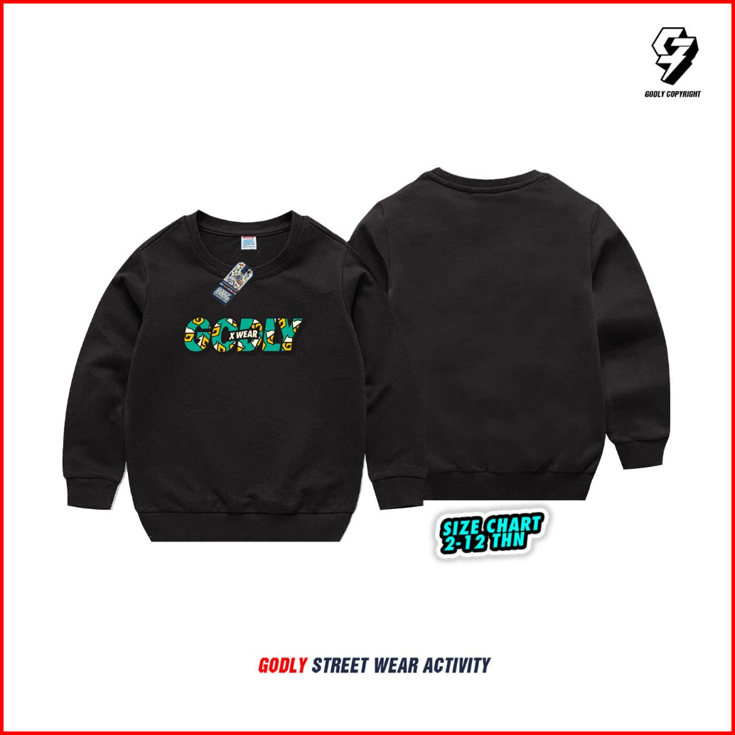 Sweater Anak Bahan Tebal Unisex Motif Godly Crewneck Bahan Katun Fleece
