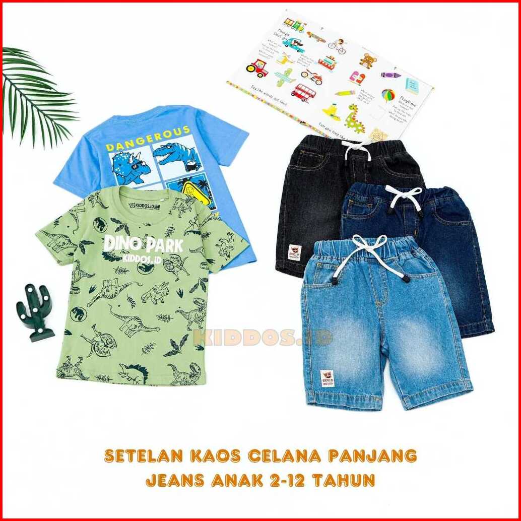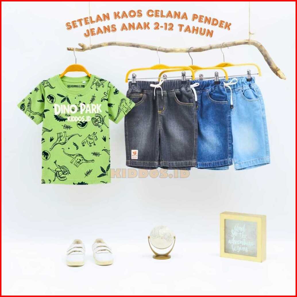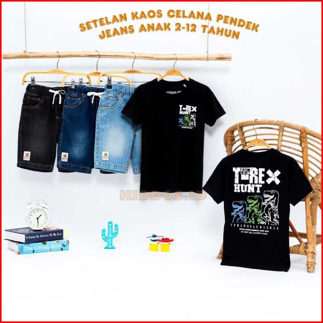 Setelan Kaos Anak Celana Pendek Jeans Anak Laki Laki Dino T-rex Kiddos Id