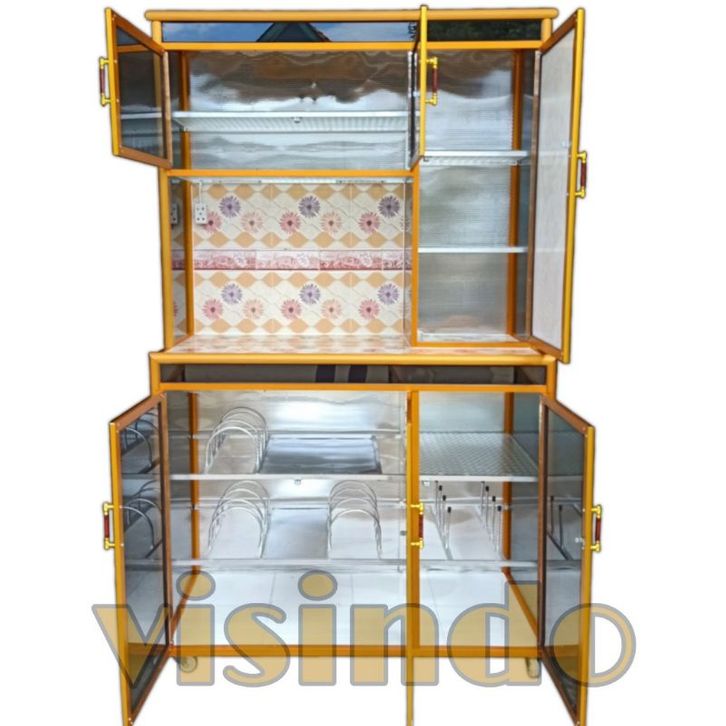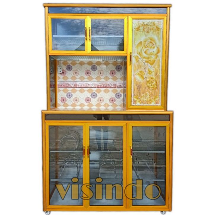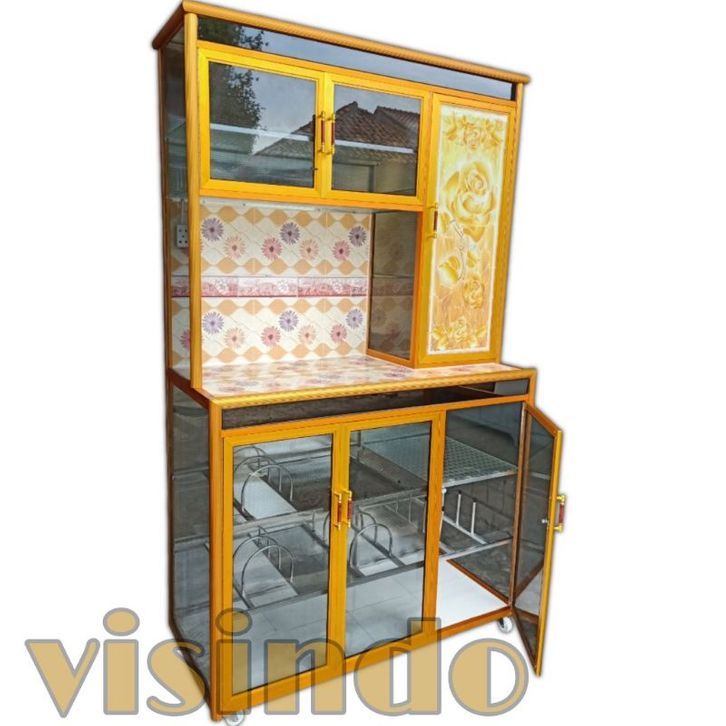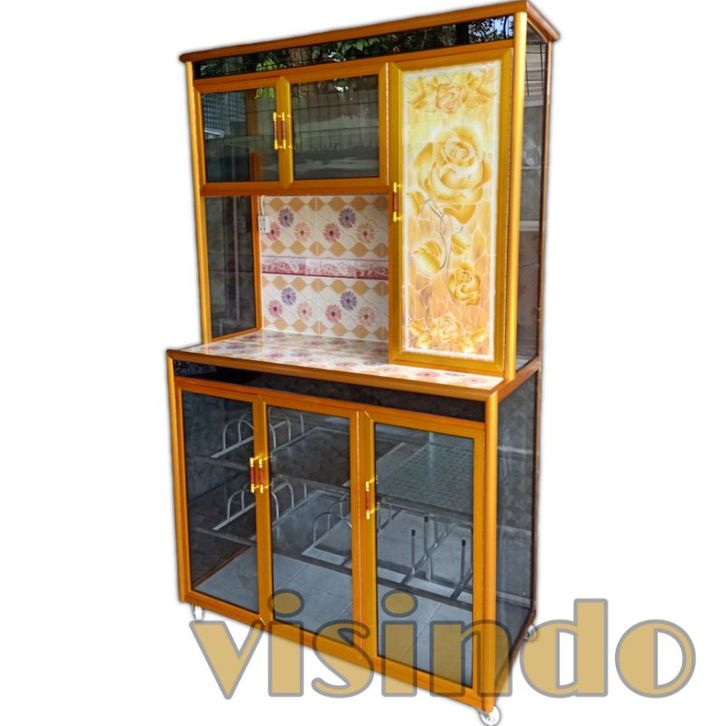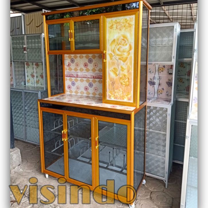 RAK PIRING ALUMINIUM GOLD KACA LUKIS 3 PINTU KAKI RODA