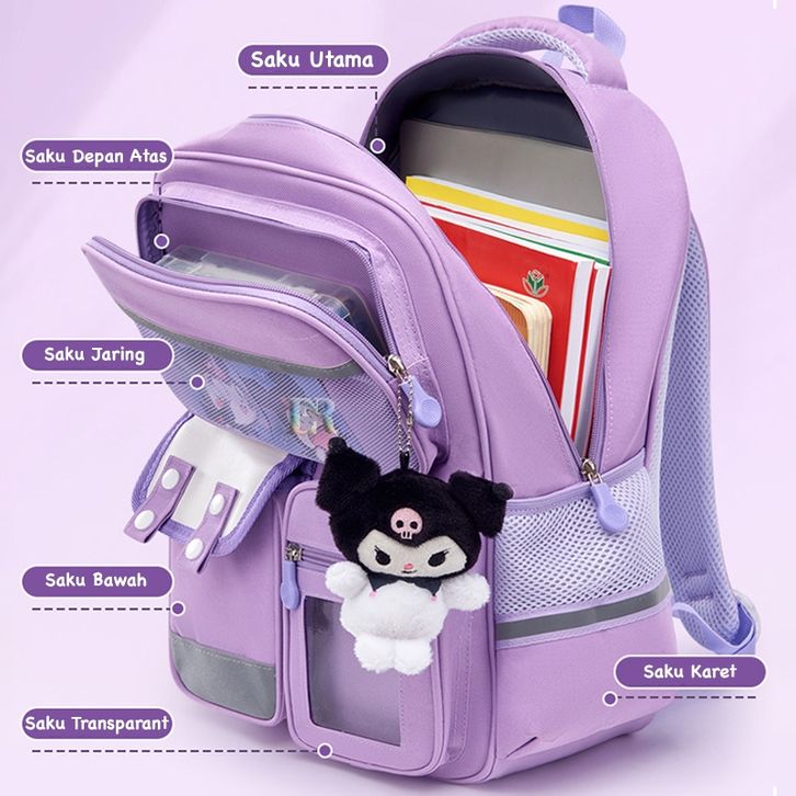 Tas Sekolah Ransel Gendong untuk Anak Perempuan Import dengan Gantungan Tema Sanrio Kuromi Playgroup TK SD