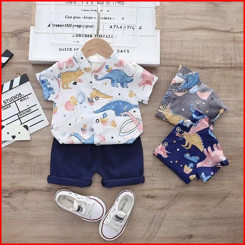 Promo 9.9 Setelan Kemeja Anak Motif Dino Import Kemeja Anak Lengan Pendek Baju Anak Import - Kb19