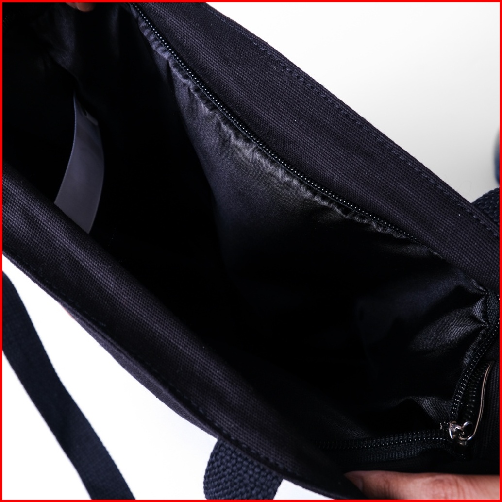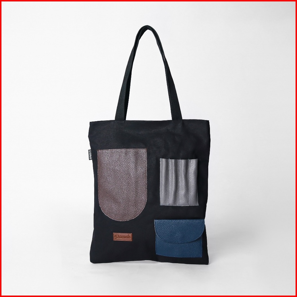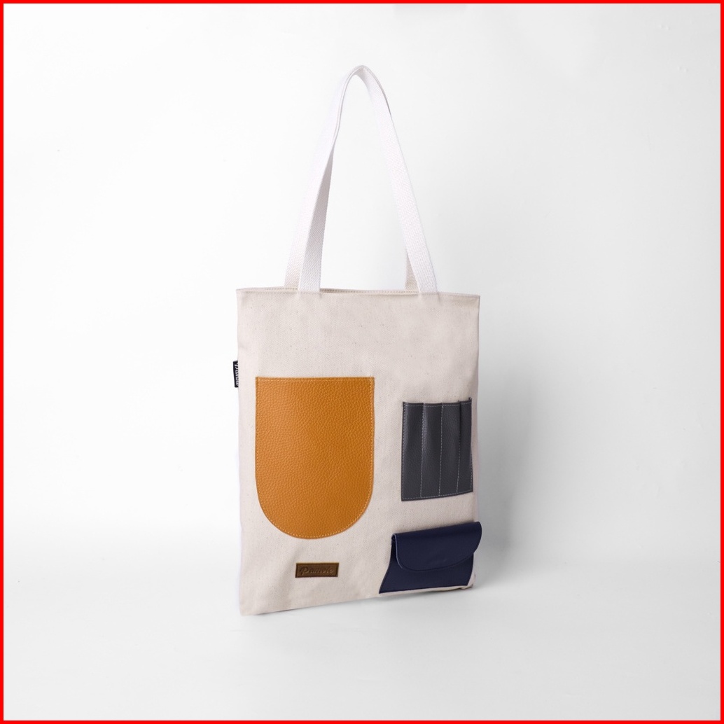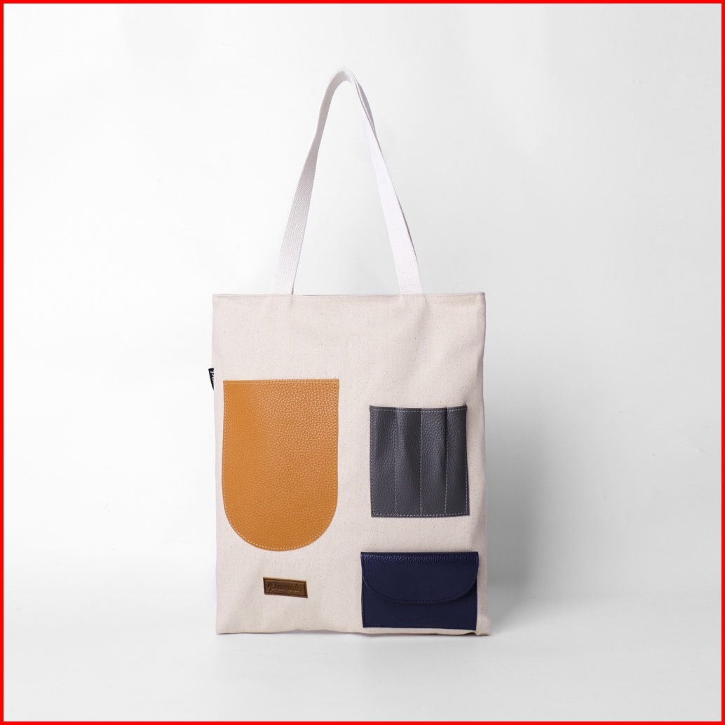 Pamole - Tote Bag Kanvas Penutup Resleting Kombinasi Saku Kulit Pakai Lapisan Furing - Litten Series