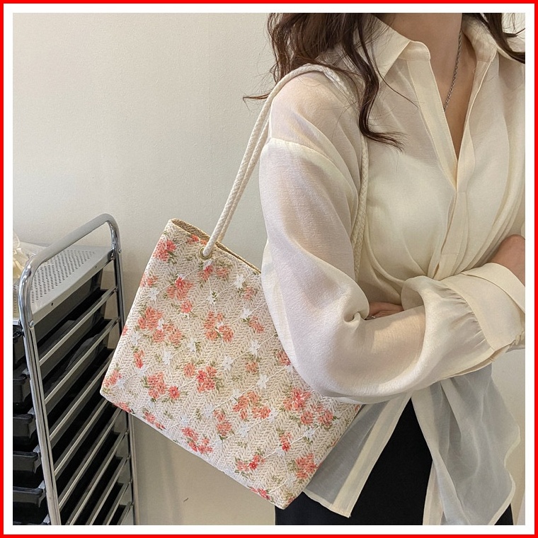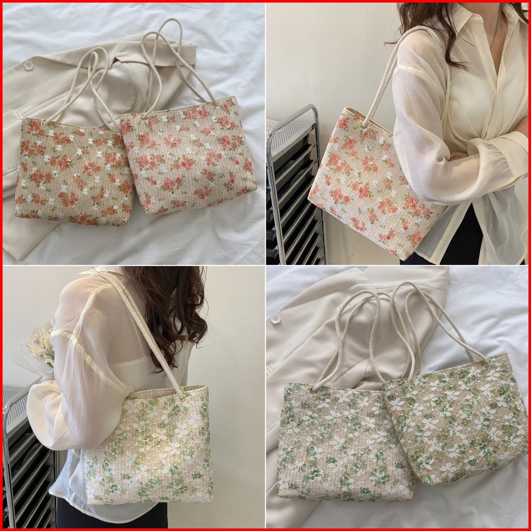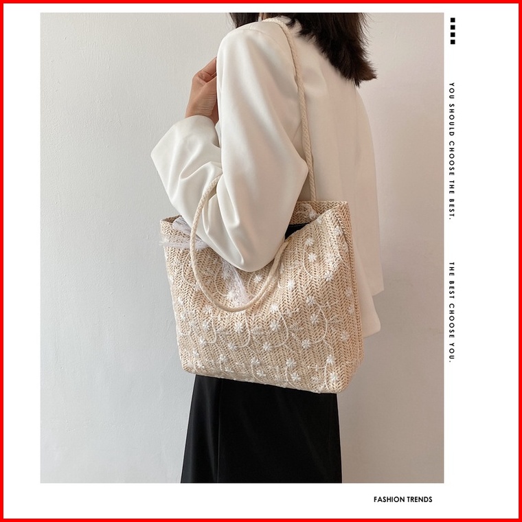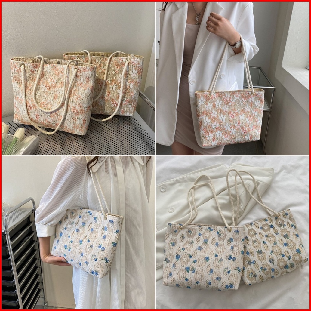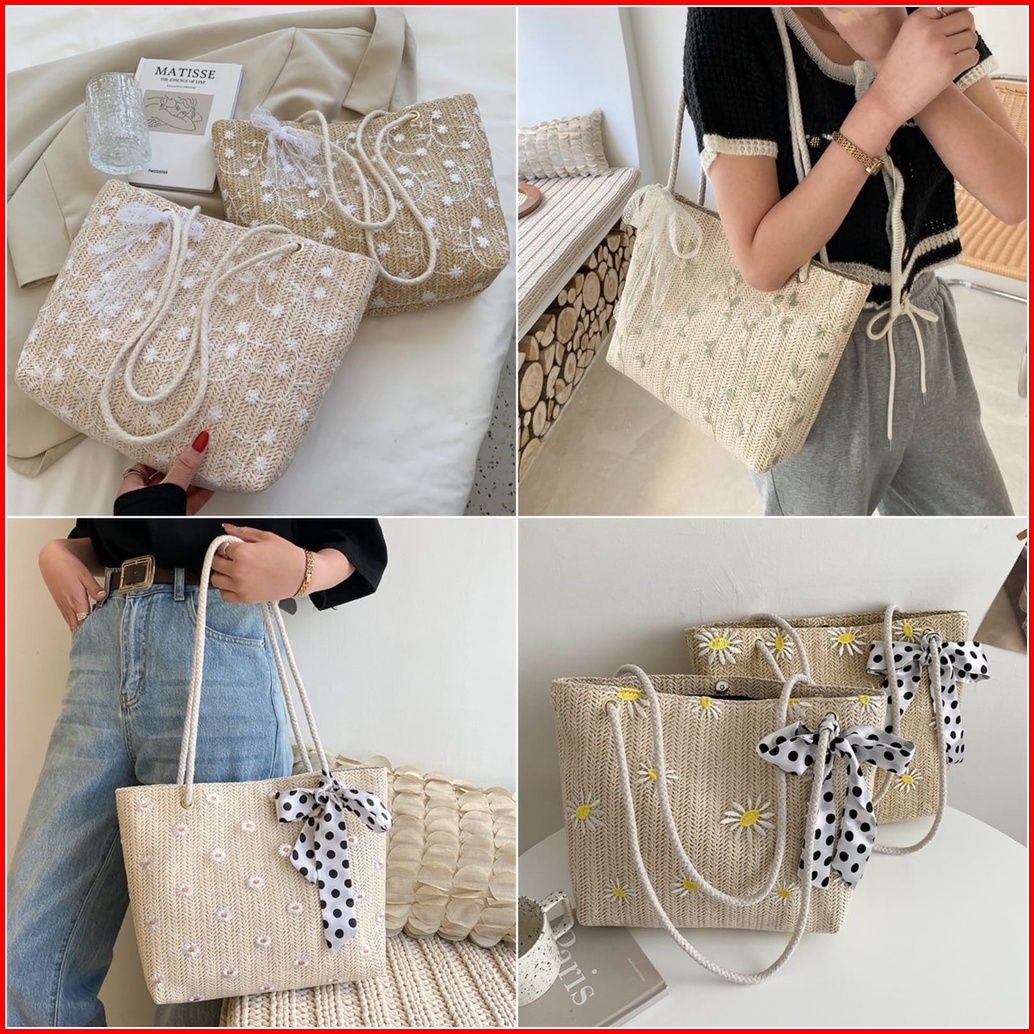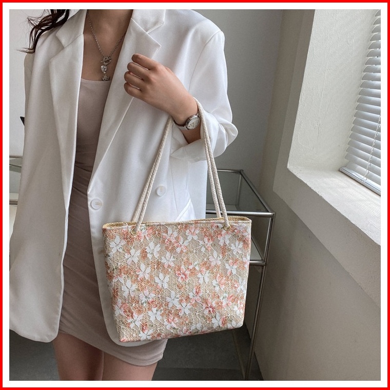 Dbcol Tas Tote Wanita Bahan Anyam Jerami Motif Lace Pita Totebag Fashion Korea Motif Lace Pita Impor