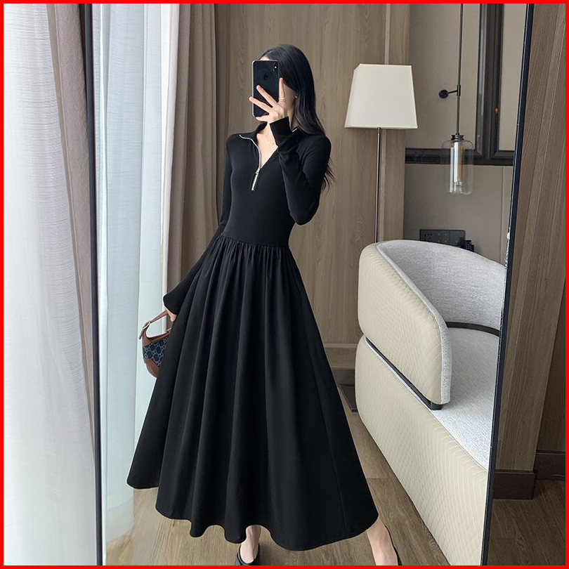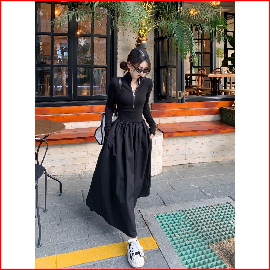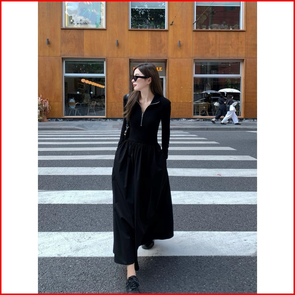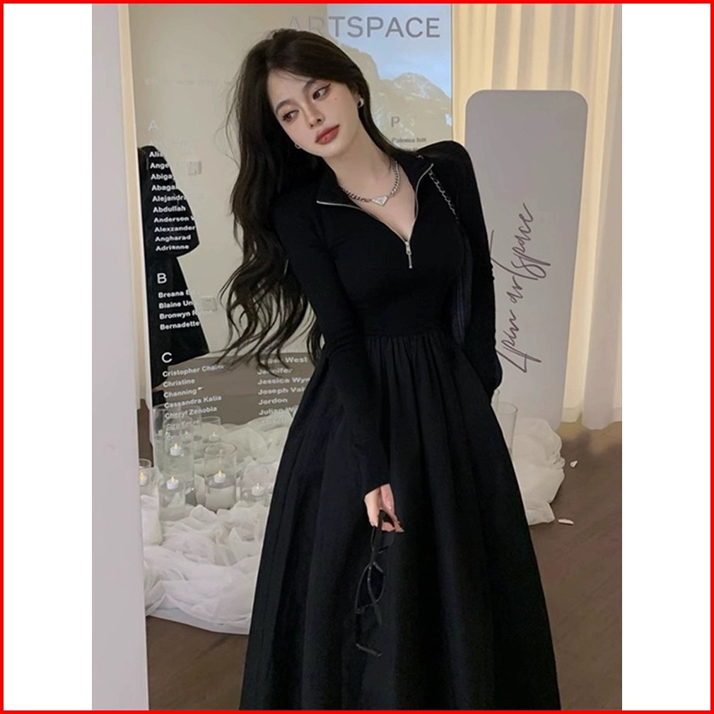 First Girl-model New Long Zipper Dress Hitam Black Dress Black Dress Elegant - G014