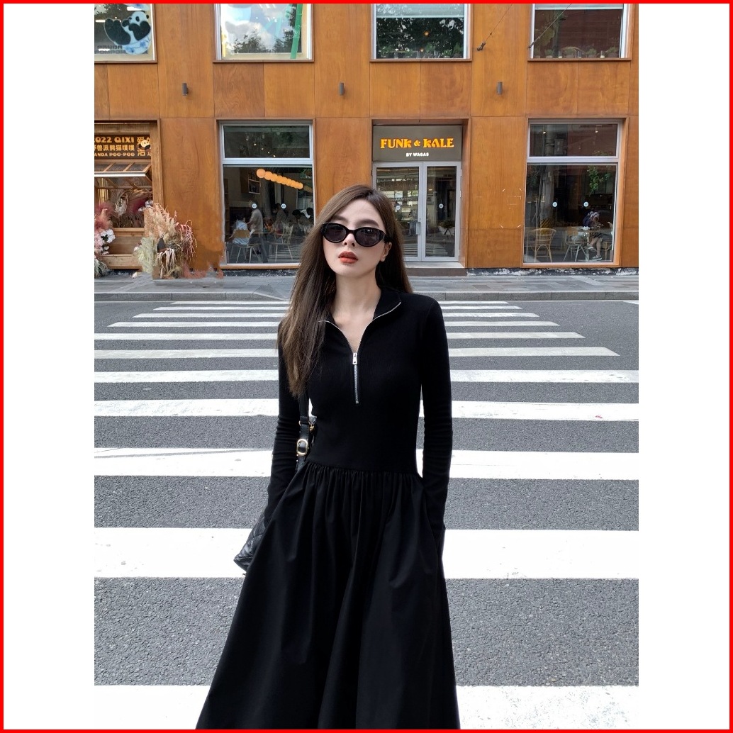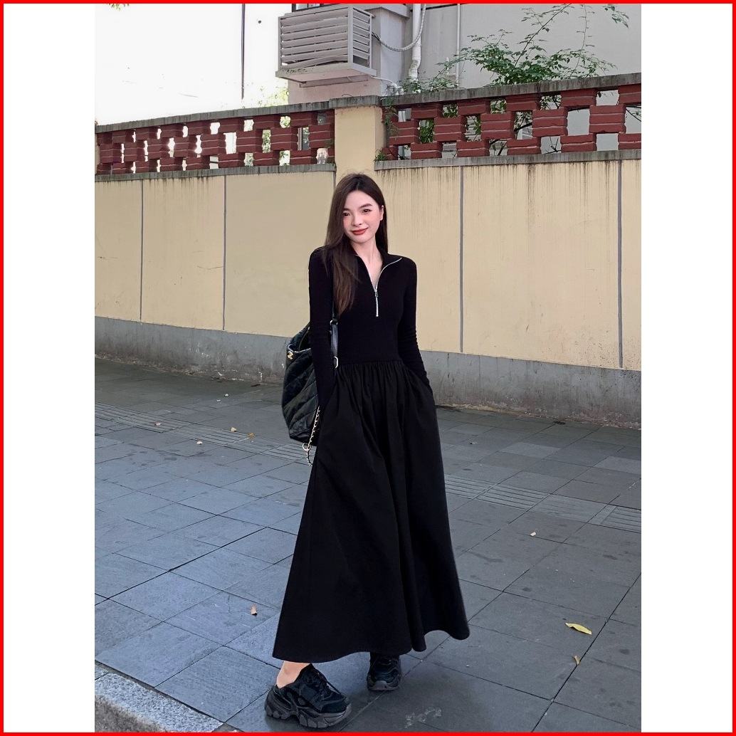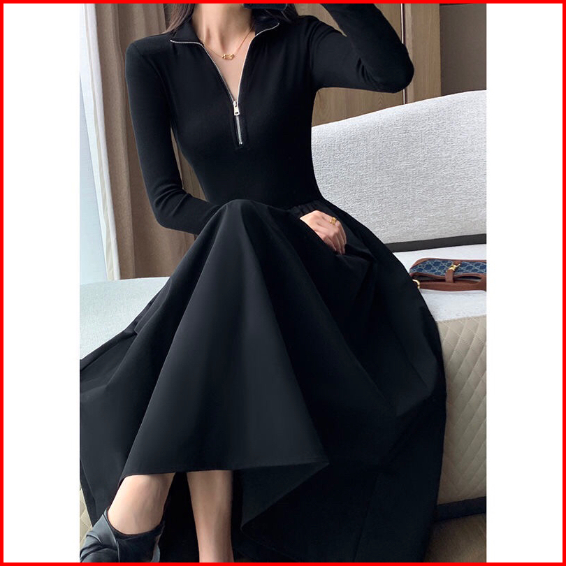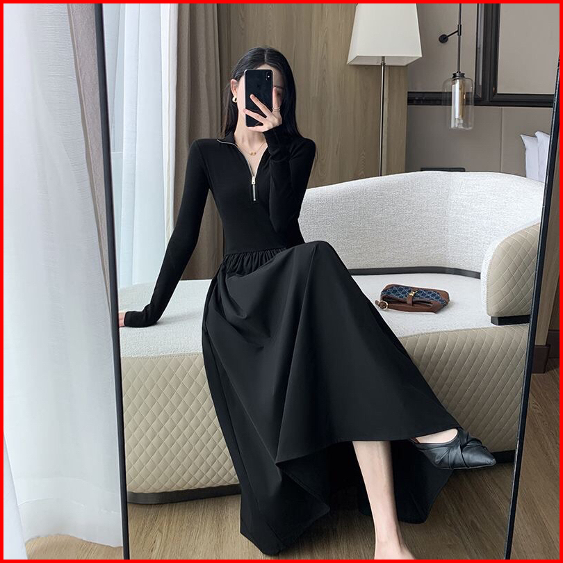 First Girl-model New Long Zipper Dress Hitam Black Dress Black Dress Elegant - G014