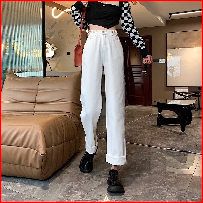 Putih Hitam Highwaist Straight Loose Kasual Jeans Wanitapinggang Bisa Penyesuaianthe Good Sisters