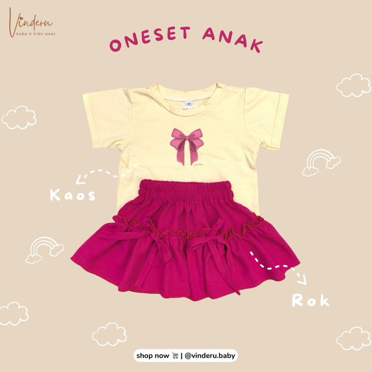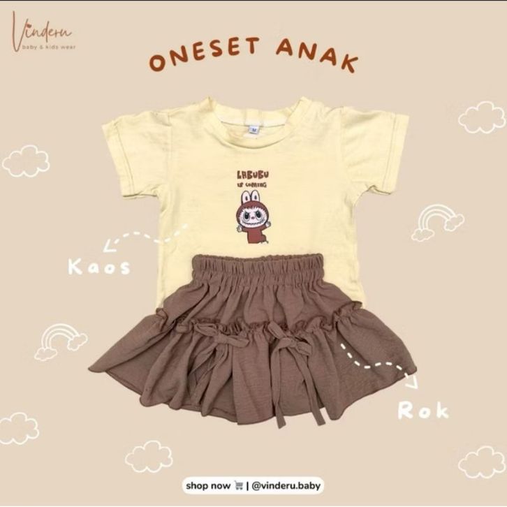 [Star] Setelan Anak Perempuan Size S.M Oneset Vinderu Kaos Labubu Lengan Pendek Dan Rok Pendek Gemas Catton Combed 30s