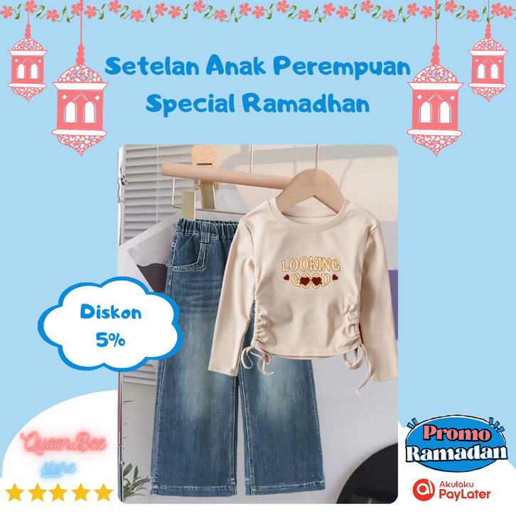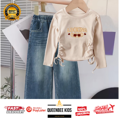 Set Atasan Kaos Crop Panjang Anak Perempuan Celana Jeans Panjang Usia 1-12 Tahun