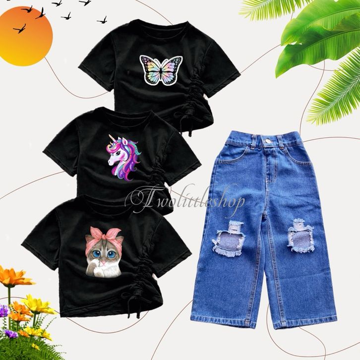SETELAN KULOT SOBEK ANAK BIRU MUDA DAN KAOS HITAM SERUT SETELAN ANAK PEREMPUAN TANGGUNG SETELAN ANAK PEREMPUAN TERBARU