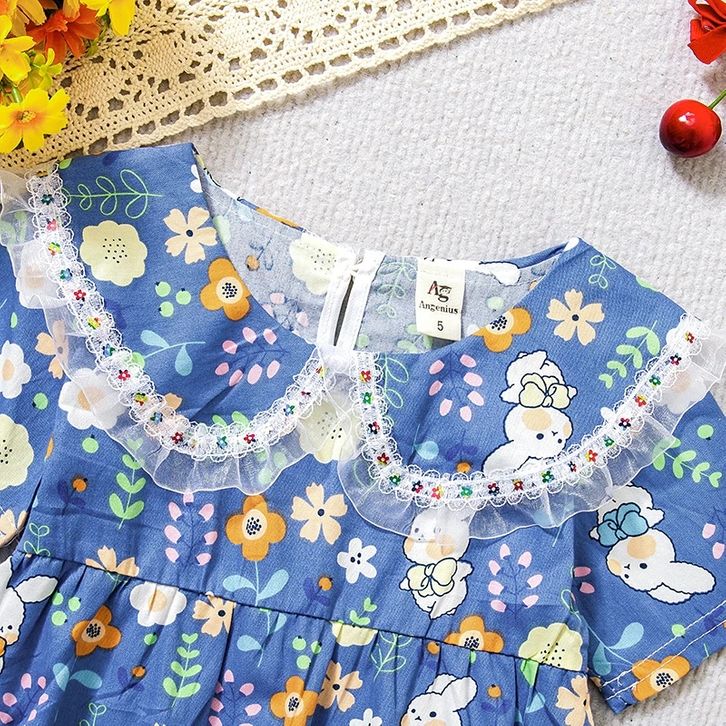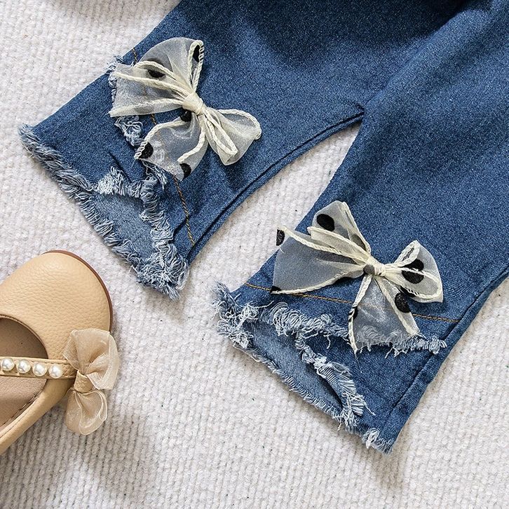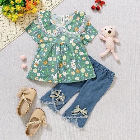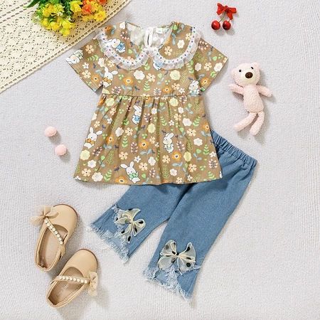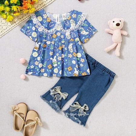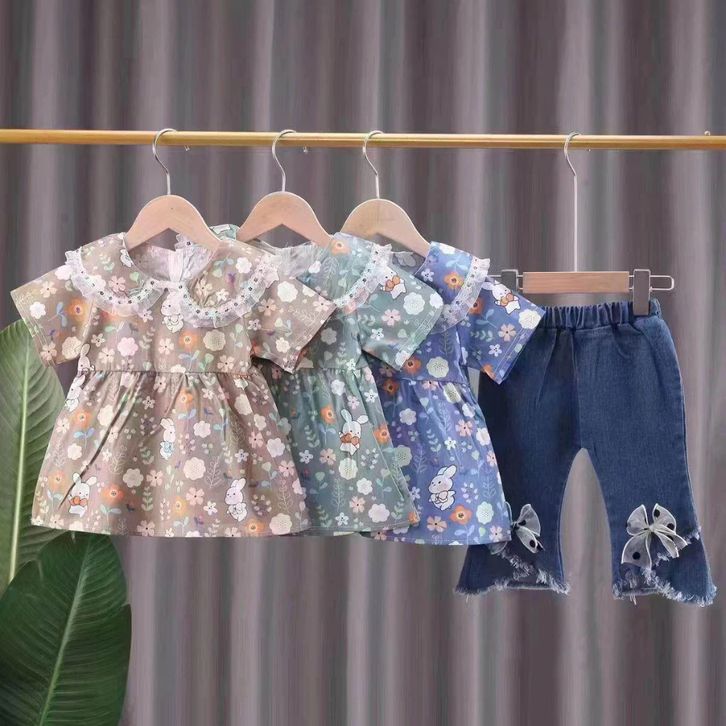 Setelan Baju Anak Perempuan Motif Rabbit Flower Dengan Celana Jeans Casual - Usia 1-4 Tahun
