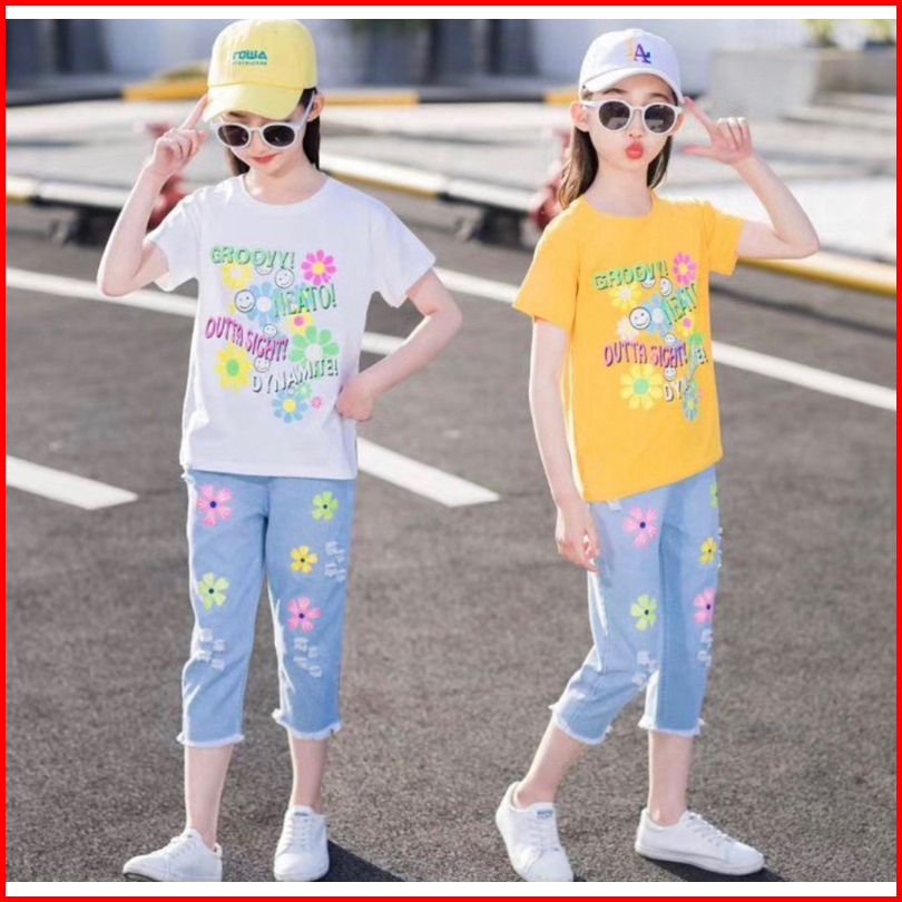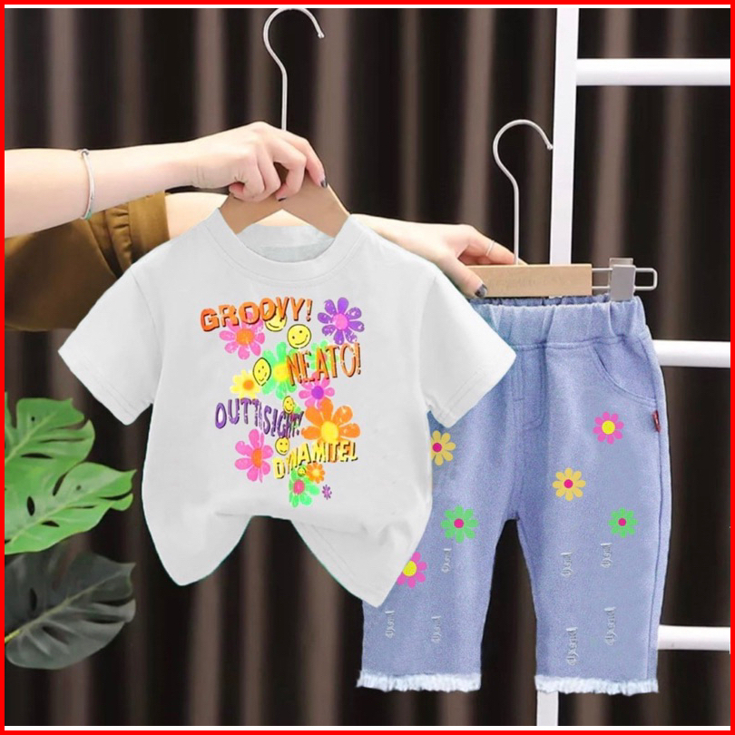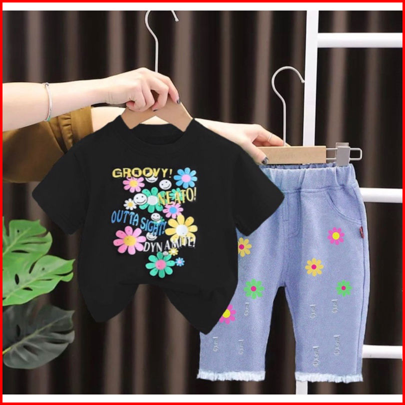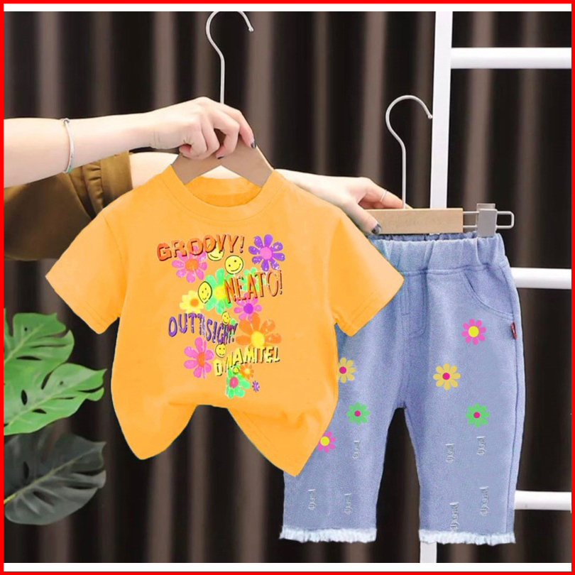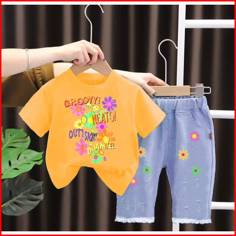 Setelan Anak Perempuan Celana Denim Baju Motif Bunga 1-5 Tahun Ardan Grosir