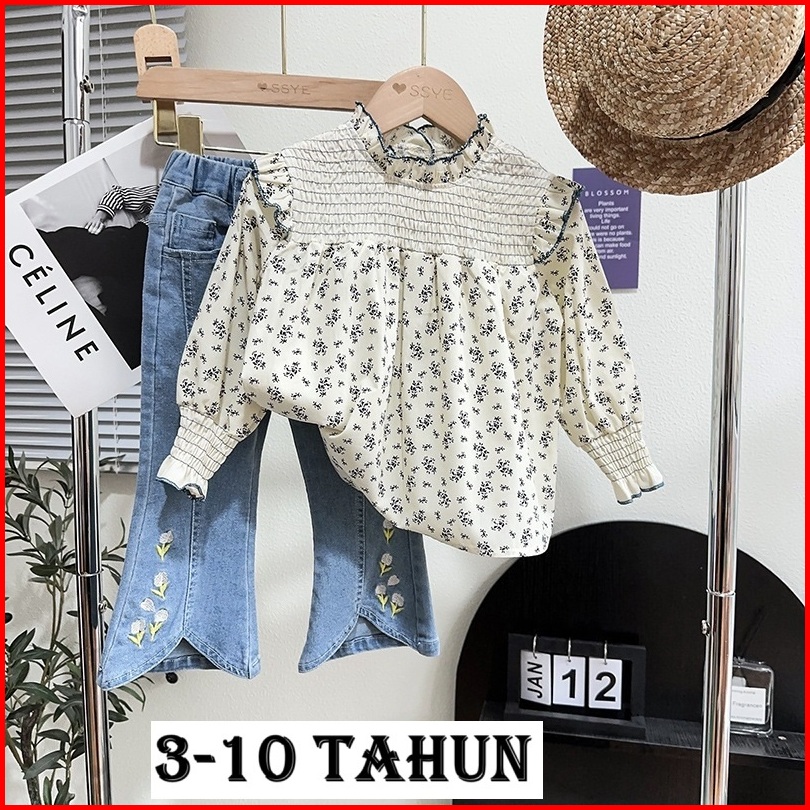 Meandboss Ssp100 - Setelan Set Anak Perempuan Blouse Celana Jeans Wash Off Bordiran Bunga
