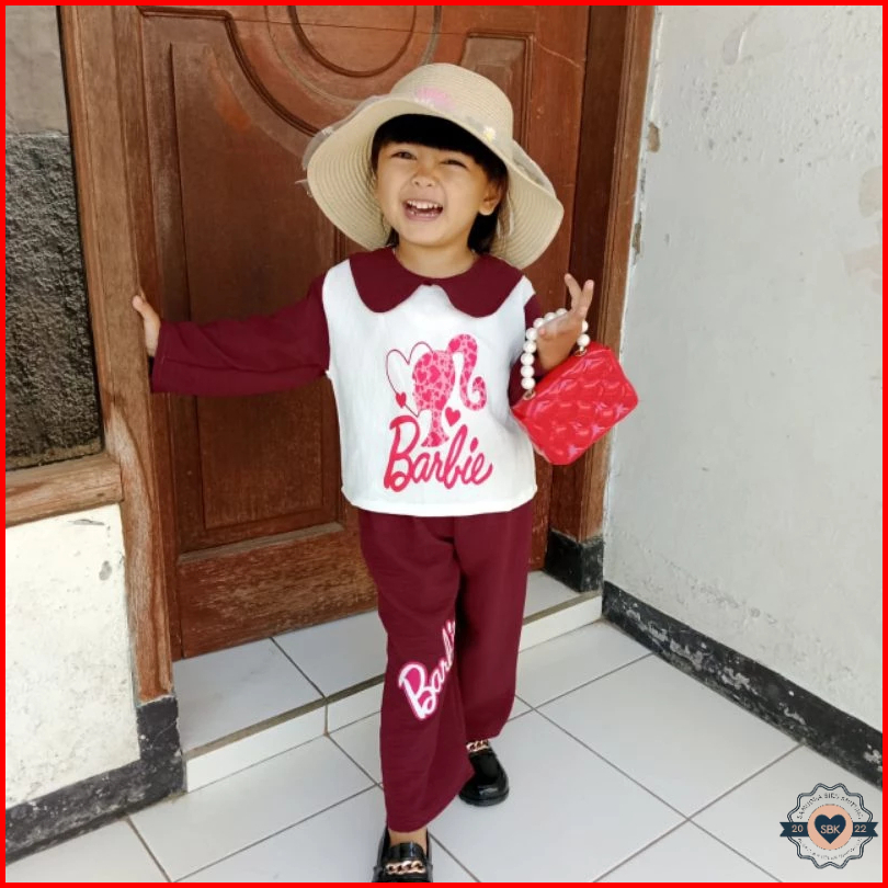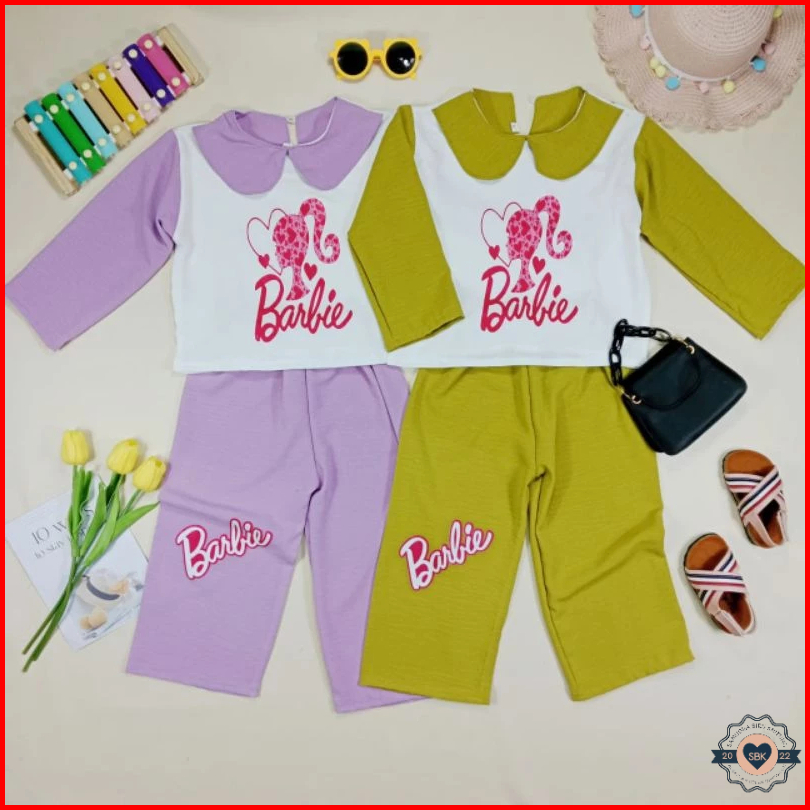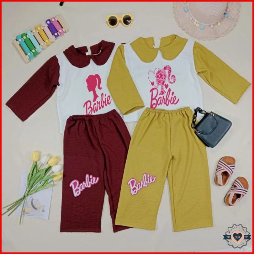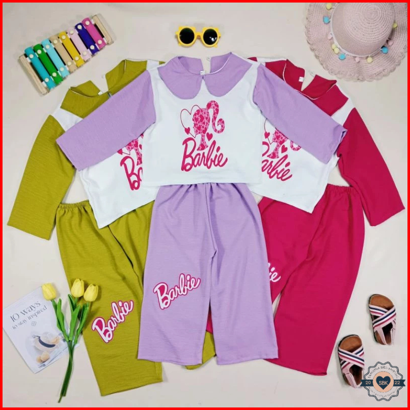 Setelan Baju Anak Crop Top Barbie Viral Crinkle Airflow Usia 2-9 Tahun Lucu Dengan Kerah Burterfly