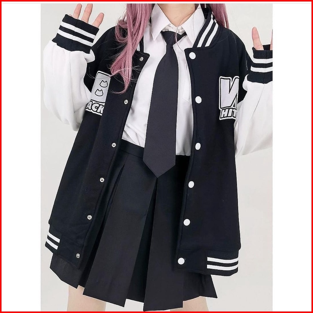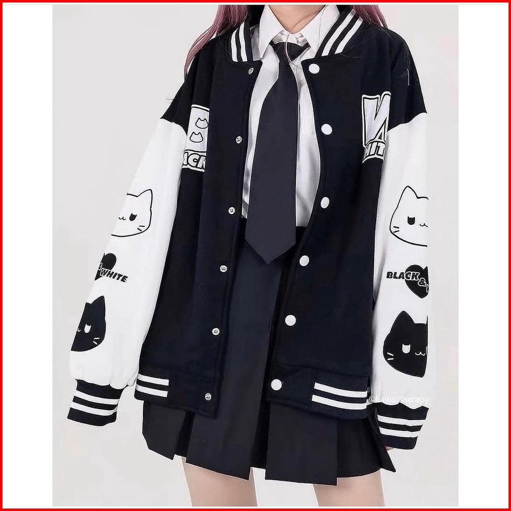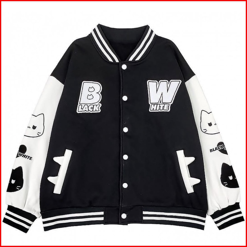 Bw Cat Jacket Baseball Cewek Lucu Jacket Varsity Black White Oversize Wanita Korea Style