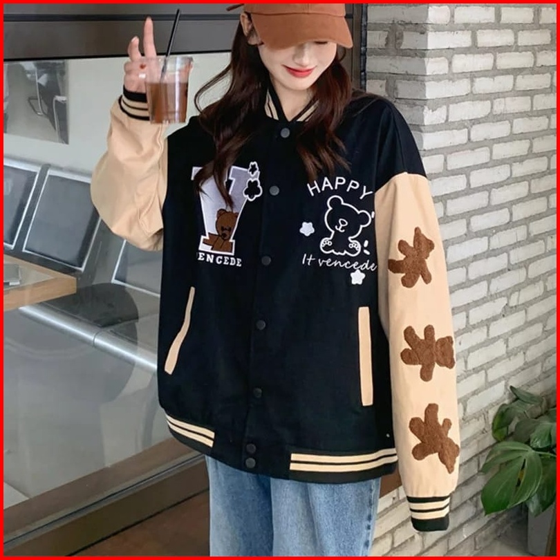 Jaket Baseball Wanita - V Happy Jaket Baseball Oversize - Varsity Jaket Wanita Korean Style