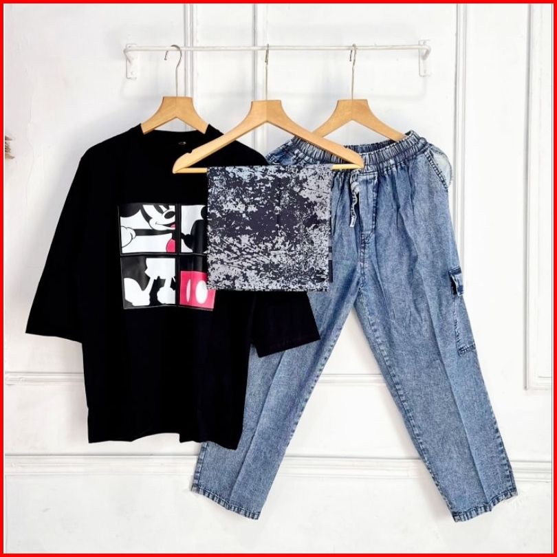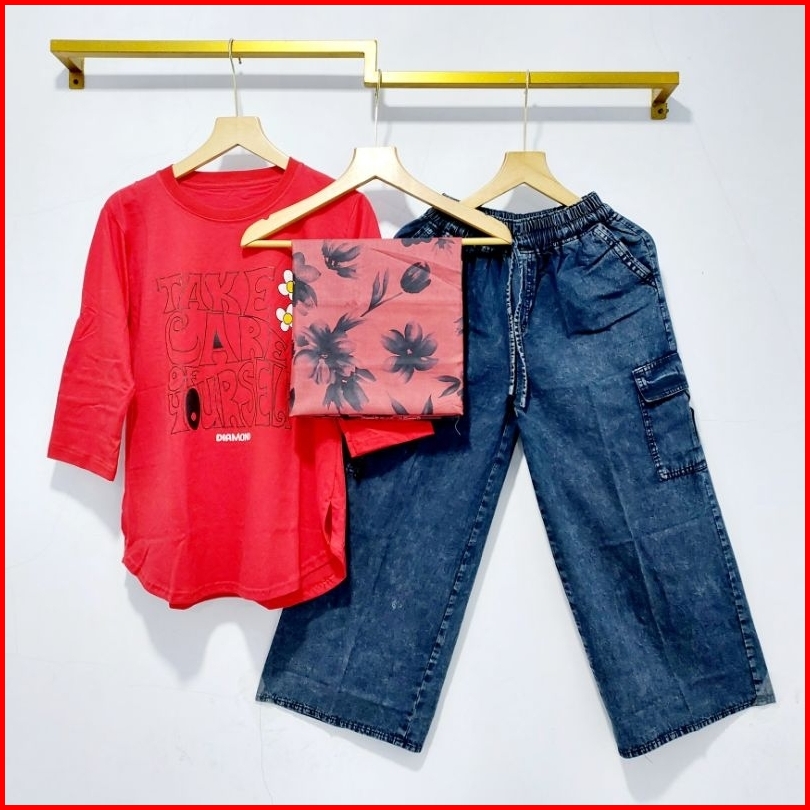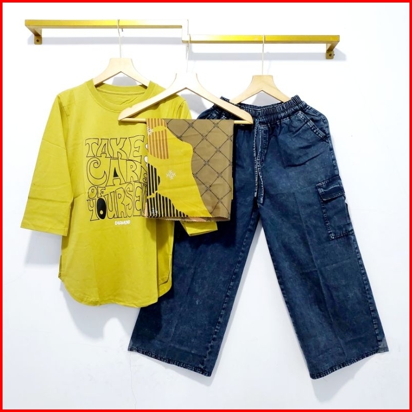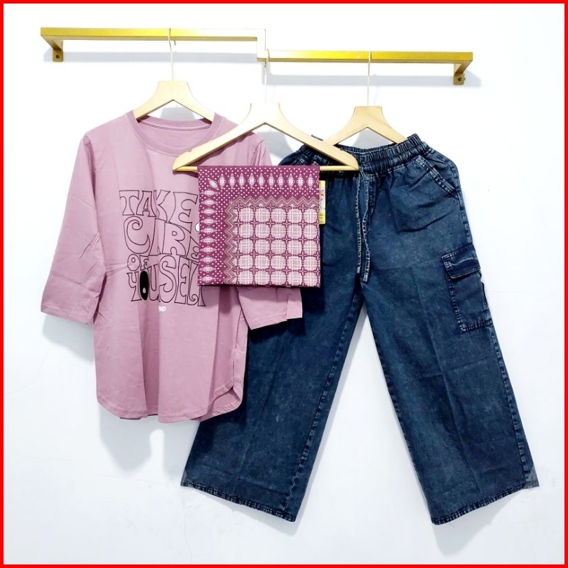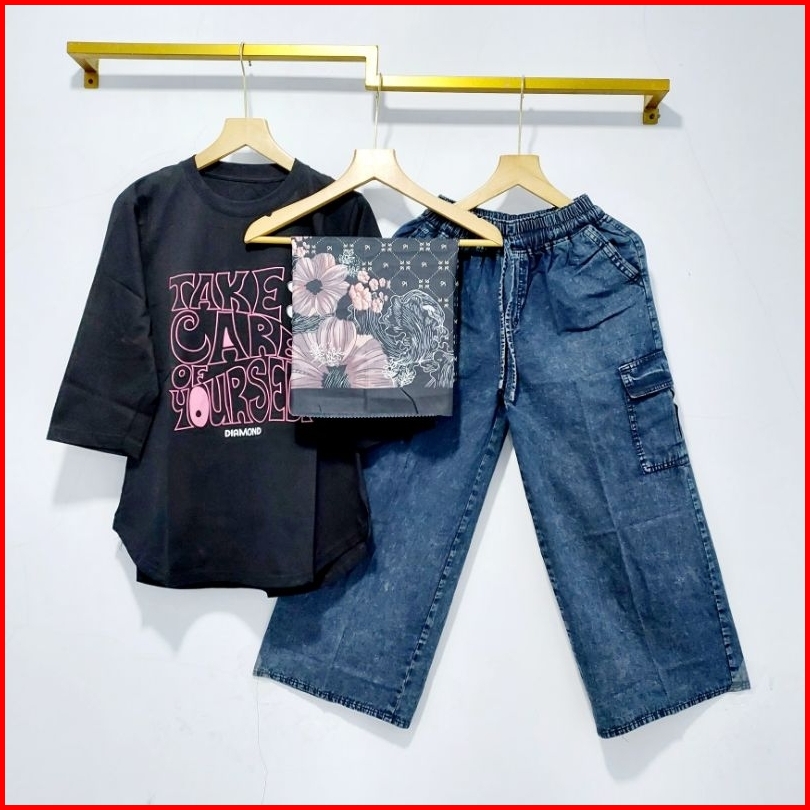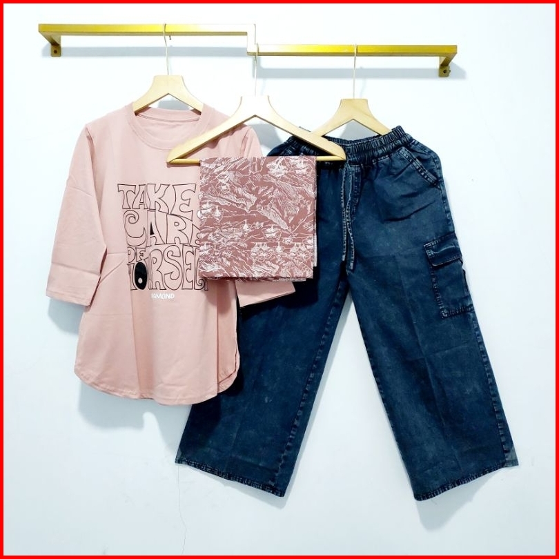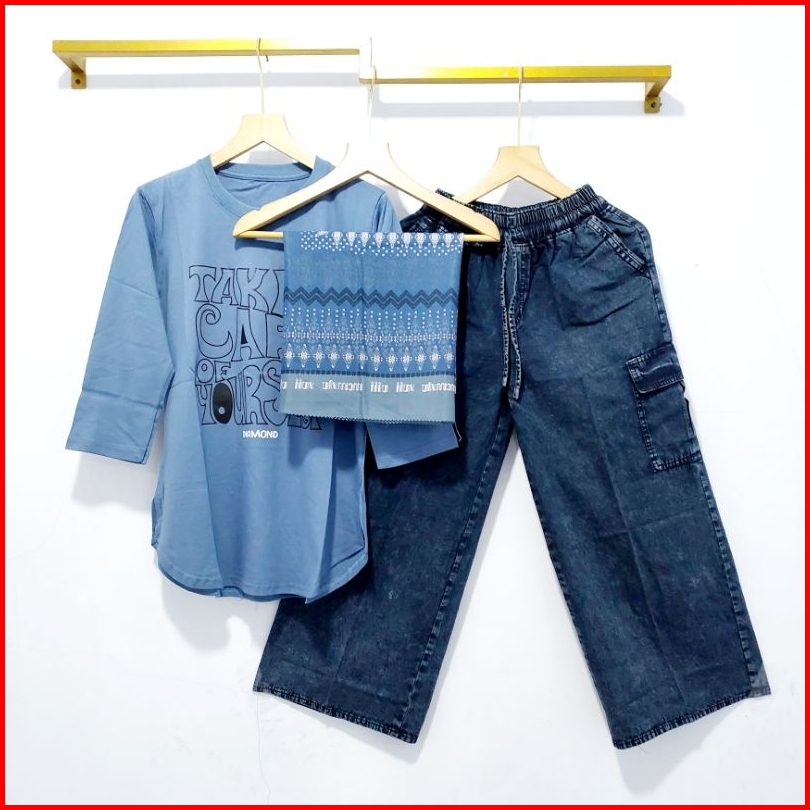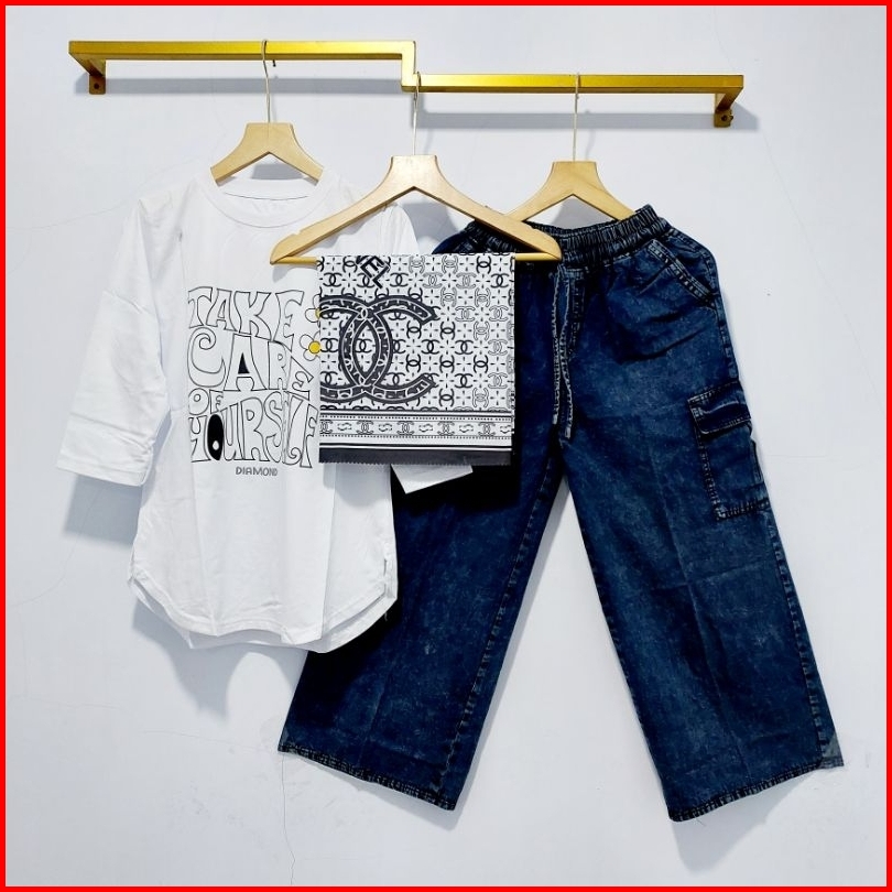 Set Cel Kulot Jeans Cargo Terbaru Set Kulot Jeans Kaos Combed 20s Set Jeans Wanita Cargo Kekinian