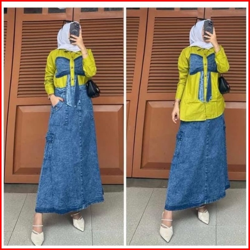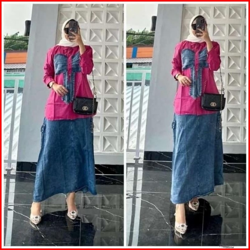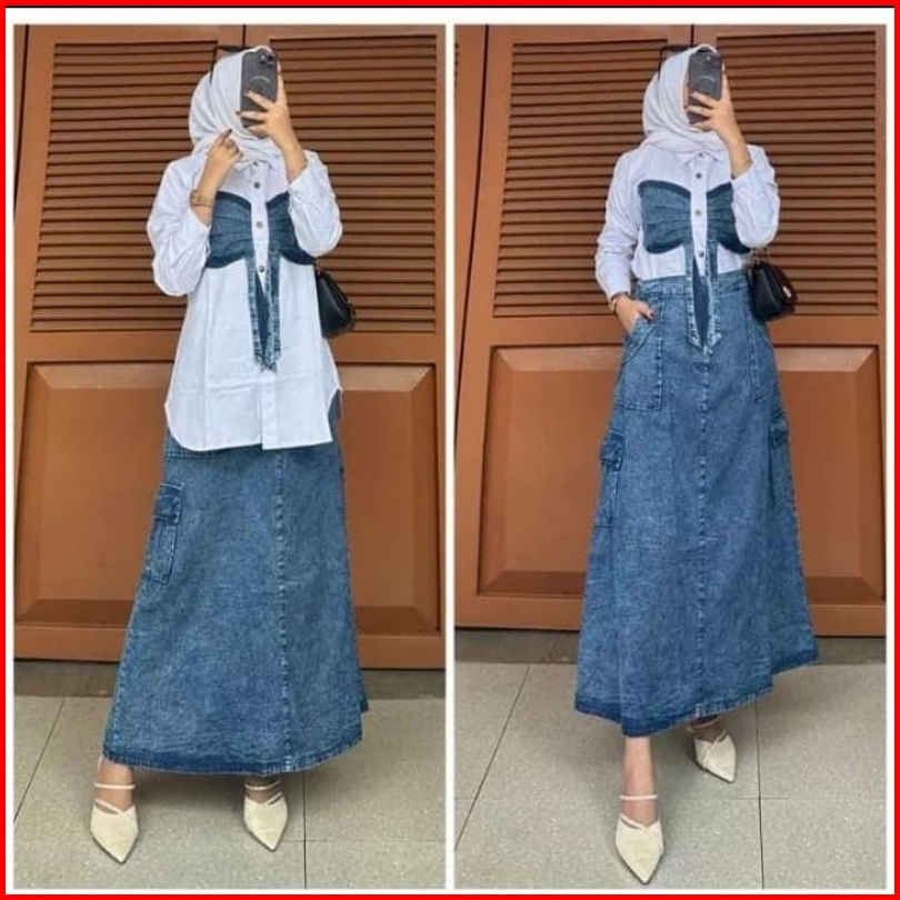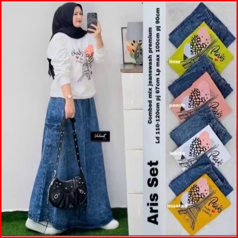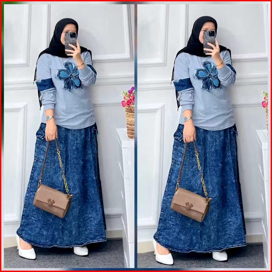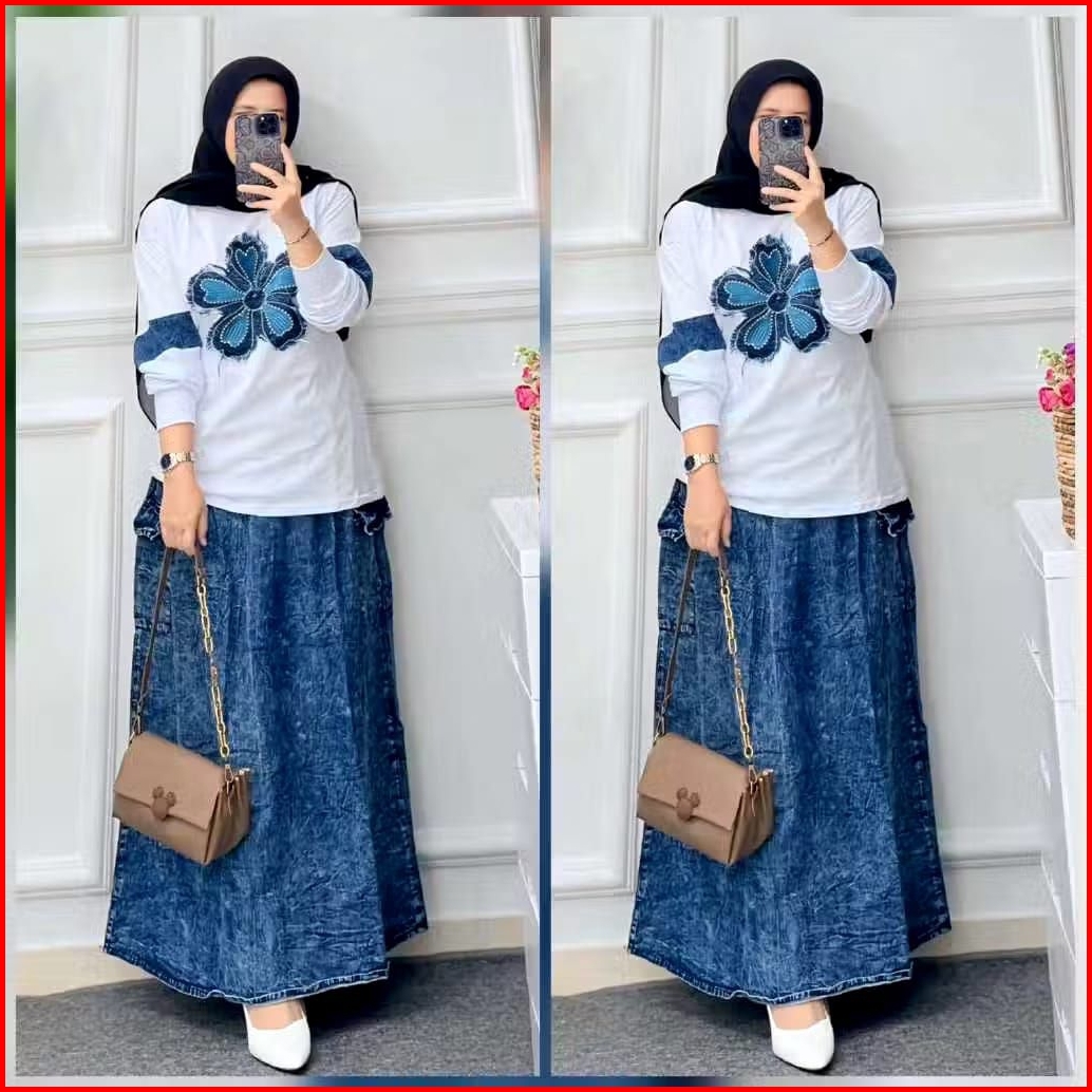 One Set Wanita Dewasa Atasan Combed 2in1 Set Rok Jeans Kekinian