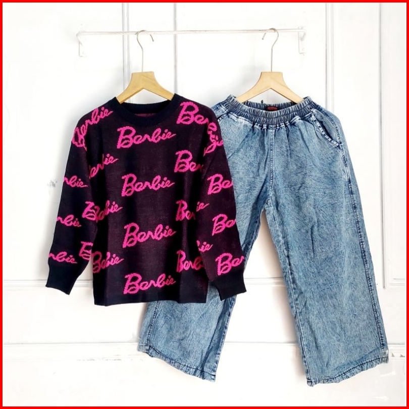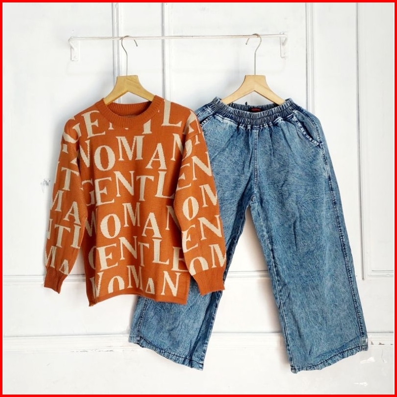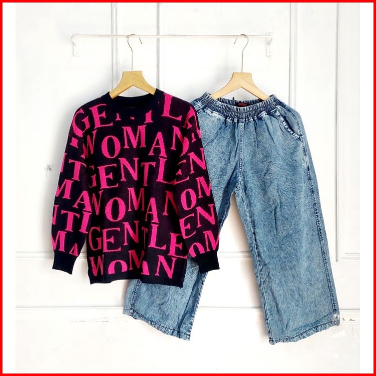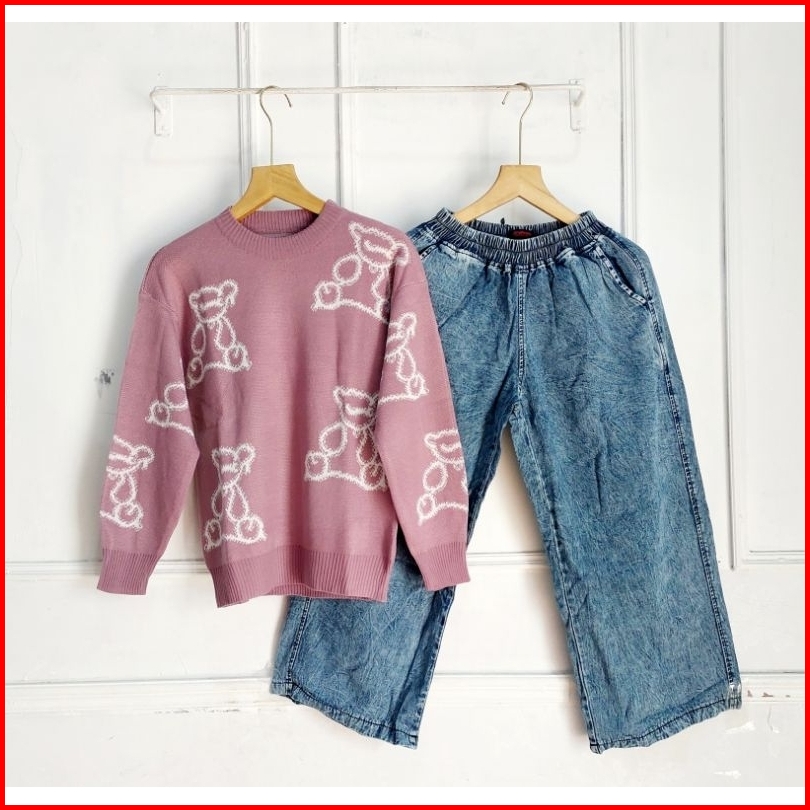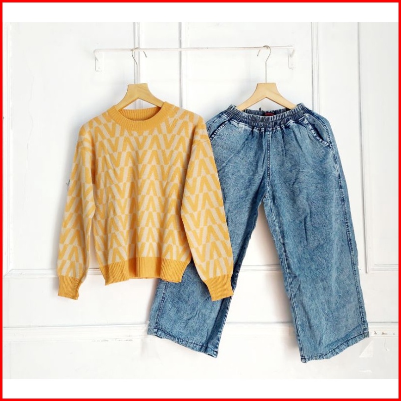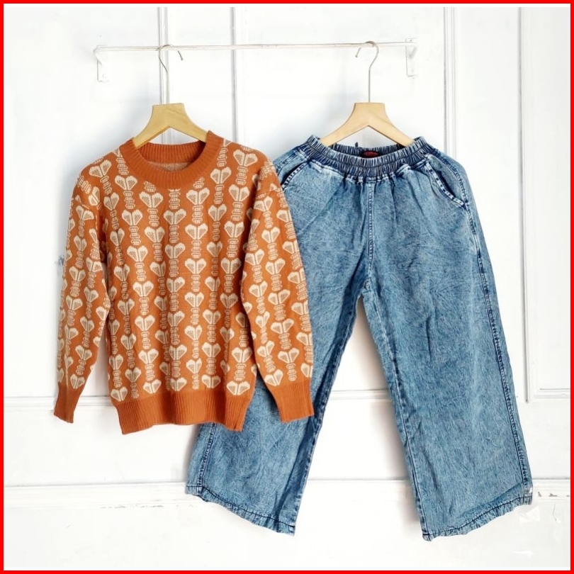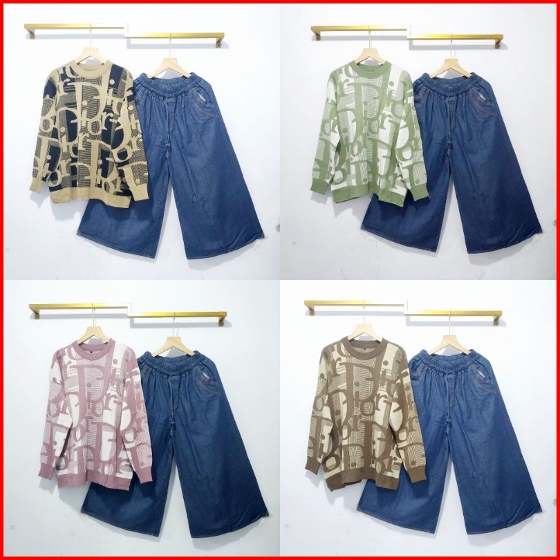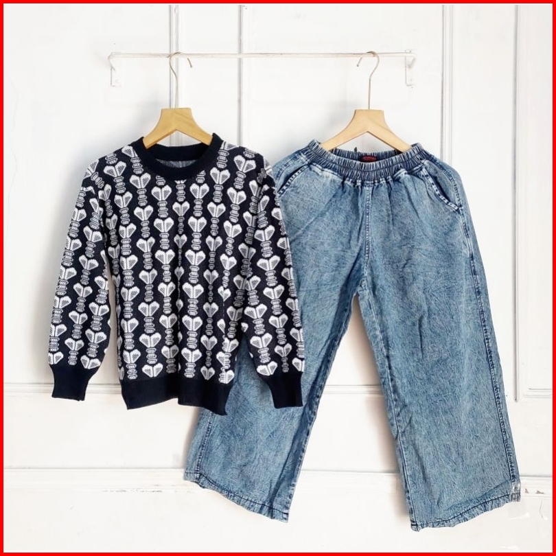 Set Celana Kulot Jeans Atasan Blouse Rajut