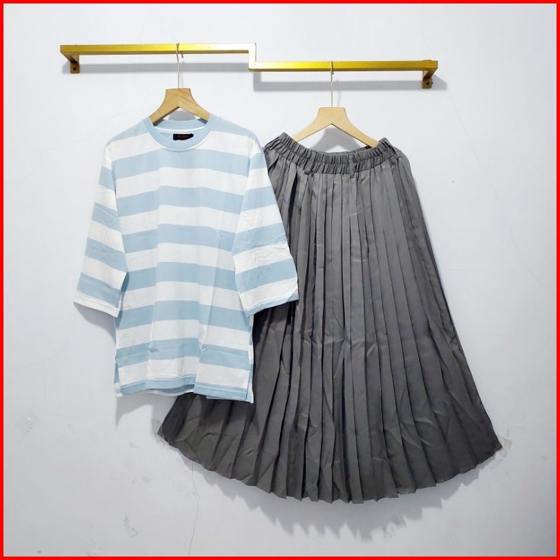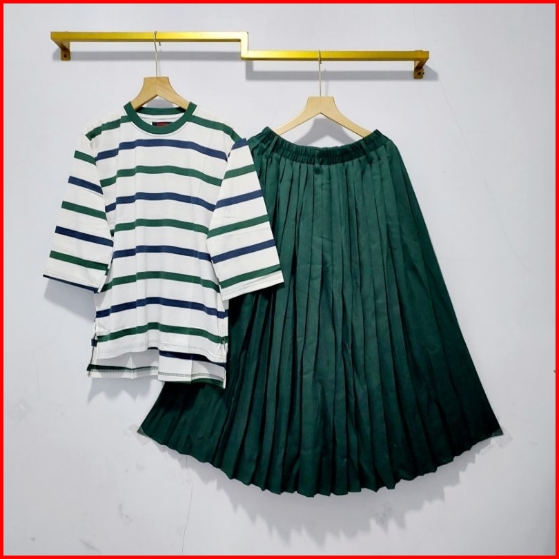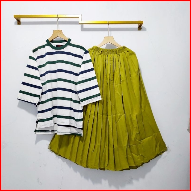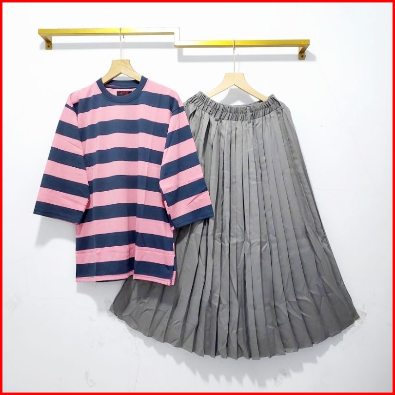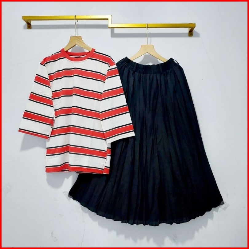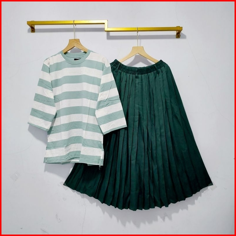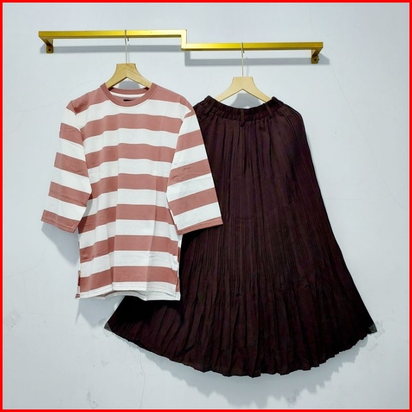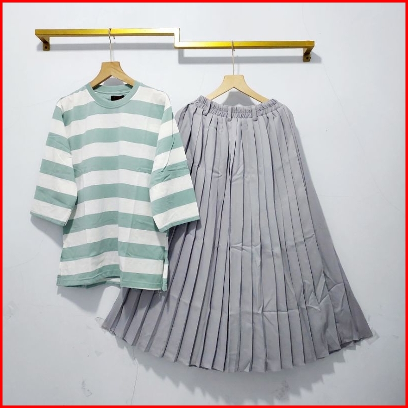 Kaos Salur Lengan 7 8 Set Rok Plisket Set Salur Wanita Premium Kekinian Terbaru Remaj Dewasa