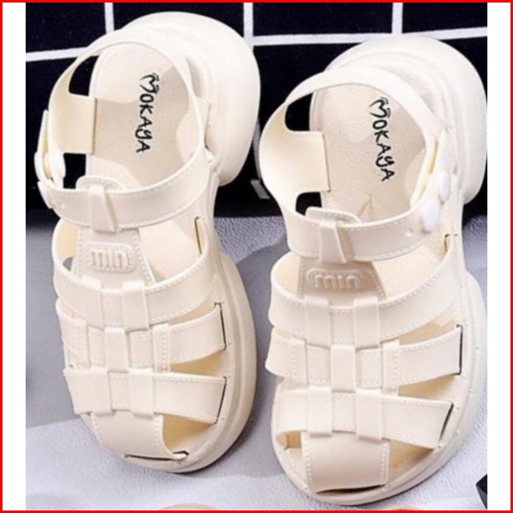 Sandal Gladiator Jelly Anak Cewek Tali Belakang Kancing Putih Motif Min Super Pretty Simple Elegant Import Mokaya Size 2