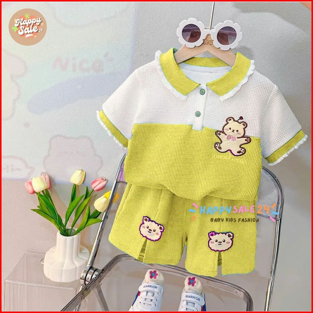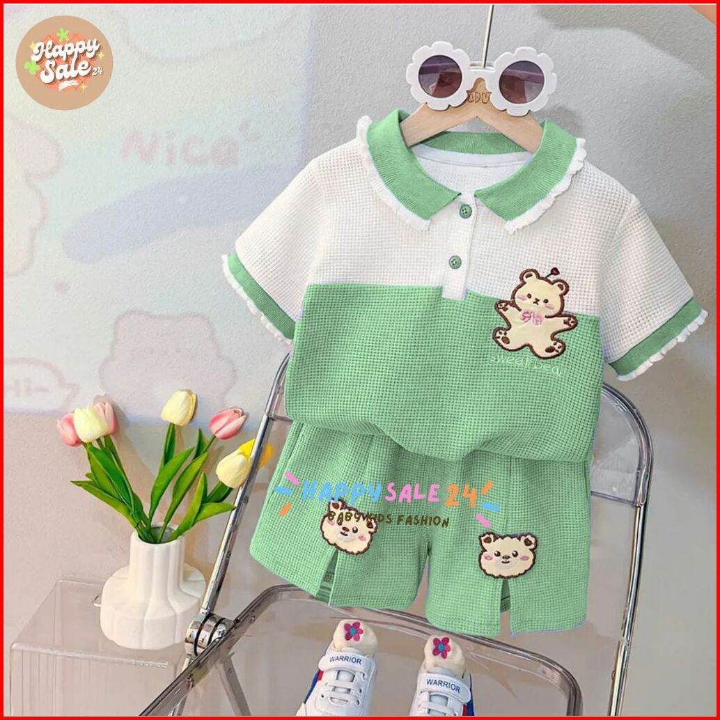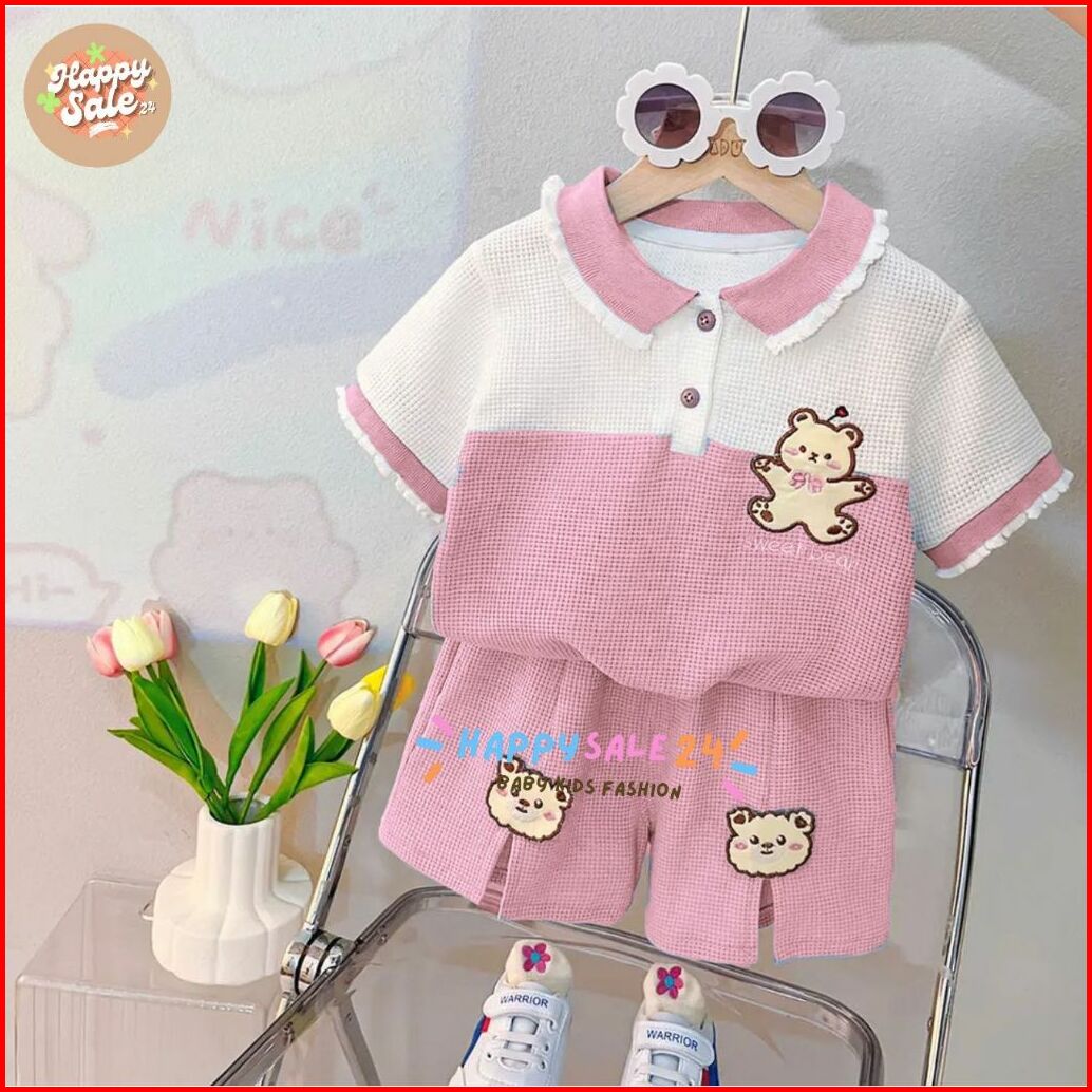 Setelan Anak Perempuan Atasan Polo Celana Pendek Setelan Knit Wafle Renda Motif Sweet Bear Usia 1-5 Tahun Pakaian Anak P
