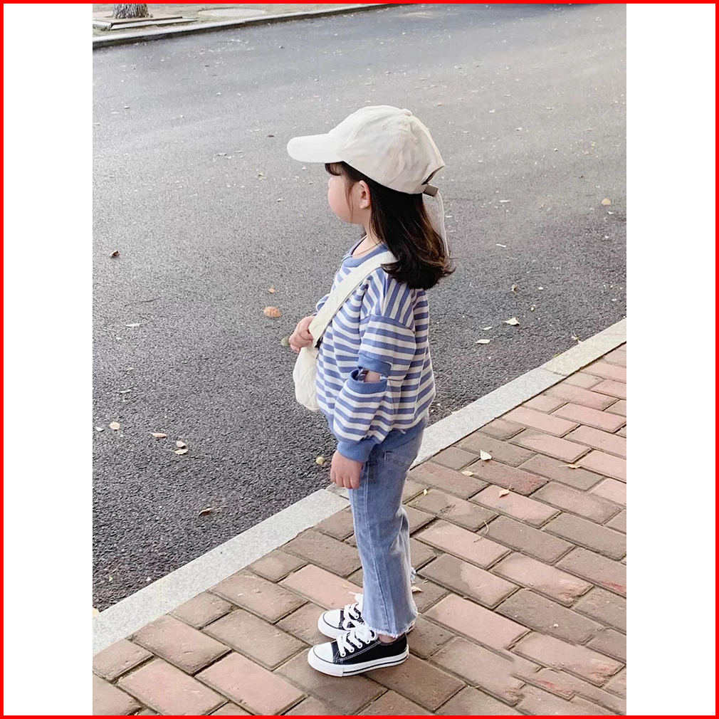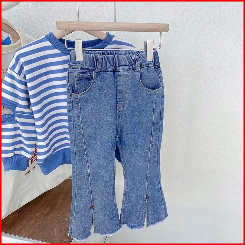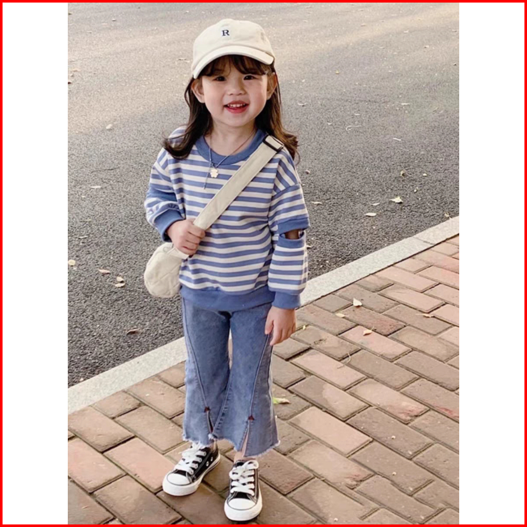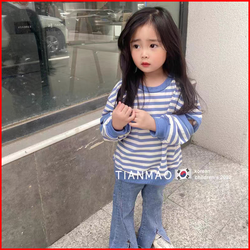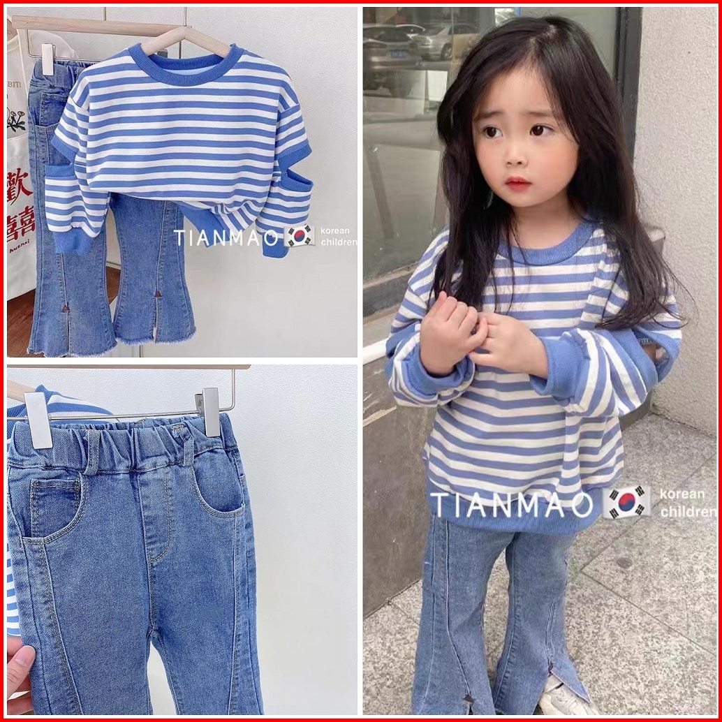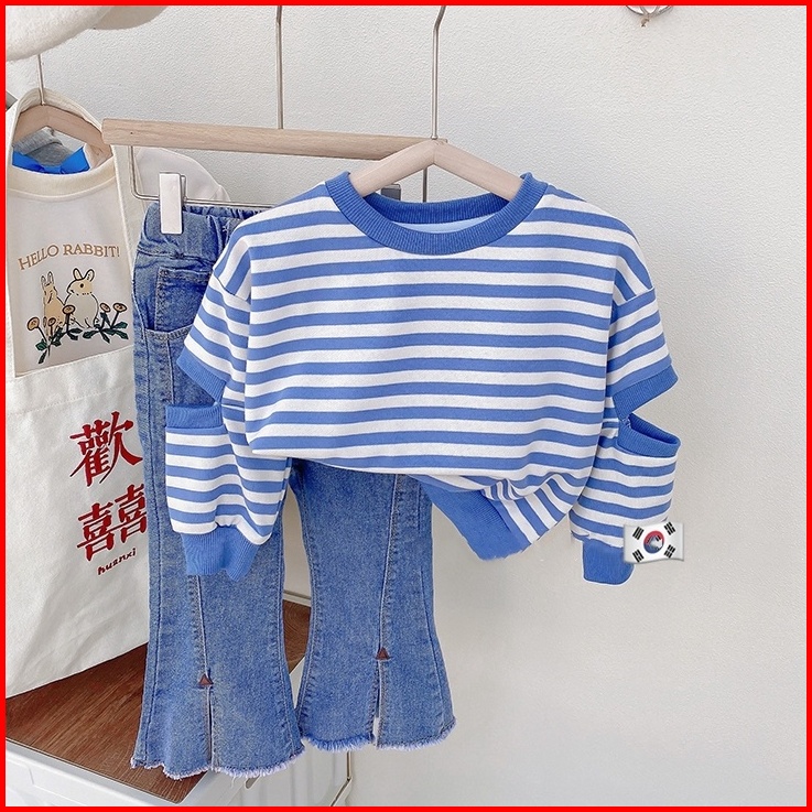 Kidsfo-95 Setelan Anak Cewek Perempuan Sweater Garis Biru Celana Panjang Jeans