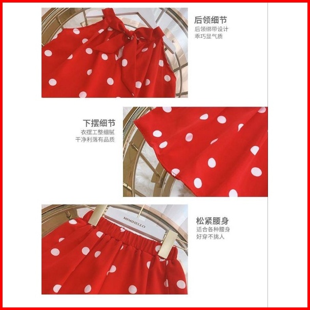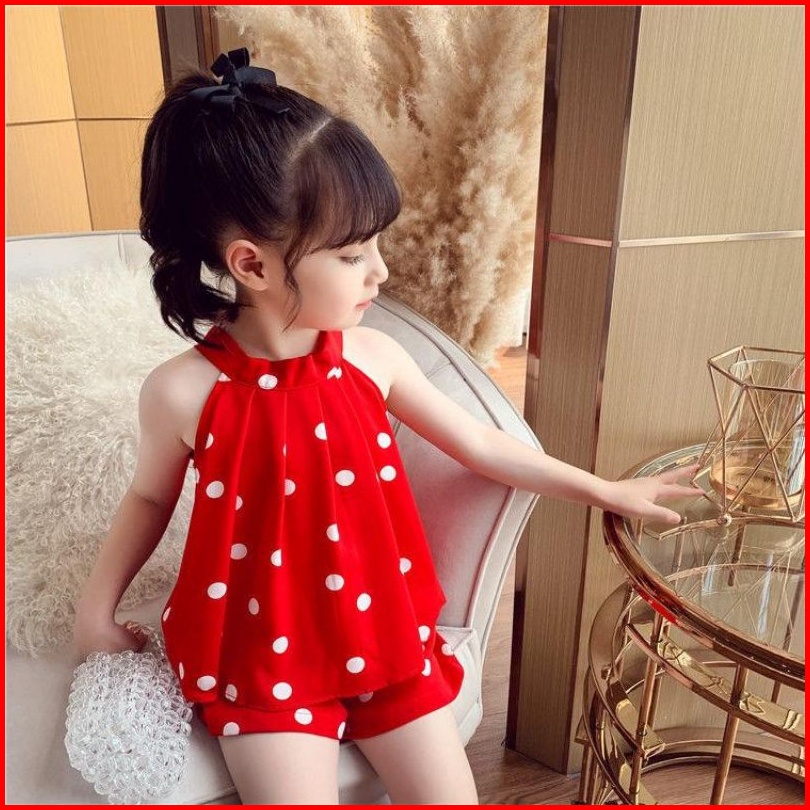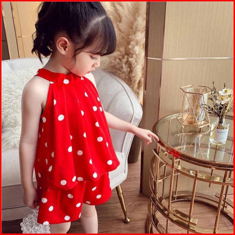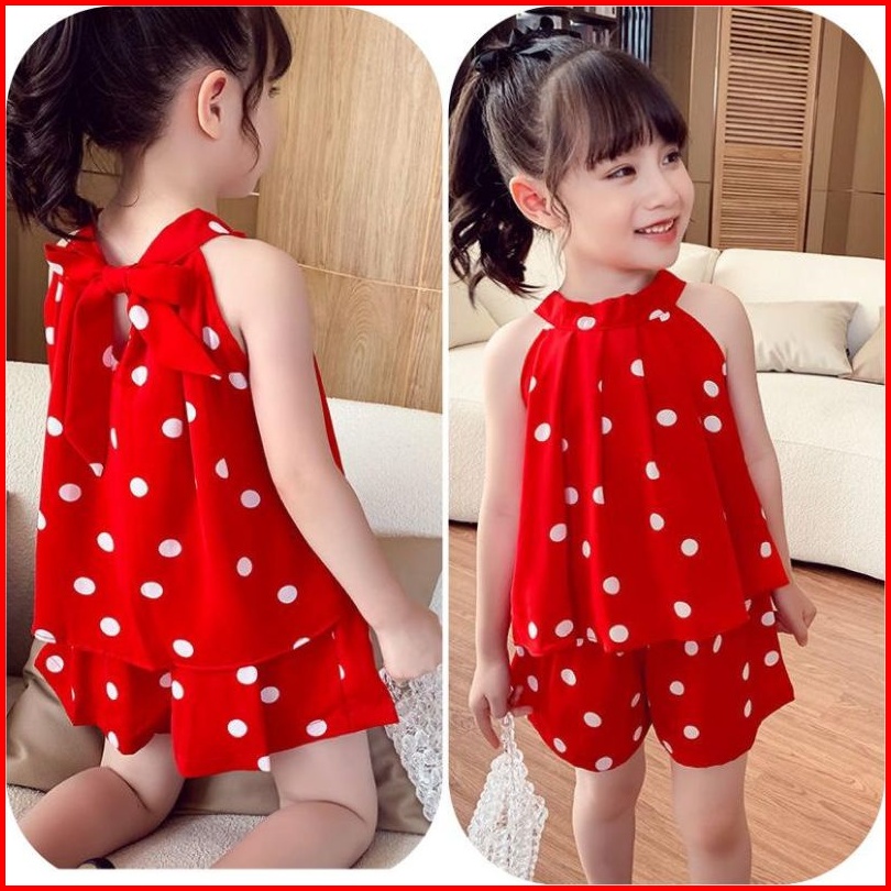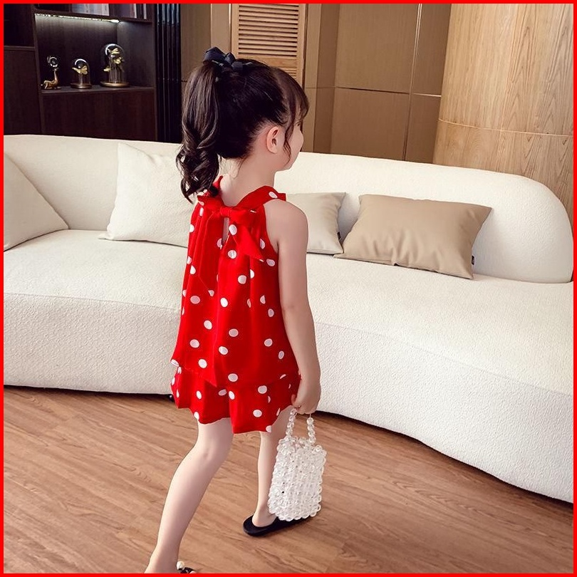 2-8 Tahun Js6-198 Setelan Anak Perempuan Polkadot Merah Tanpa Lengan