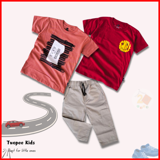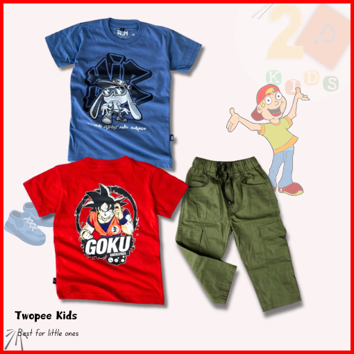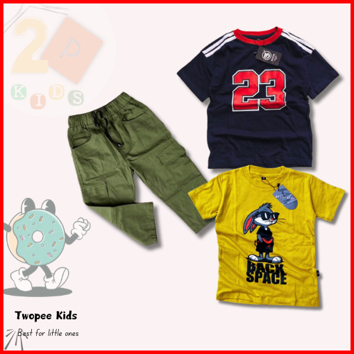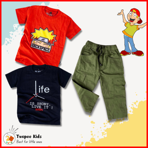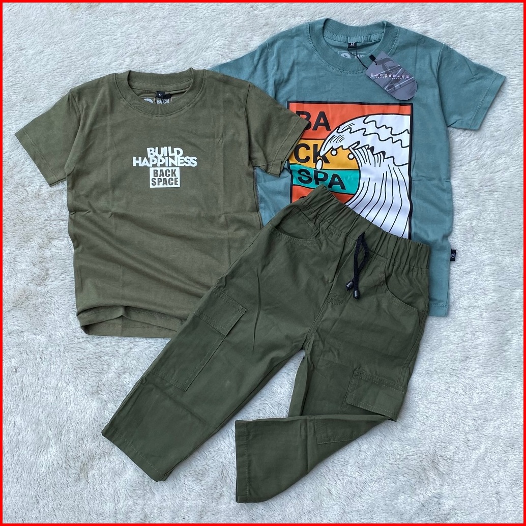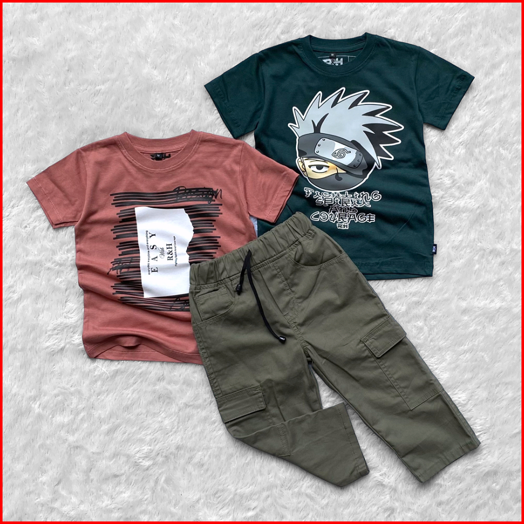 Paket Setelan Anak 3 Pcs 2 Kaos Dan 1 Cargo Panjang Army Bahan Katun Anak