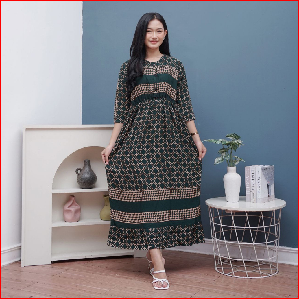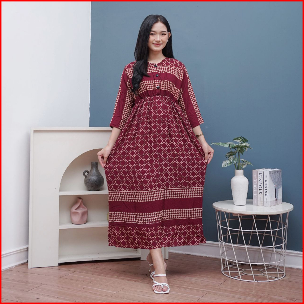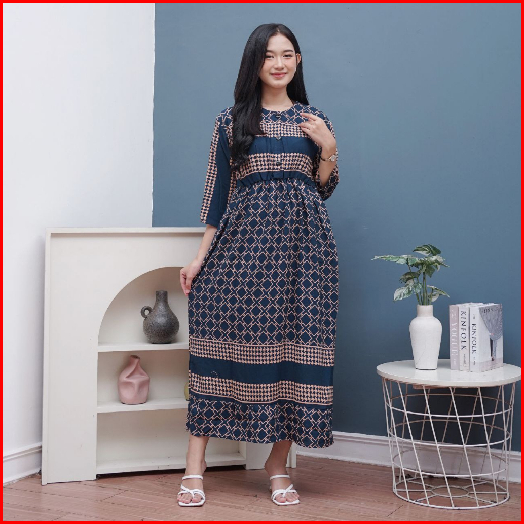 Daster Midi Dress Lengan Panjang Kekinian Kerut Dada Busui Rayon Premium