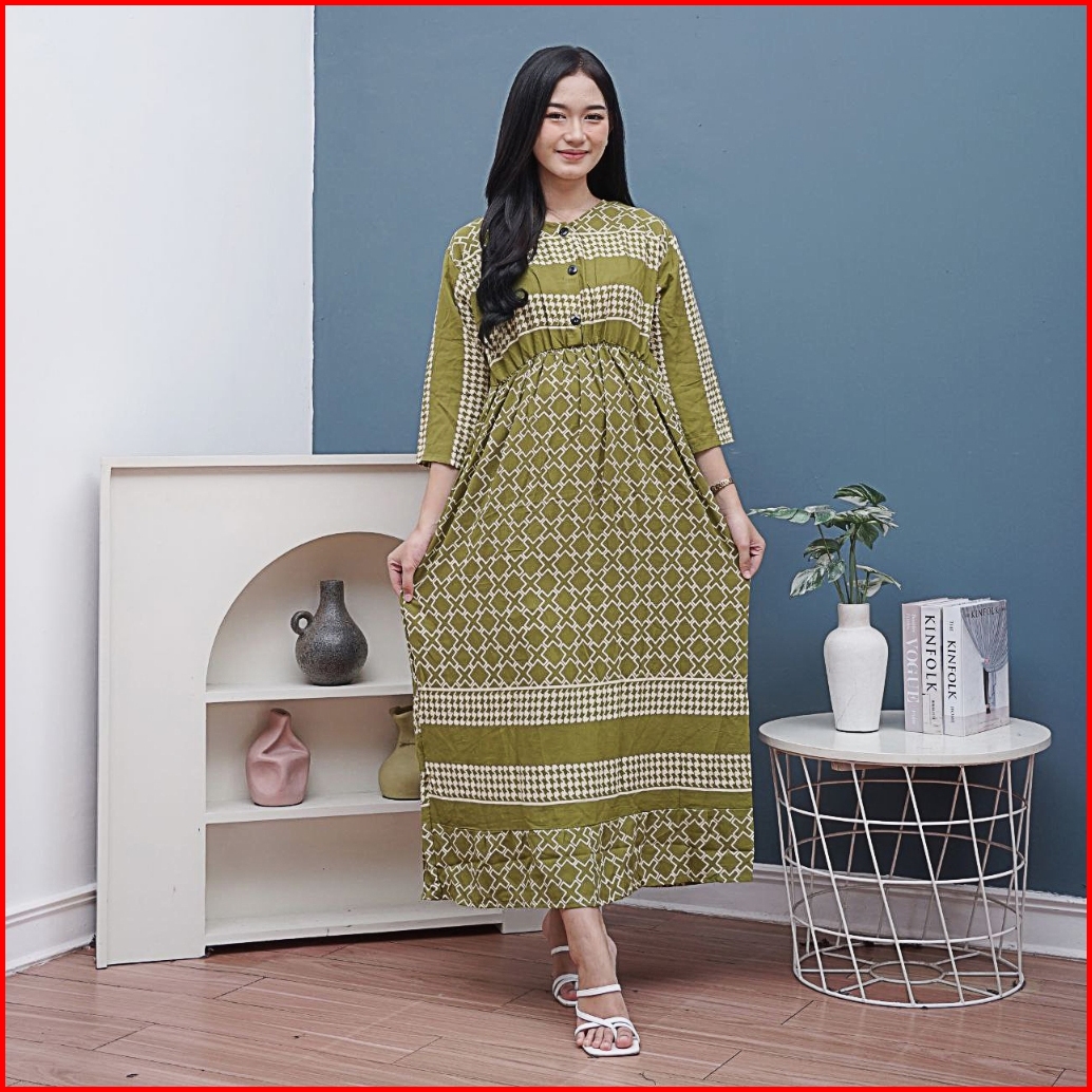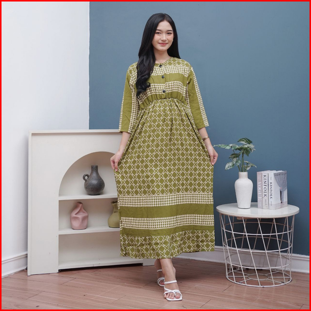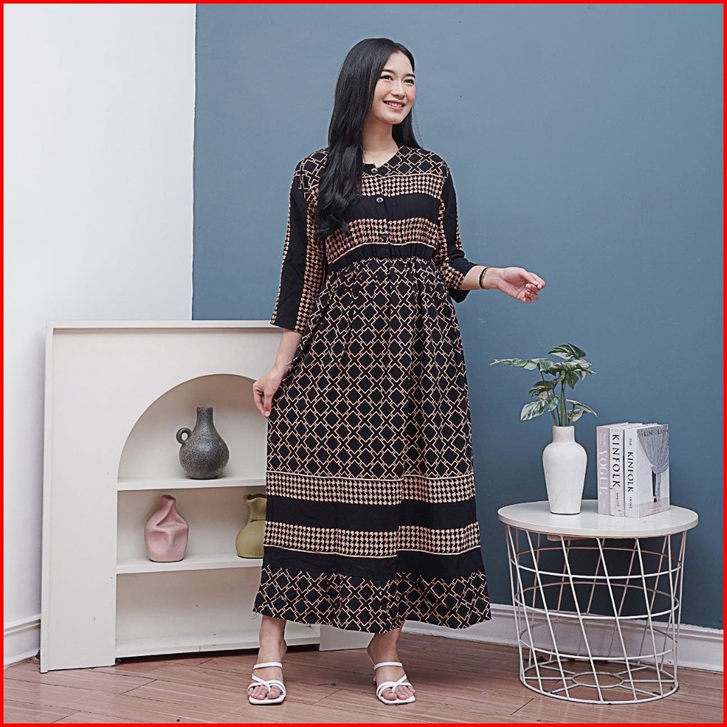 Daster Midi Dress Lengan Panjang Kekinian Kerut Dada Busui Rayon Premium