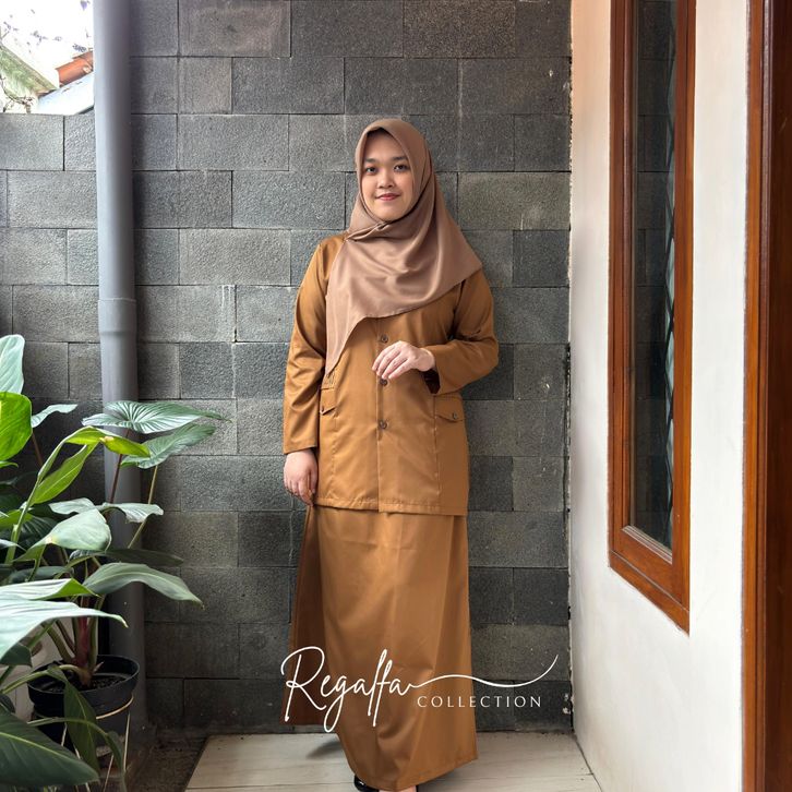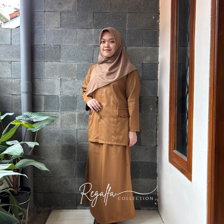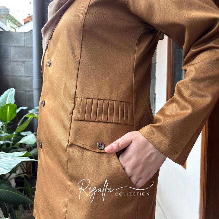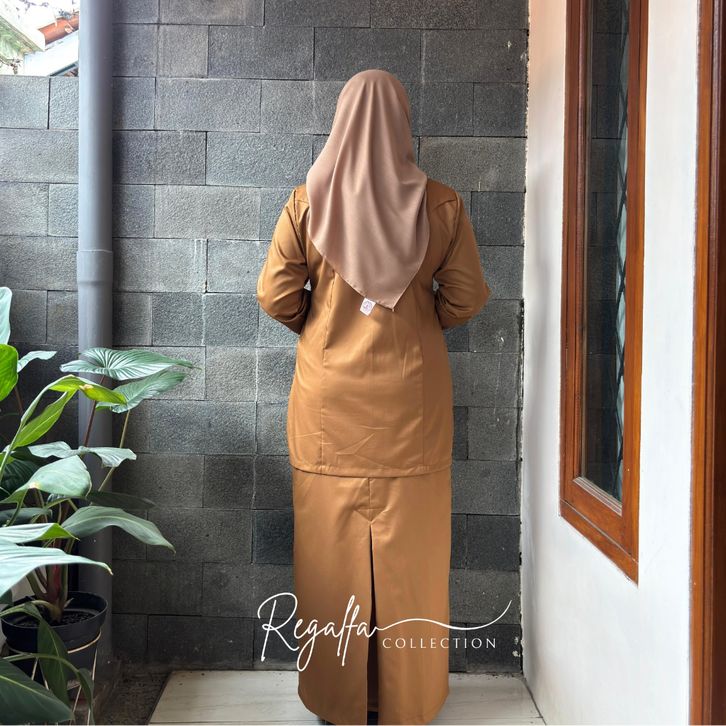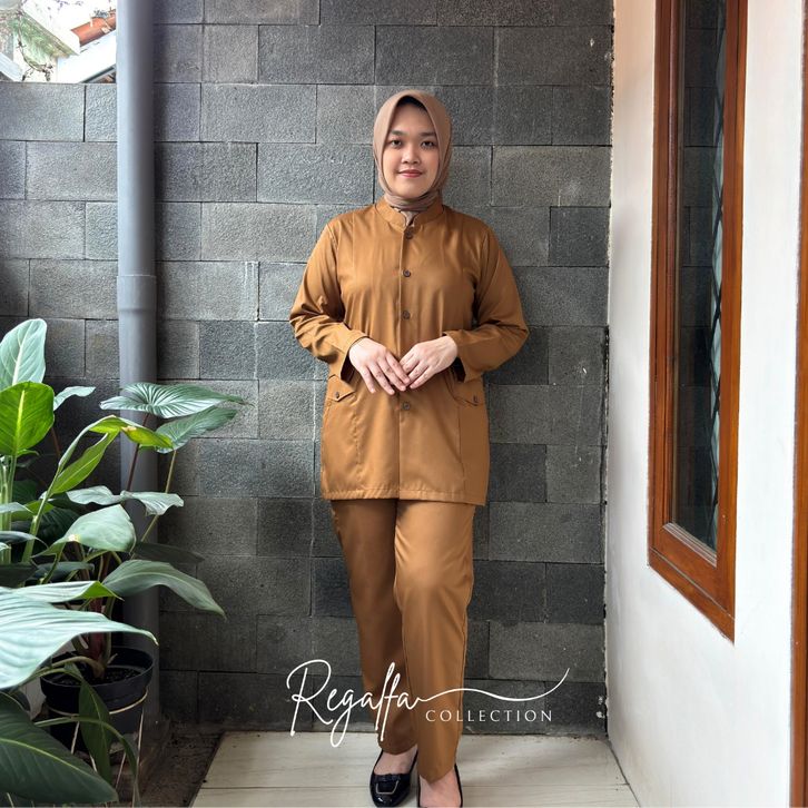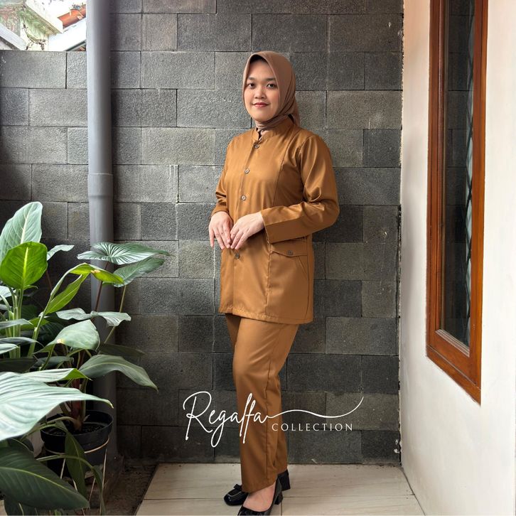 Setelan Baju PNS Pemda Khaki Tua Wanita Model Saku Rempel Set Seragam Dinas PDH Guru Terbaru