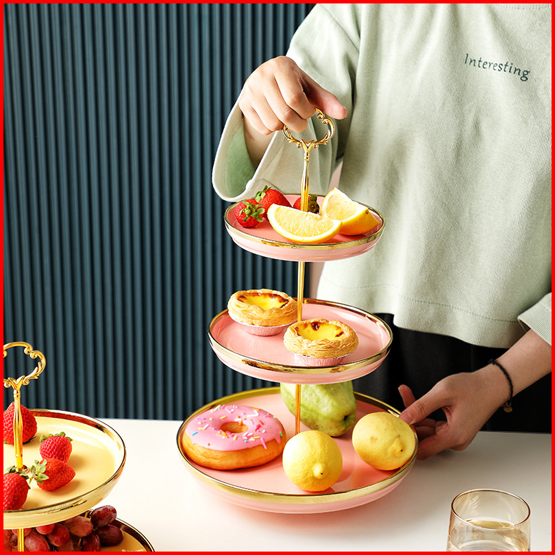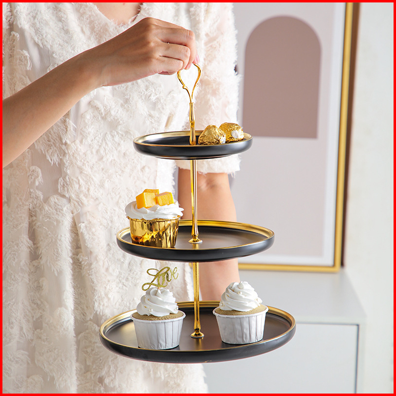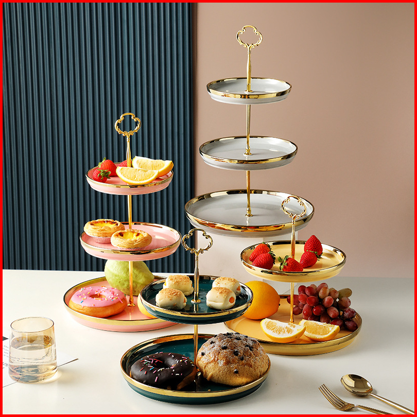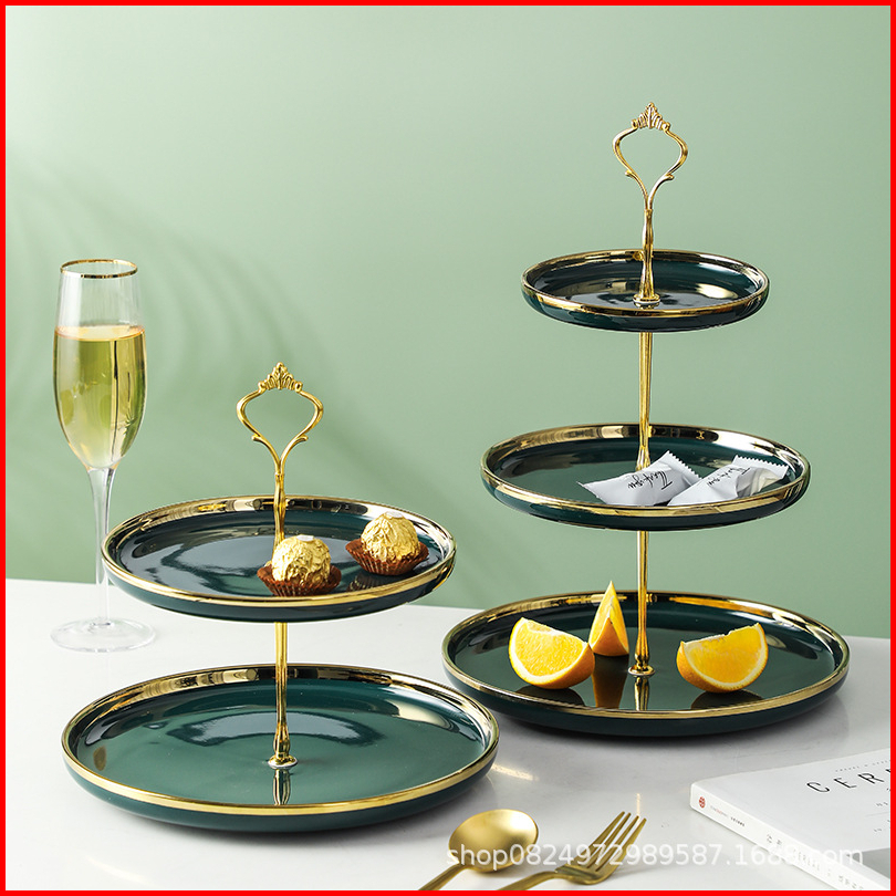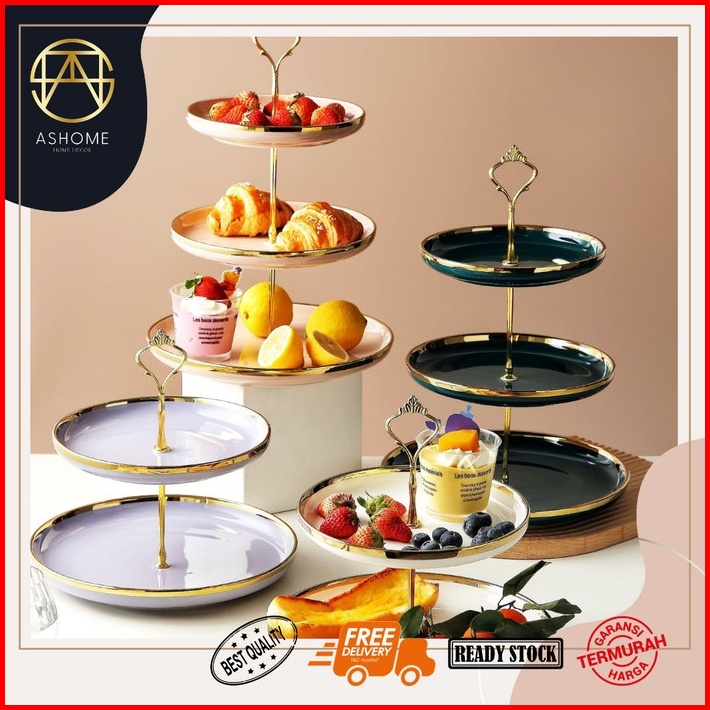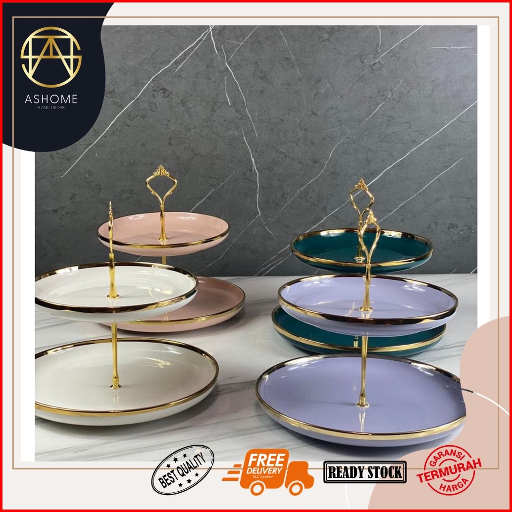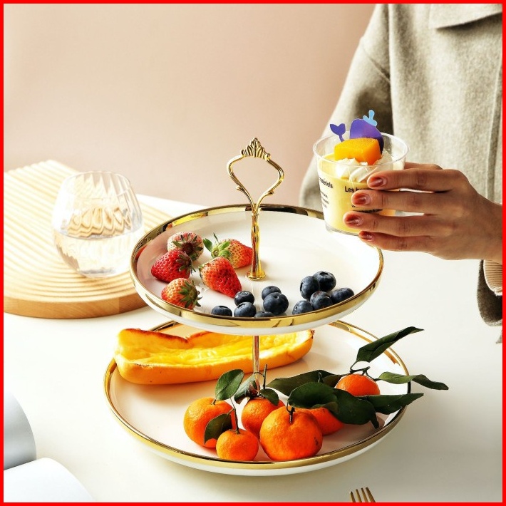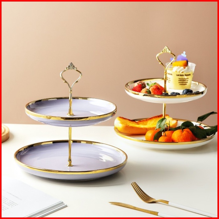 Ashome Piring Kue Tingkat Keramik List Double Layer Dessert Cake Piring Kue Tingkat Mewah Piring Kue Tingkat Elegan Piri
