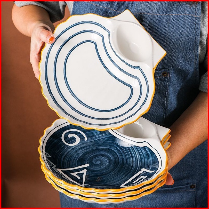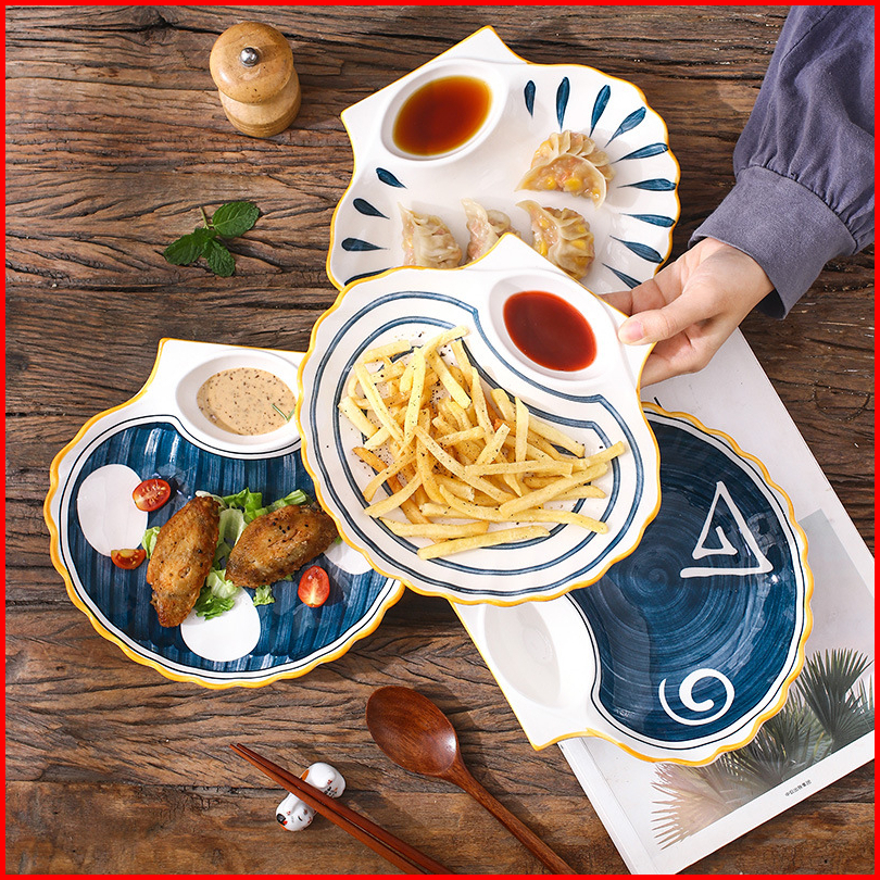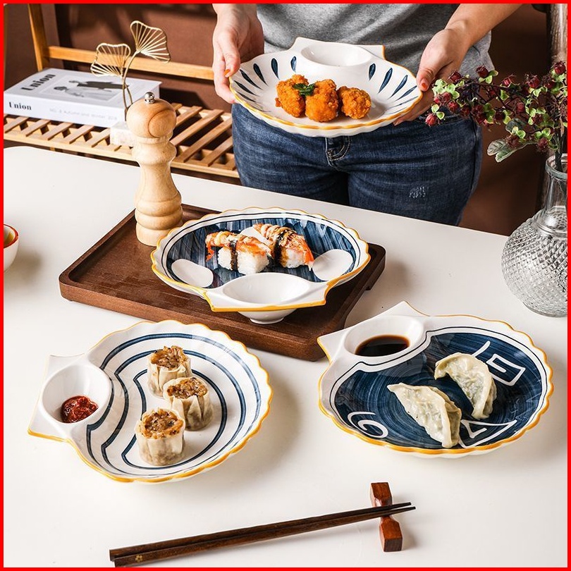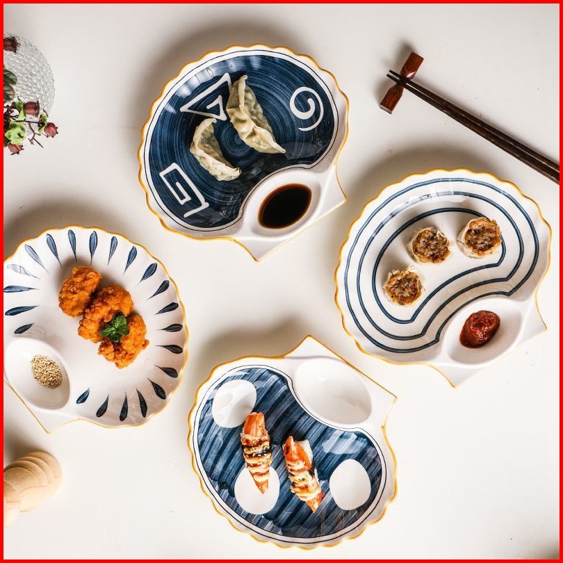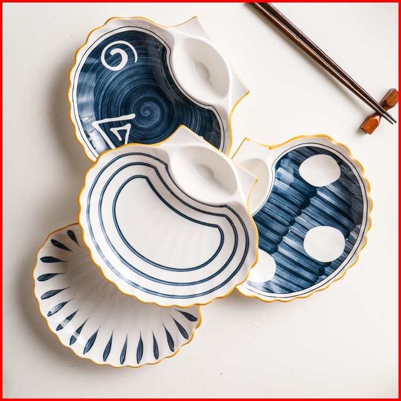 Ashome Piring Saji Keramik Bentuk Kerang Dengan Tempat Saos Motif Japan Piring Lauk Aestetik Piring Lauk Mewah Piring Sa