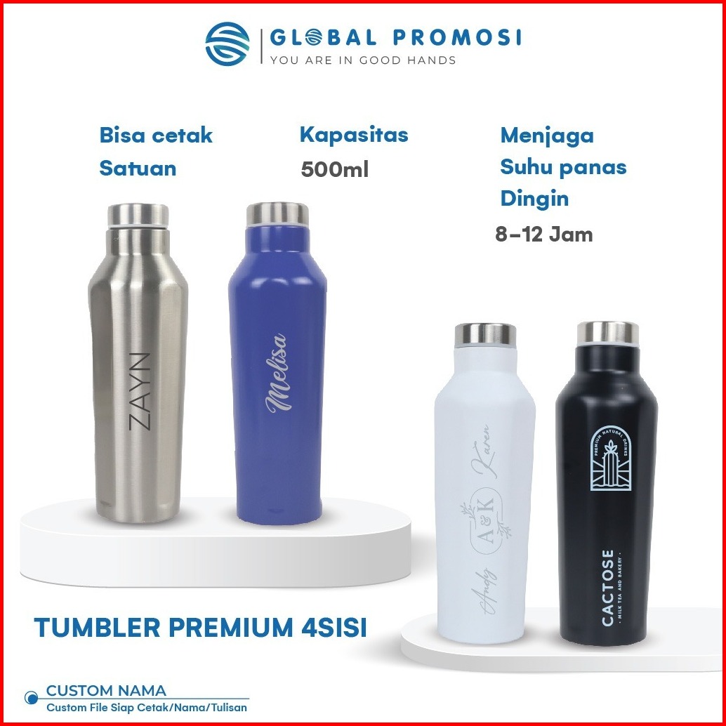 Custom Tumbler Premium 4 Sisi Datar 500ml Stainless Stell Laser Grafir Cetak Nama Logo Souvenir