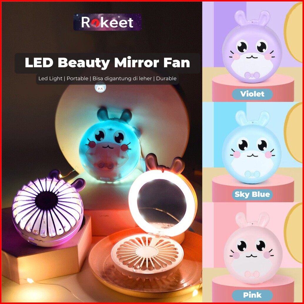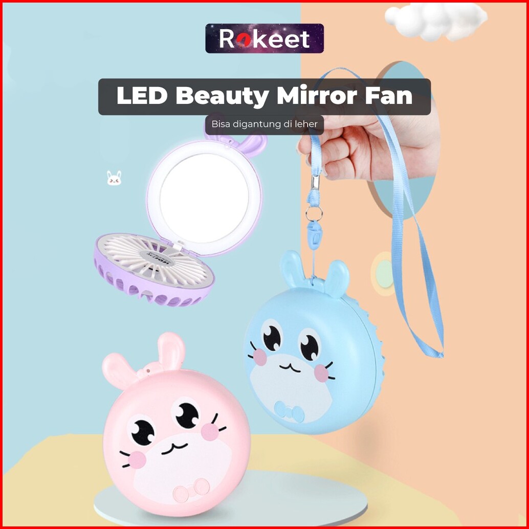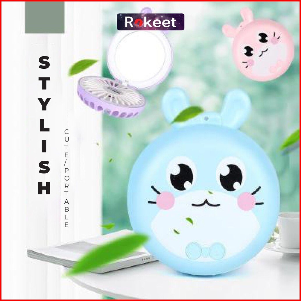 Rokeet Kipas Angin Portable Mini Fan Karakter Beauty Mirror Led Light Kaca Rias Lipat Murah 3in1