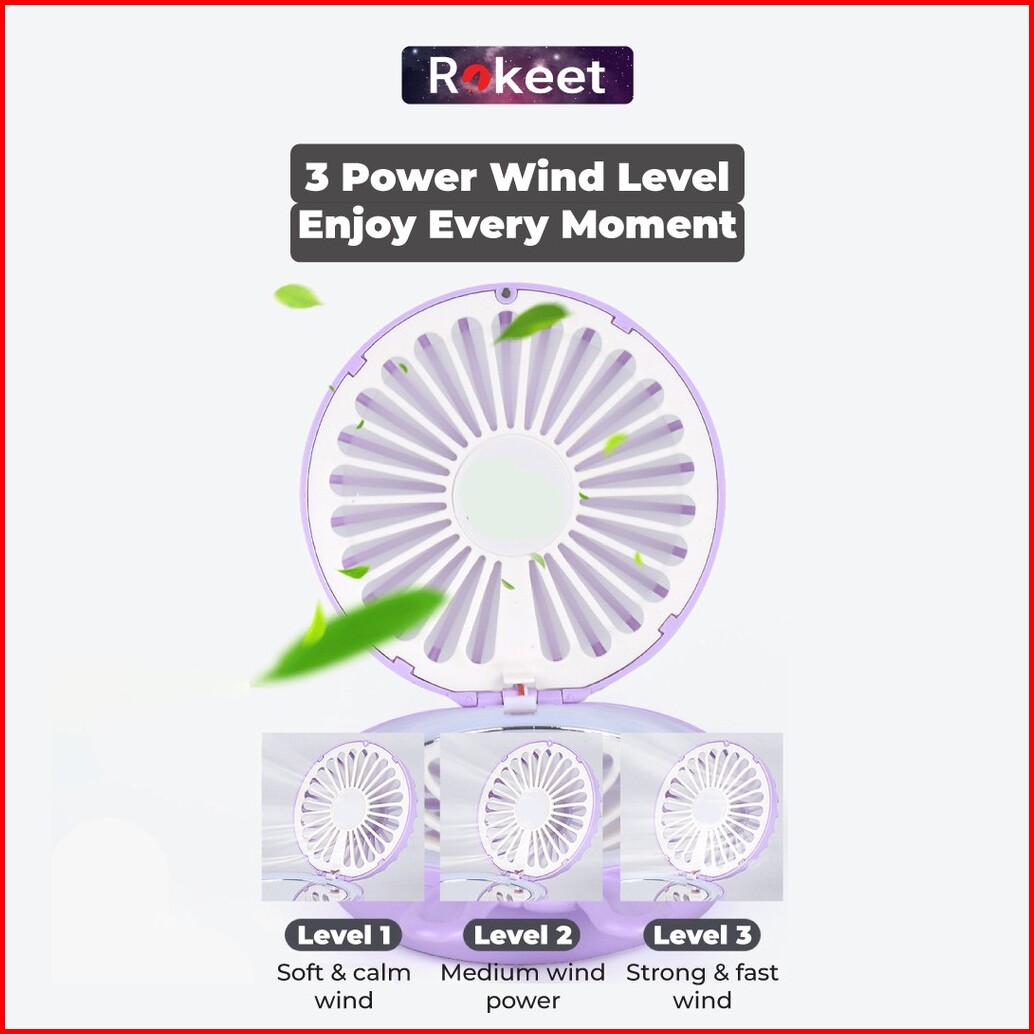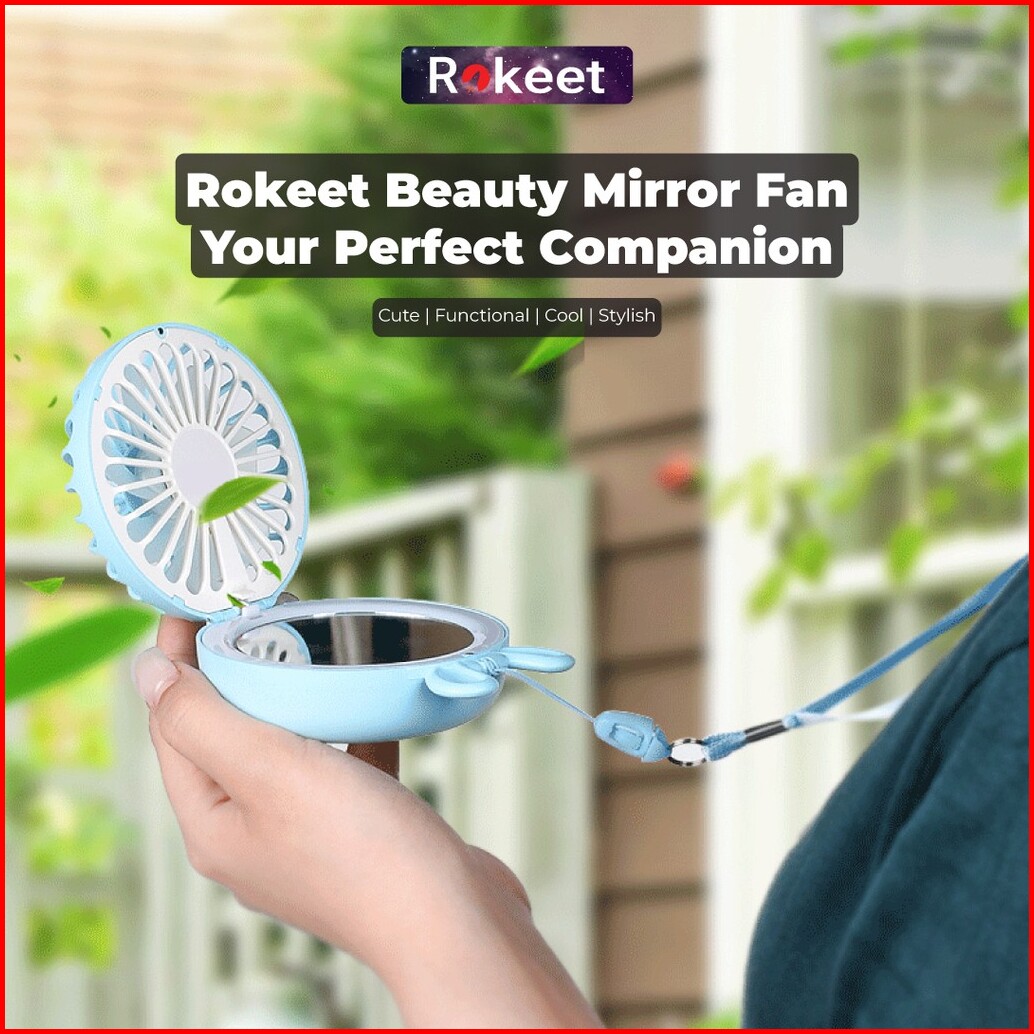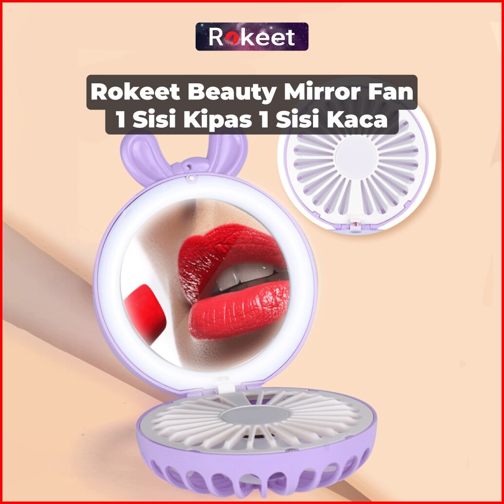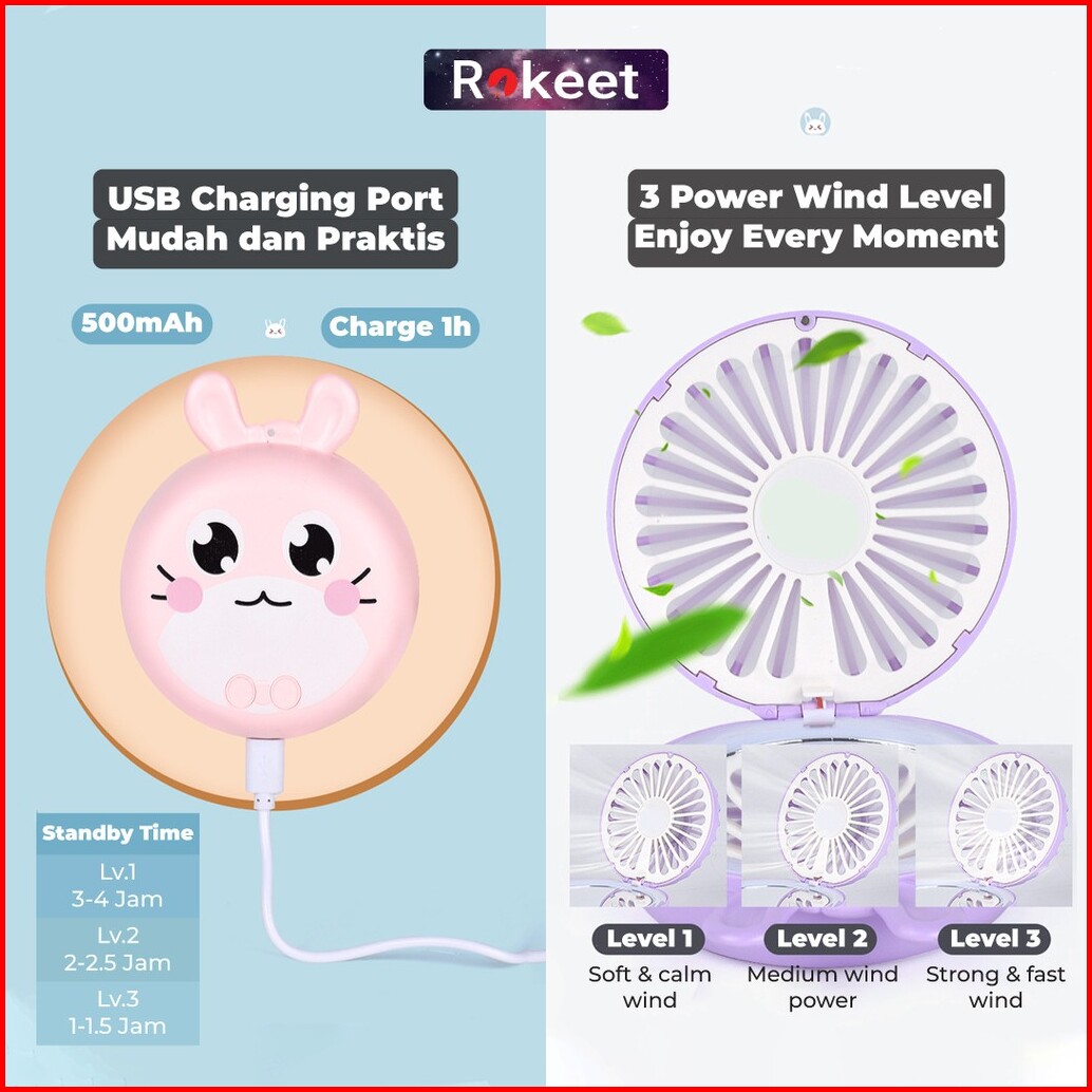Rokeet Kipas Angin Portable Mini Fan Karakter Beauty Mirror Led Light Kaca Rias Lipat Murah 3in1