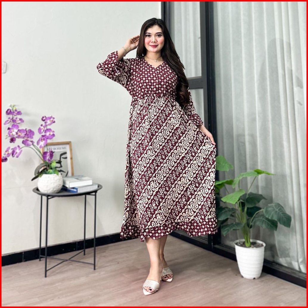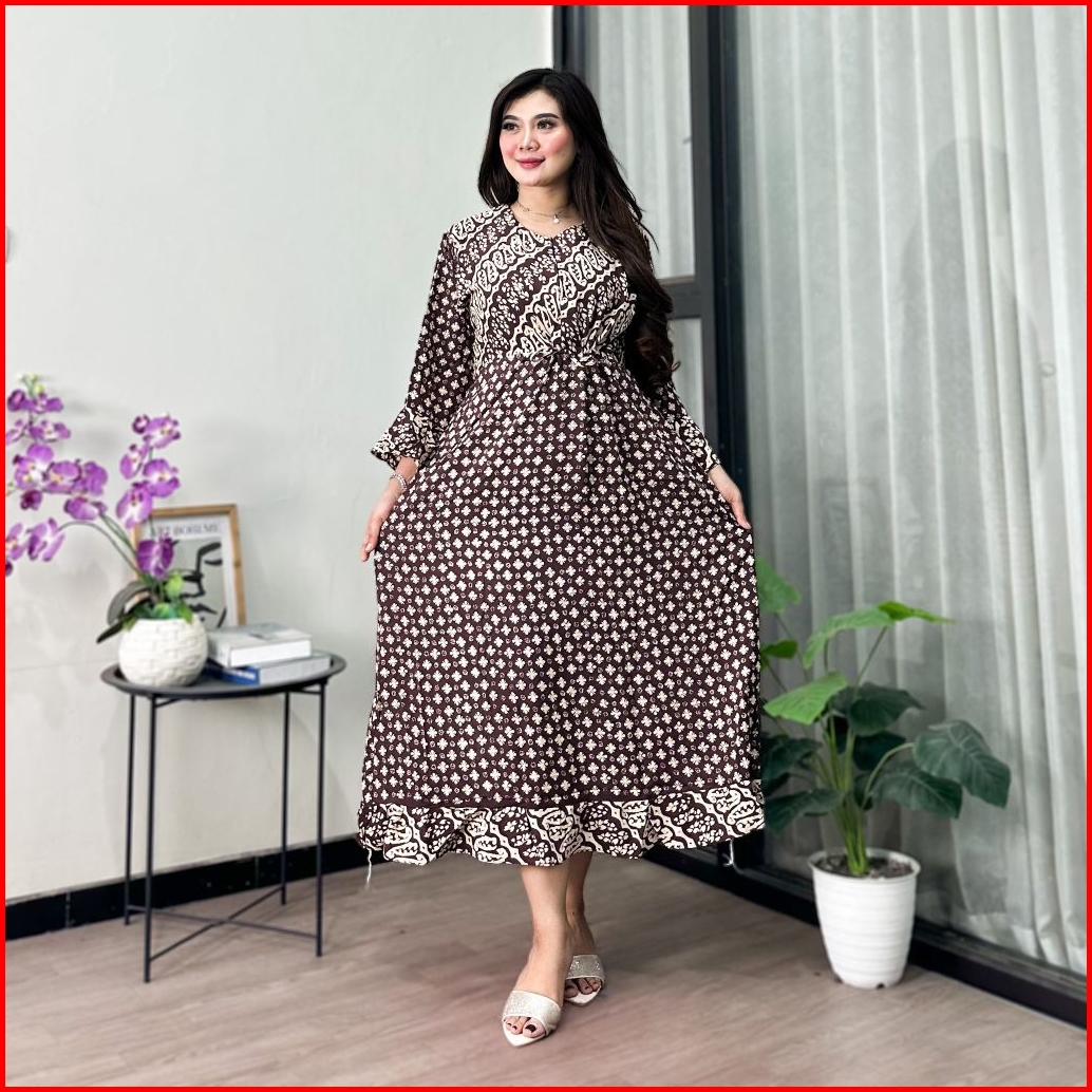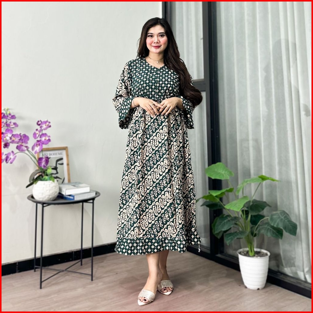 Dress Batik Rayon Santung Tebal Daster Panjang Resleting Depan Tali Serut Lengan 3 4