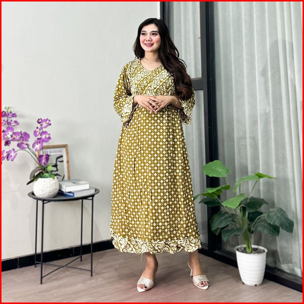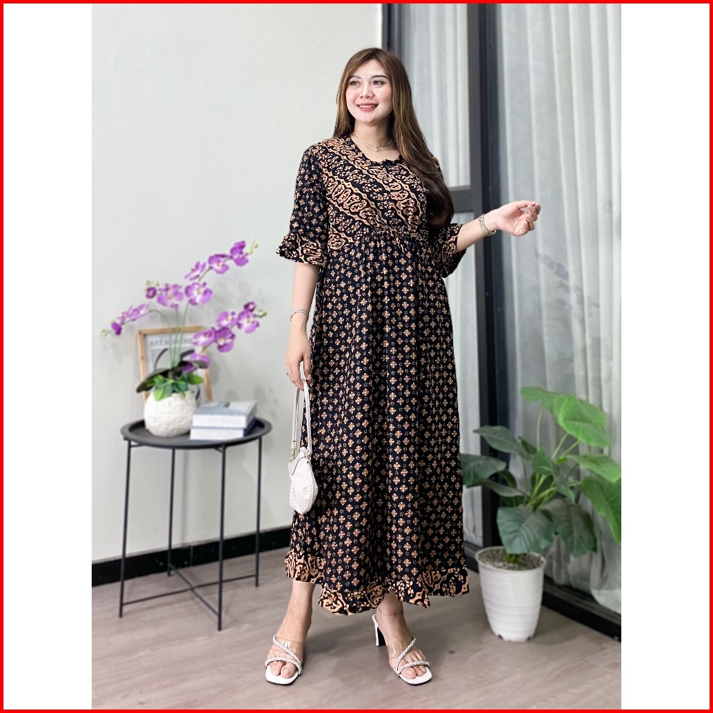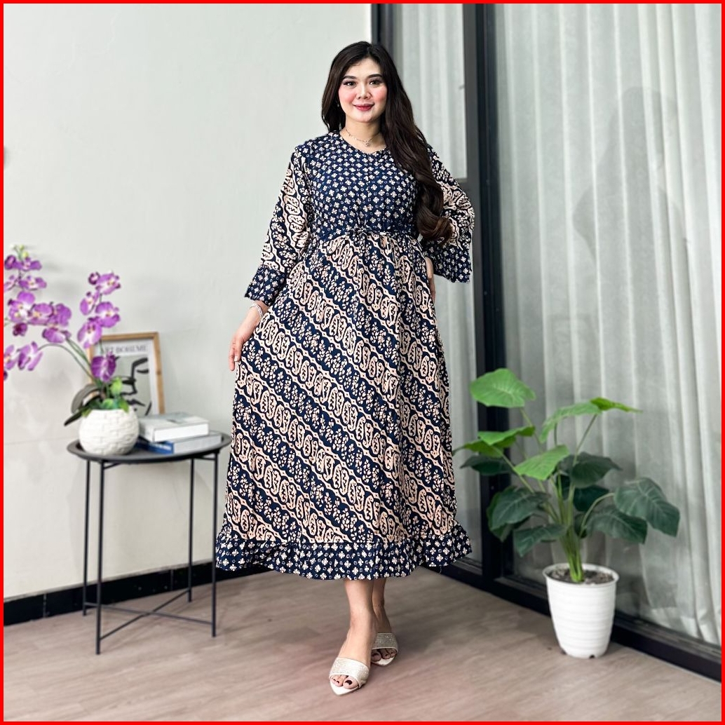 Dress Batik Rayon Santung Tebal Daster Panjang Resleting Depan Tali Serut Lengan 3 4
