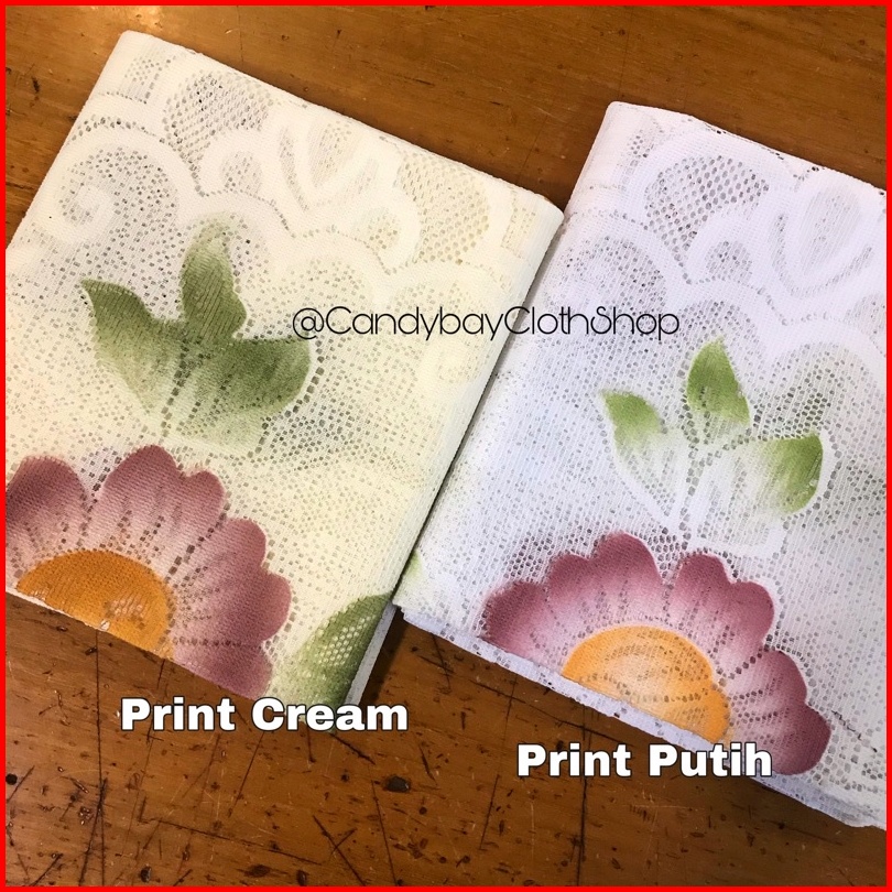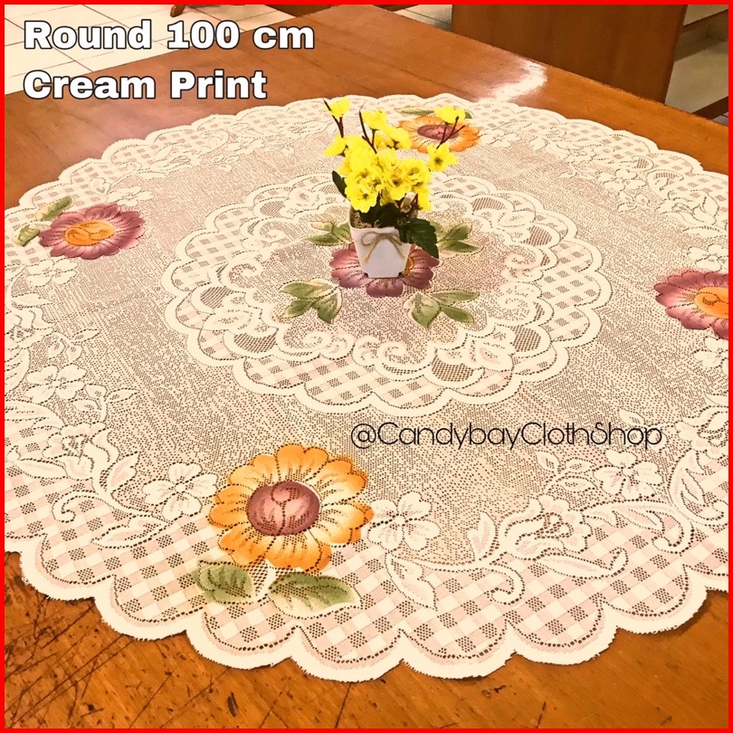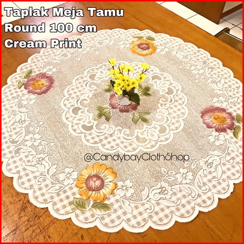 Taplak Meja Tamu Cantik Bundar Warna Print Cream Uk Diameter 100 Cm Bahan Kain Polyester Corak Bunga Mahkota