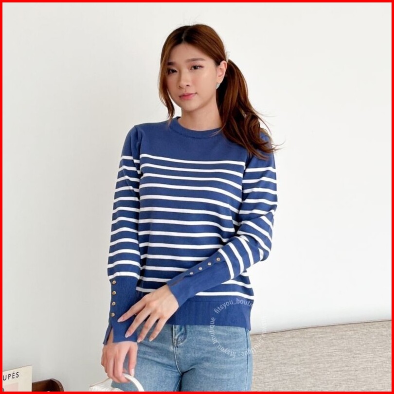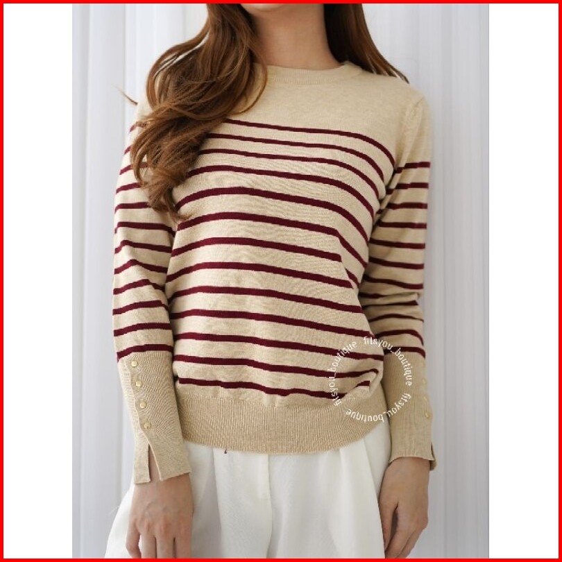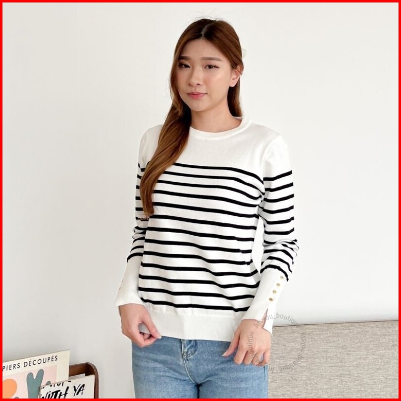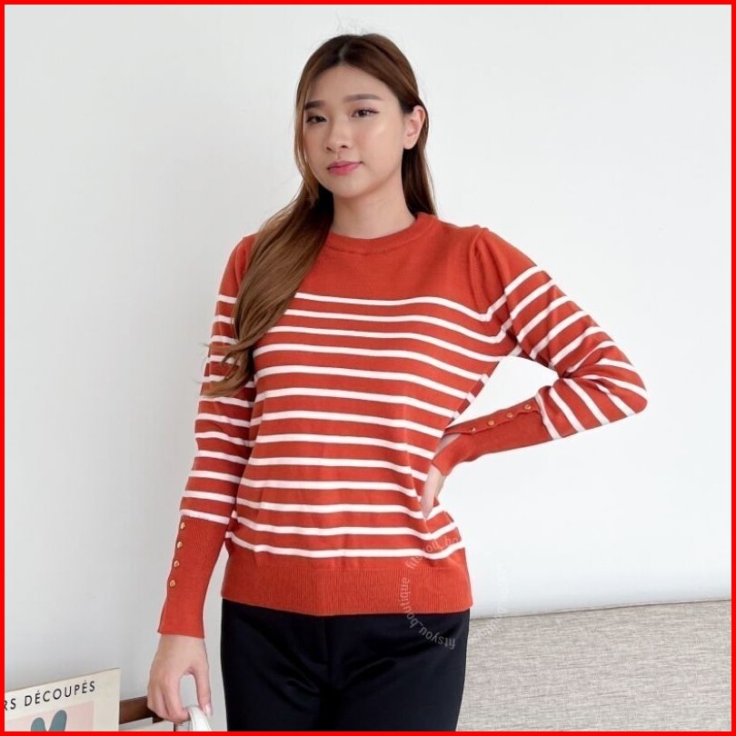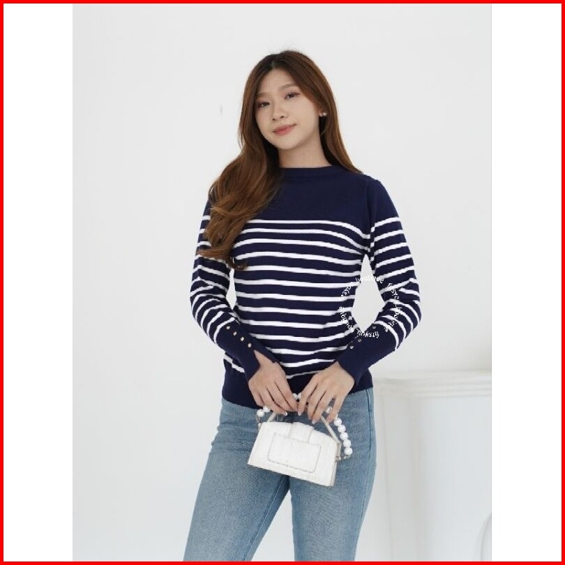 Nara Knit Top Atasan Rajut Katun Halus Adem Tangan Panjang Stripe Hijab Friendly Sweater Cewe Baju Inara