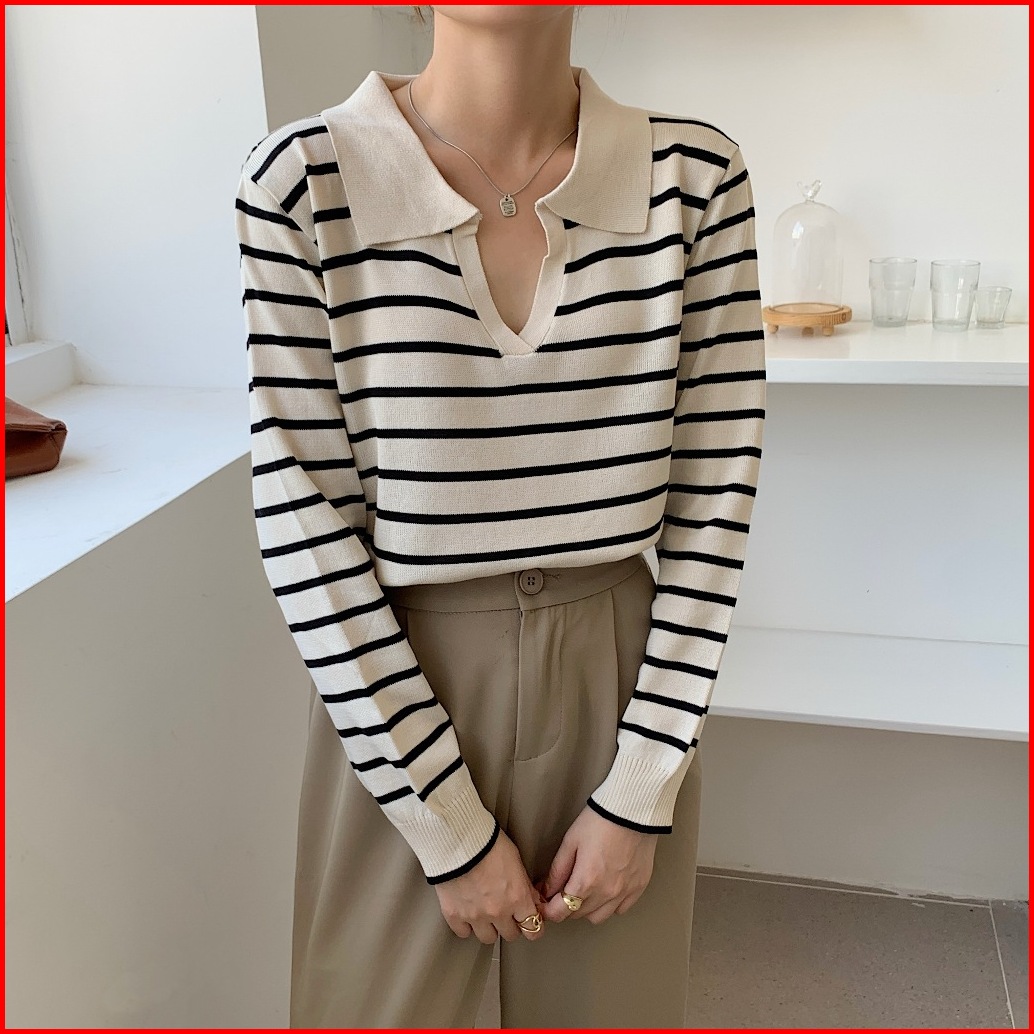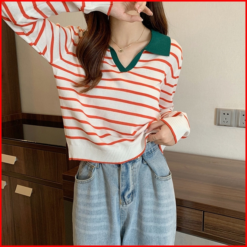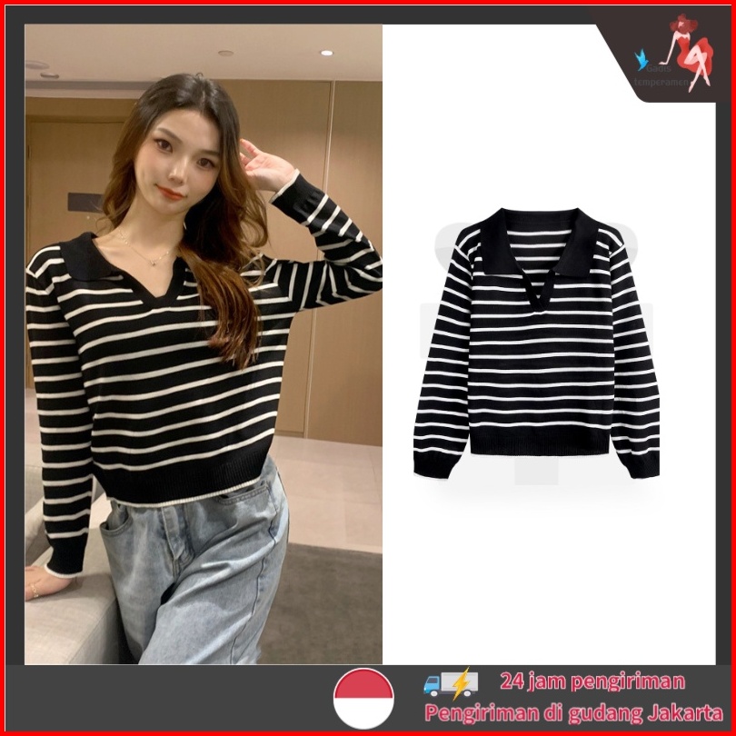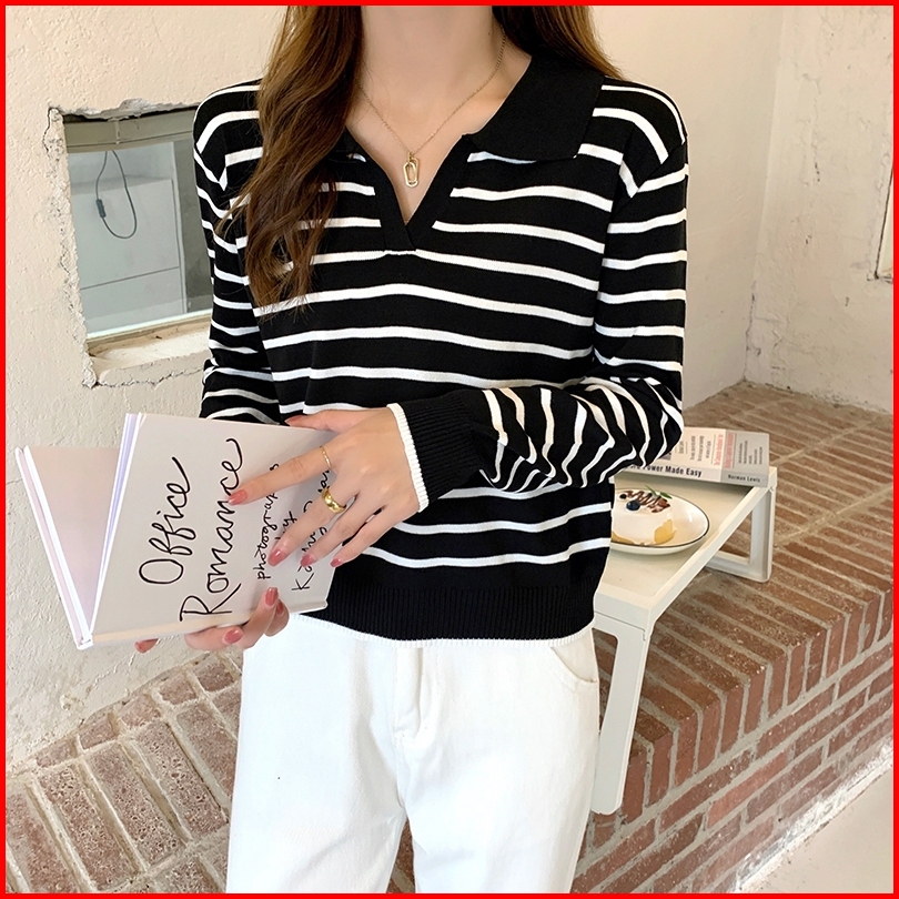 Karley - Kaos Rajut Stripe Atasan Wanita Rajut Korean Style Lengan Panjang Wanita Kaos Garis Garis Wanita