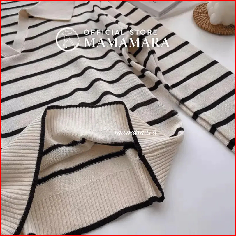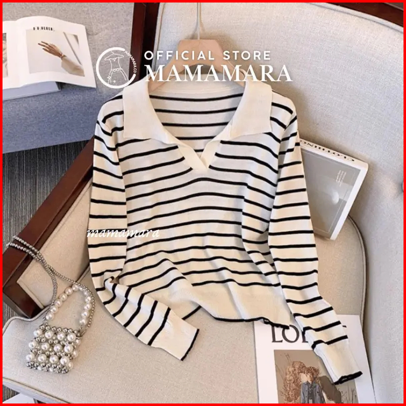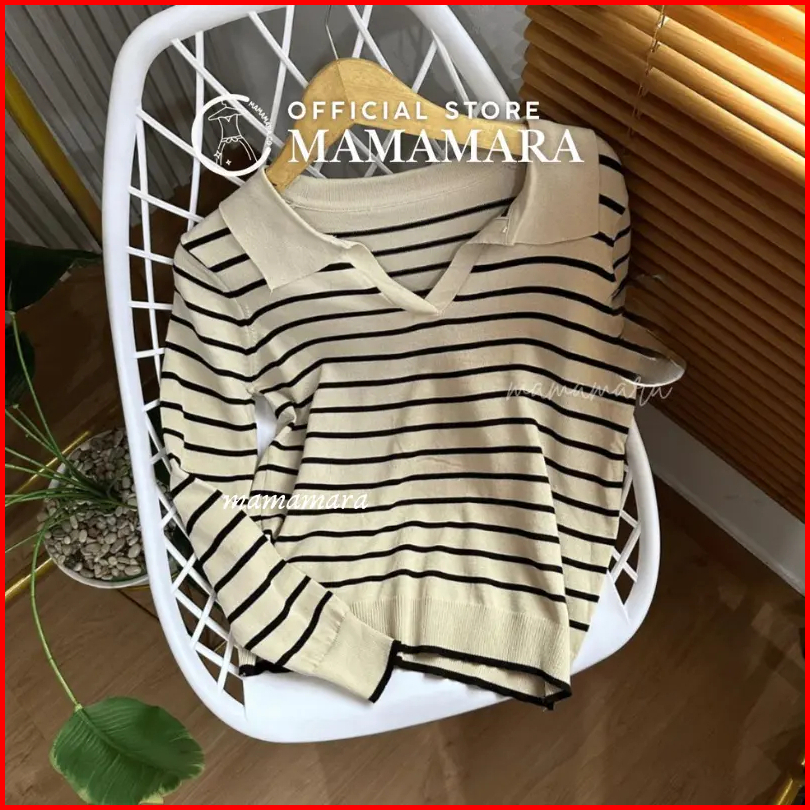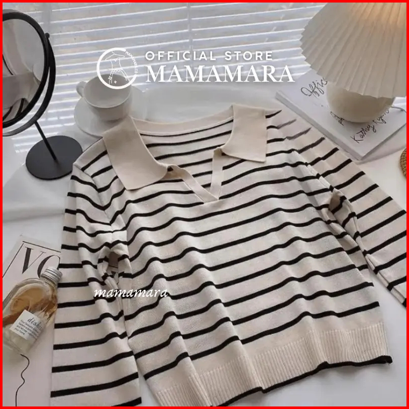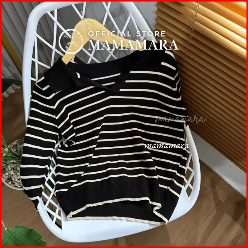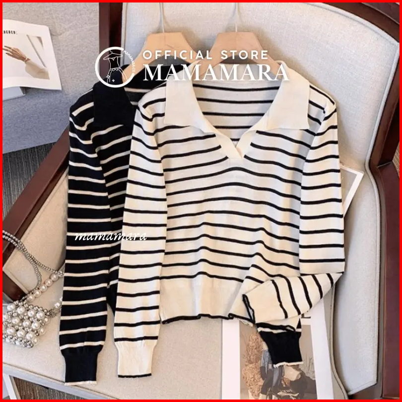 Mamamara - Knitwear Sweater Crop Top Rajut Bergaris Lengan Panjang Putih Wanita Atasan