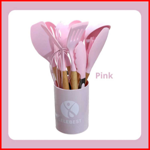 Cece Silicone Utensil 11pcs Wadah Spatula Peralatan Masak Sutil Pegangan Kayu Baking Set Alat Masak