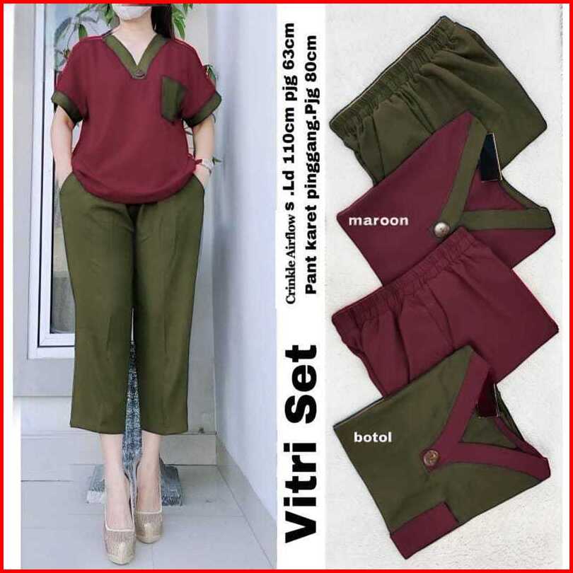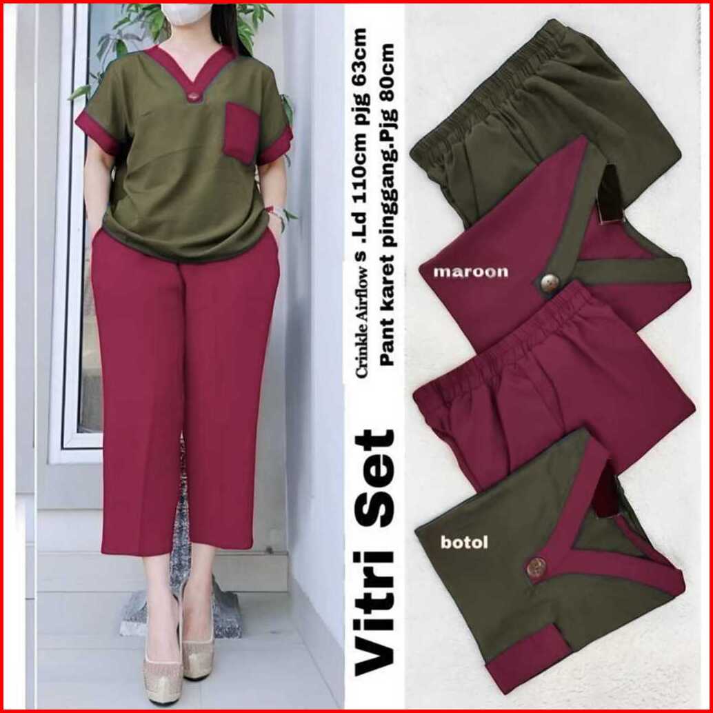 Vitri Set Kombinasi Crinkle Airflow Ld 110 Setelan Lengan Pendek One Set Polos Kombinasi Setelan Baju Tidur Setelan Ootd